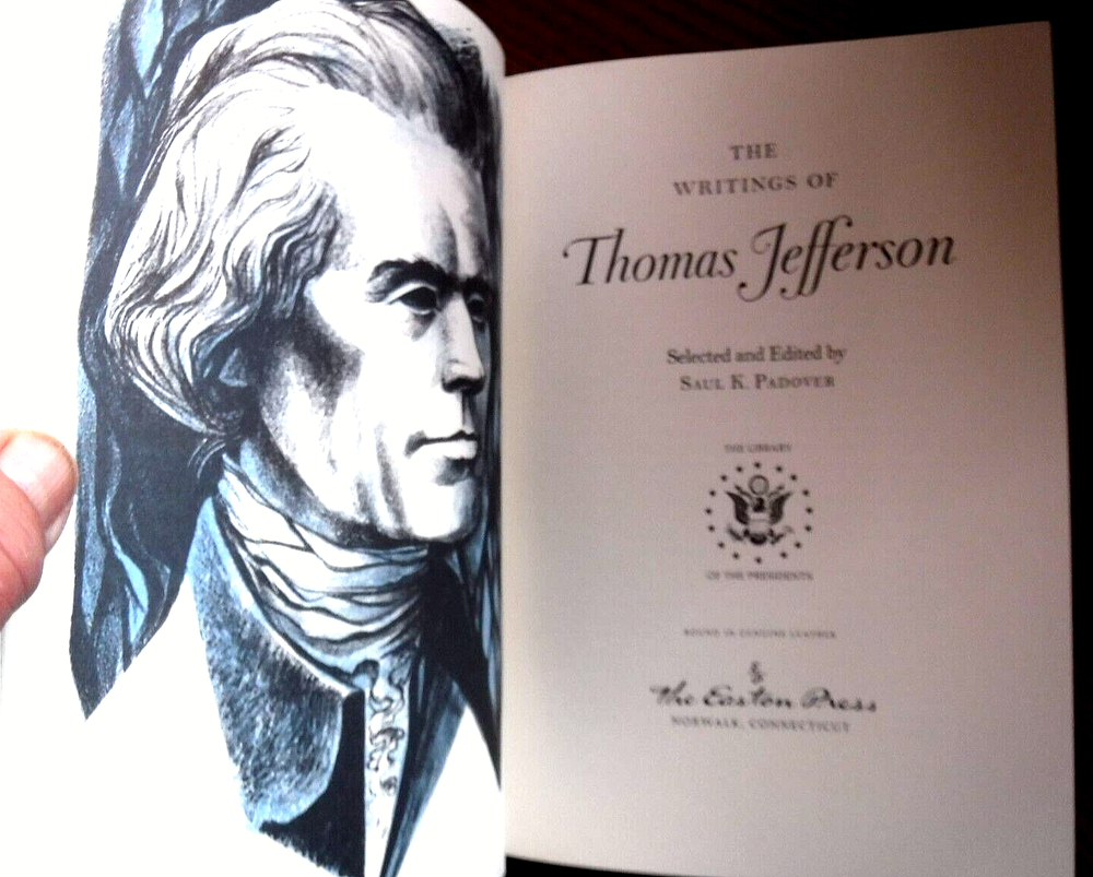 This collector's edition of THE WRITINGS OF THOMAS JEFFERSON from Easton Press is a must-have for any political reference library. The book features deluxe leather binding, gilt edging, and is part of the Library of Presidents series. The author, Thomas Jefferson, is known for his contributions to American history, particularly in the area of politics. This rare piece is a great addition to any book collection and is sure to impress. 3