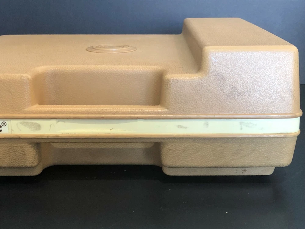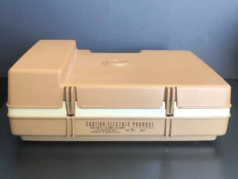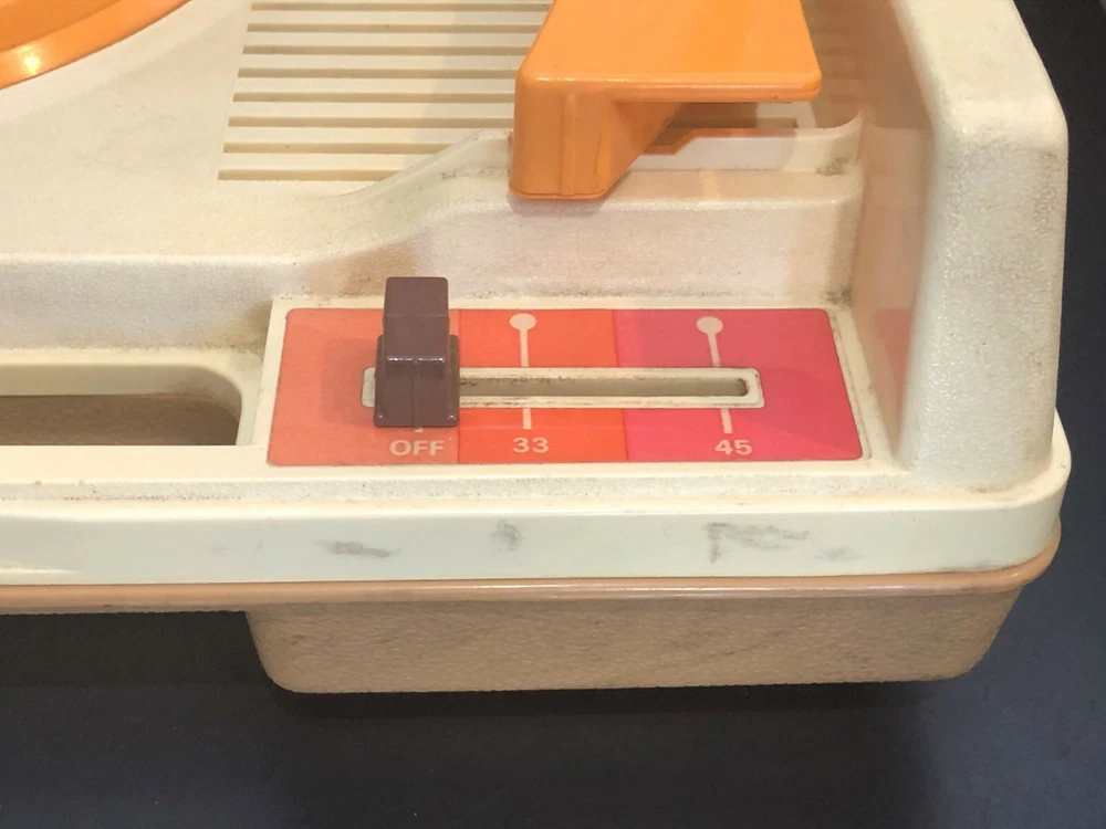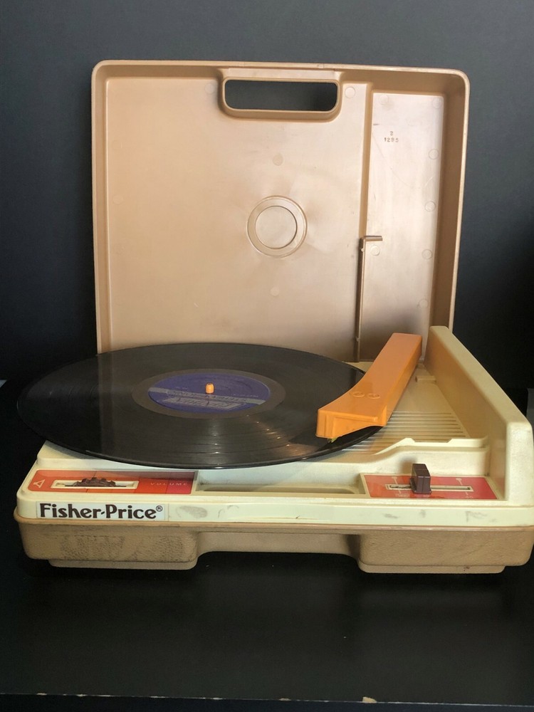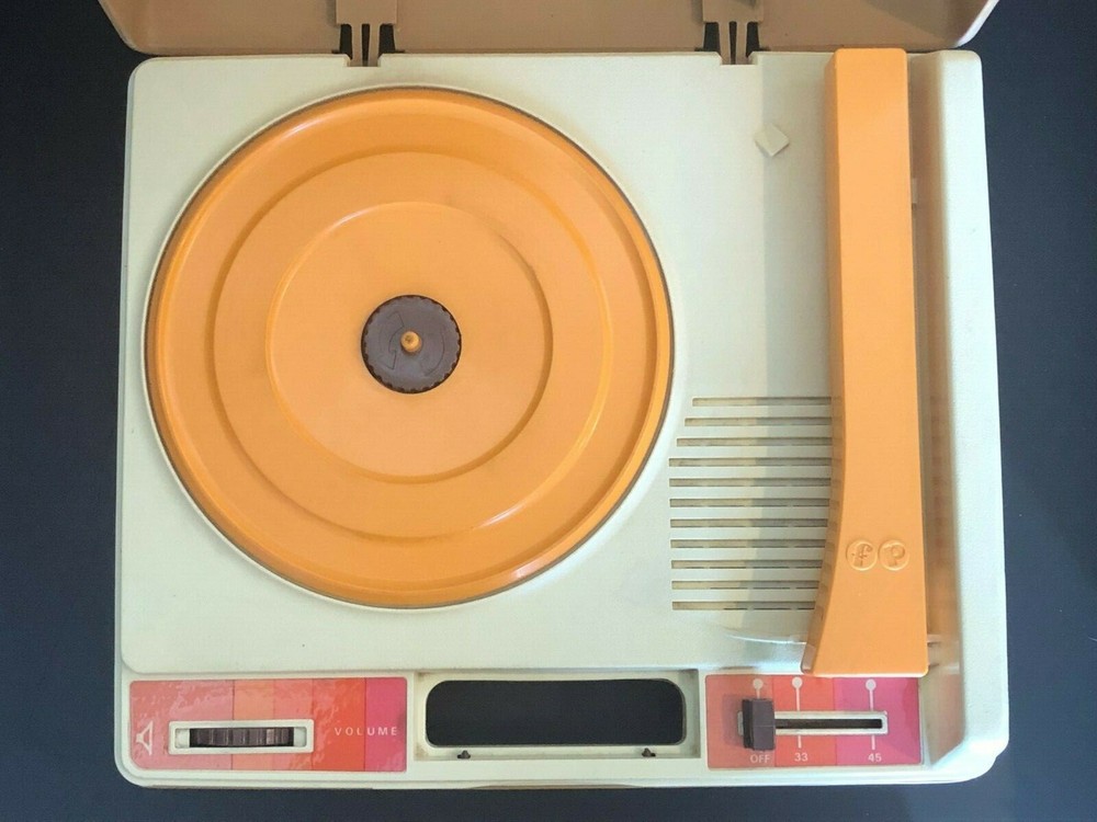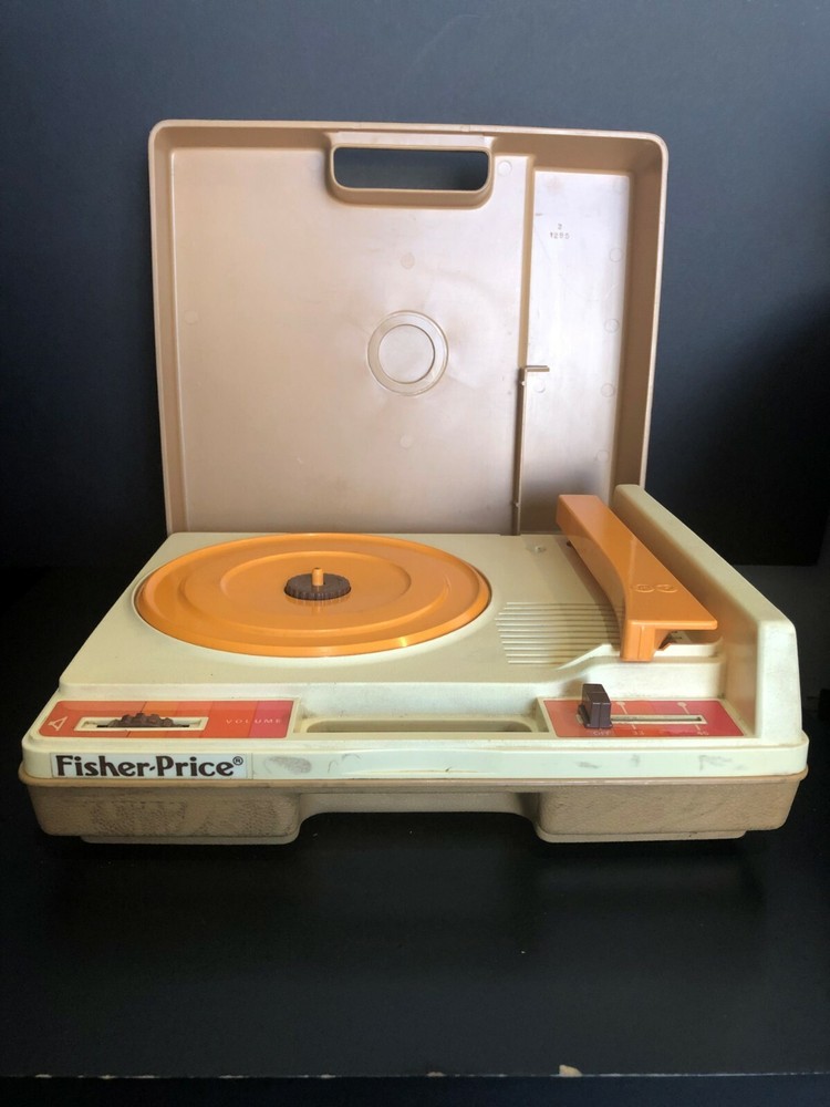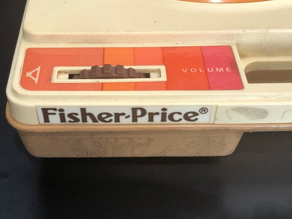 Vintage Fisher-Price Record Player. Tested & WORKS but the volume does not increase or decrease. Plays only at a low volume. In Hardshell Case. Plays 33 & 45 Records. Pre-owned. Has scuff marks and staining especially on the top on both sides of the handle. Has orange colored turntable and needle handle. Has both stickers. You pull up on the brown middle piece to play 45s and push it down to play 33s. Case measures approximately 13” L x 11” W x 5” H (highest part). Please see all photos for further condition details as they are also part of the description. Sold as is.