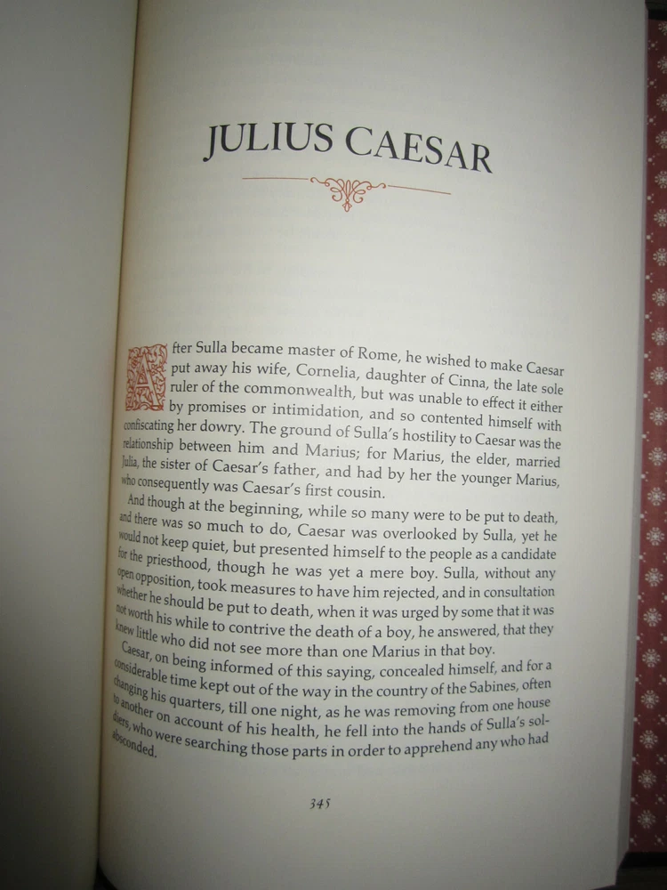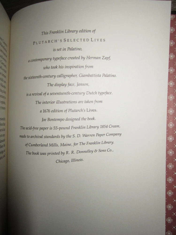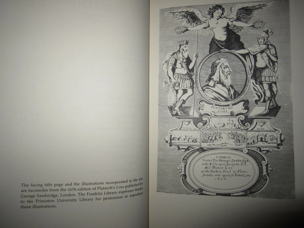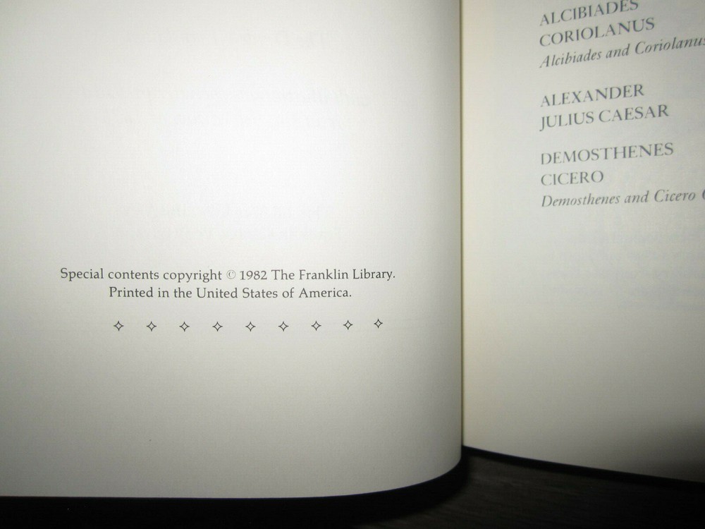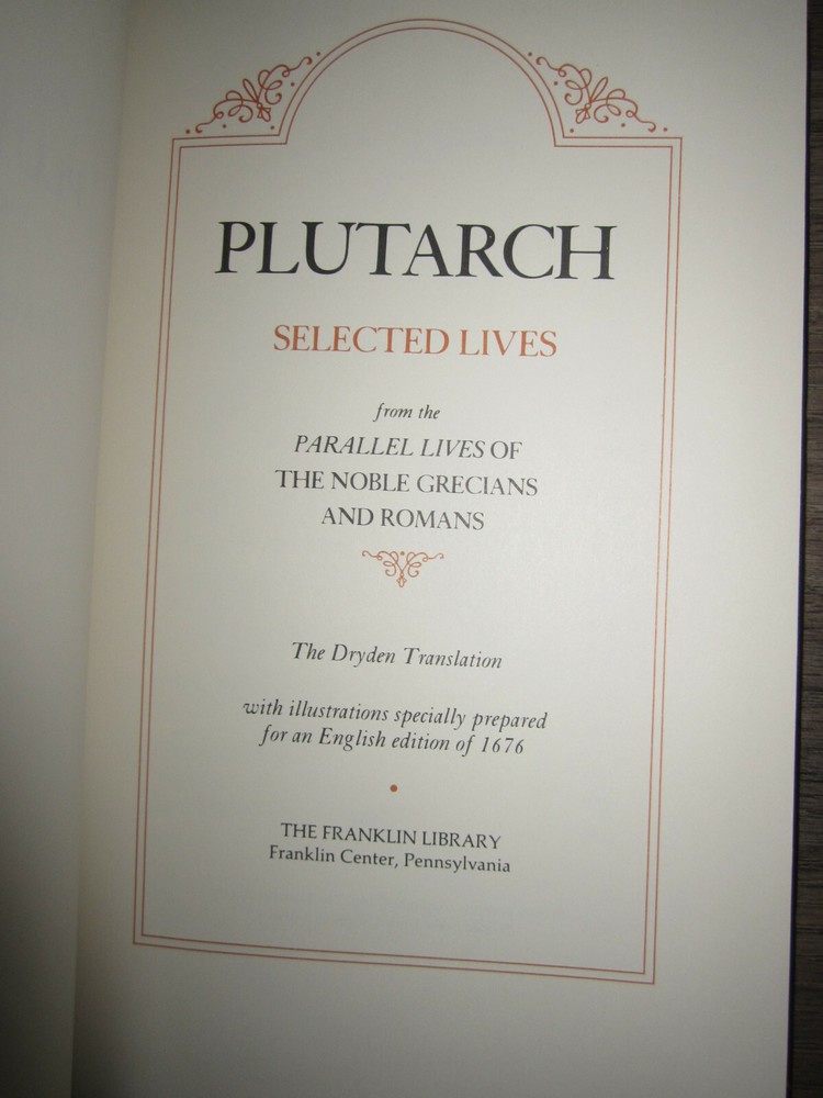Vintage leather-bound book with gilt decoration & page edges, Plutarch, Selected Lives, from the Parallel Lives of the Noble Grecians & Romans, The Dresden Translation, 1982. Published by The Franklin Library. Measures 6" x 9 1/4". Minor wear as shown in photos. Sent to you from my smoke and pet free household in the US. No returns except in cases of incorrect info (I do my best to list all defects clearly, but I do occasionally miss things). Please see my other listings - now with FREE domestic shipping on all items! Please note that all my orders ship within ONE business day after payment is received (no Saturday shipping). ***If you would like to pay for expedited shipping, I typically use USPS Priority Mail by default. If you prefer FedEx / UPS, just let me know. Please wait to pay until you receive an updated invoice with the shipping charge.***