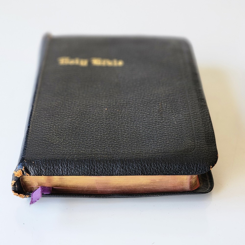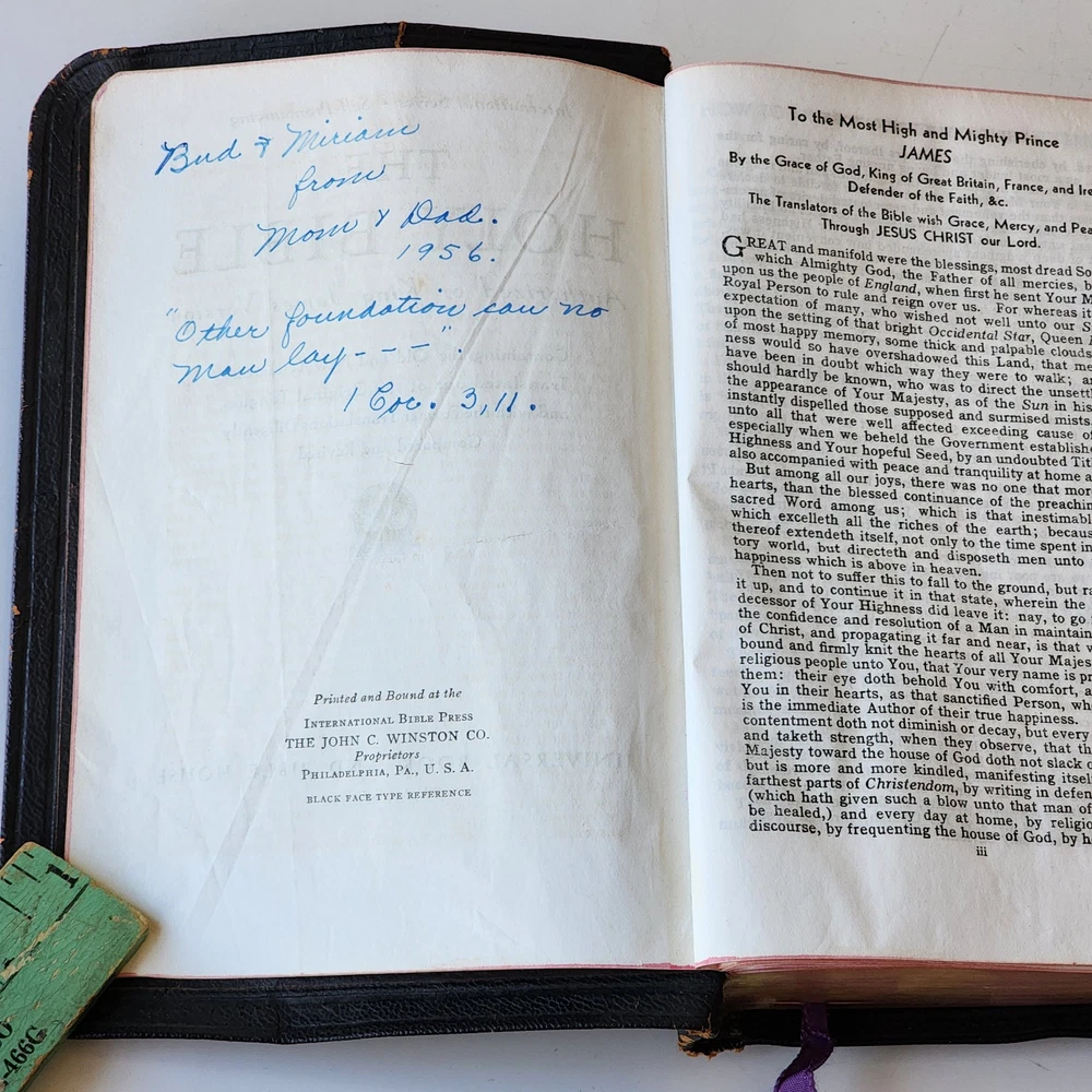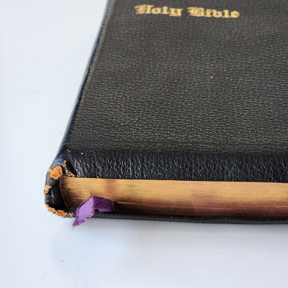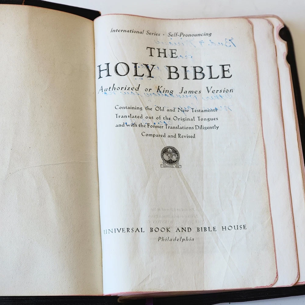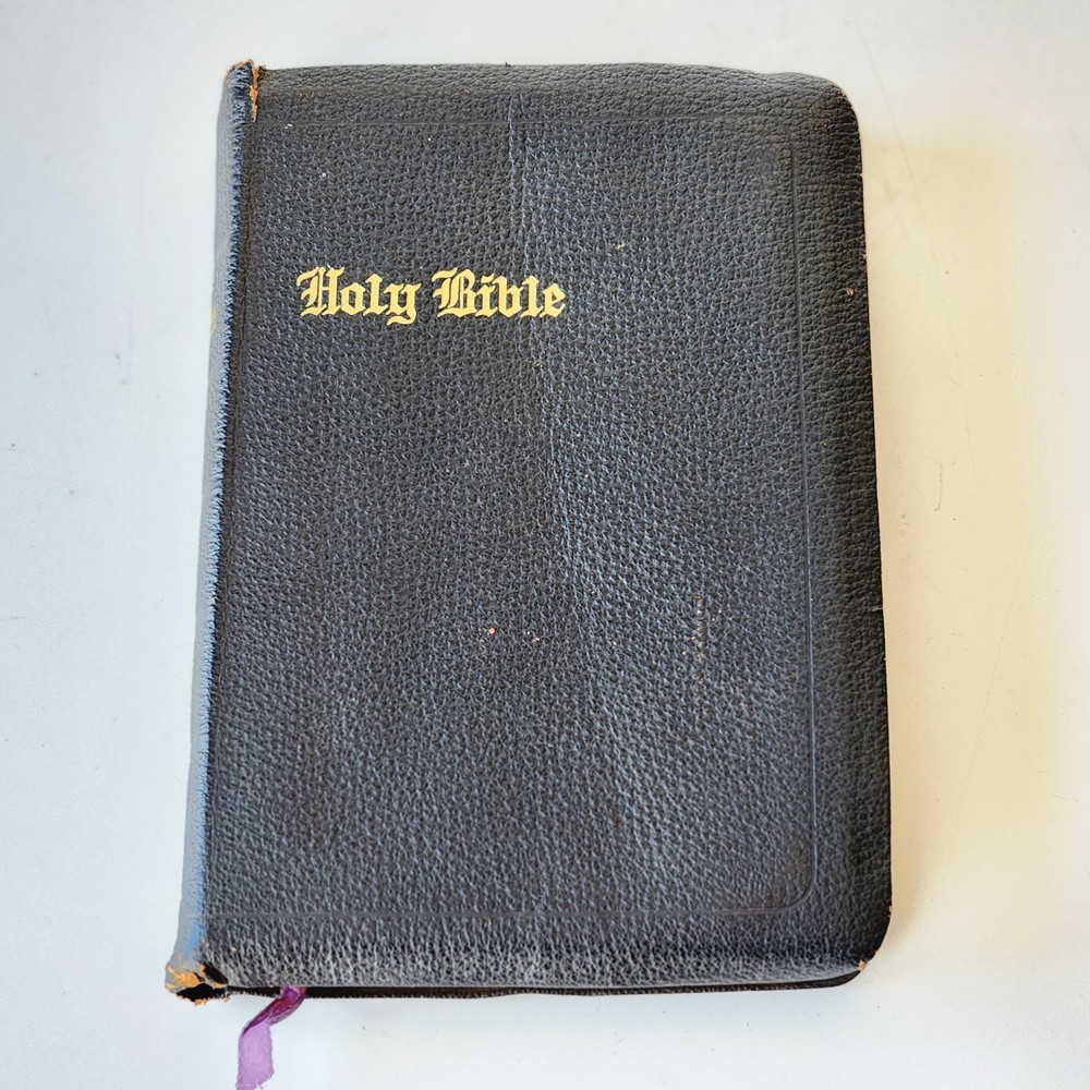 Vintage Holy Bible International Series King James Version Leather Lined Thumb Index John C. Winston *Cover has been bent. It isn't as noticeable on front but is very noticeable inside *There's an inscription in the front, which is dated 1956 *Wide gutter at pages 8 & 9 but still intact *Wear on spine Please see photos and feel free to ask any questions you may have