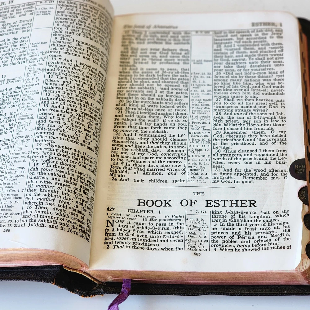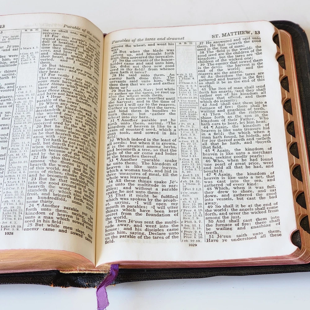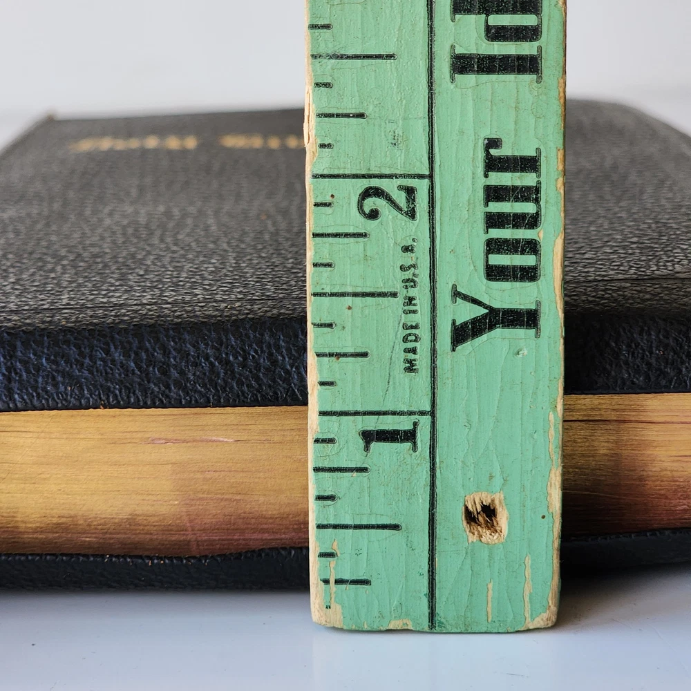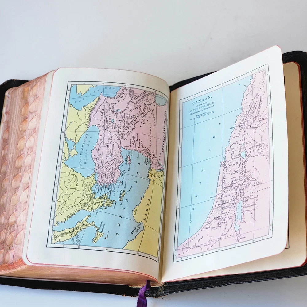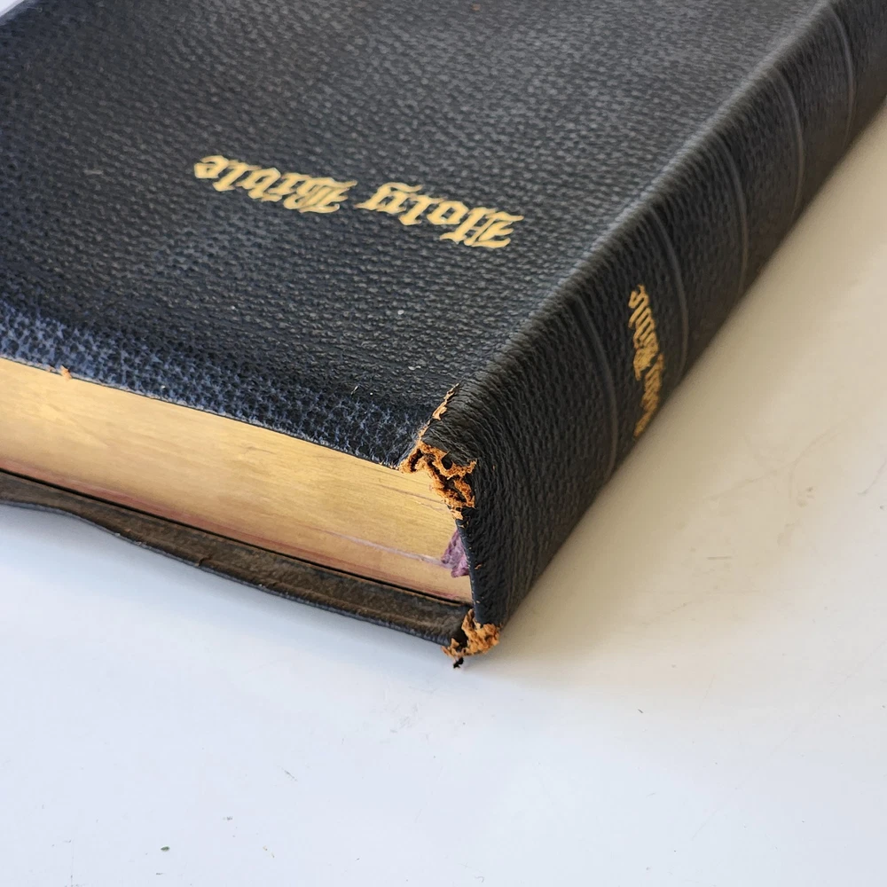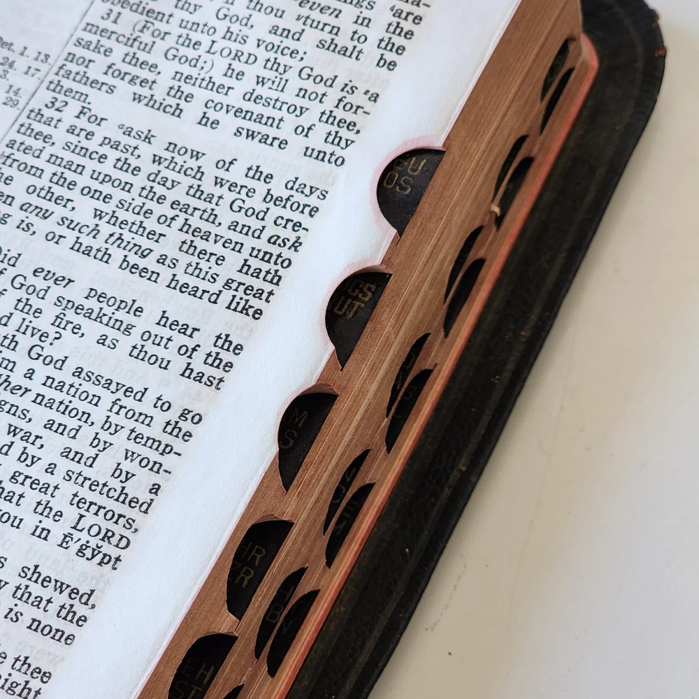 Vintage Holy Bible International Series King James Version Leather Lined Thumb Index John C. Winston *Cover has been bent. It isn't as noticeable on front but is very noticeable inside *There's an inscription in the front, which is dated 1956 *Wide gutter at pages 8 & 9 but still intact *Wear on spine Please see photos and feel free to ask any questions you may have