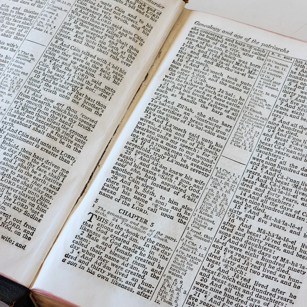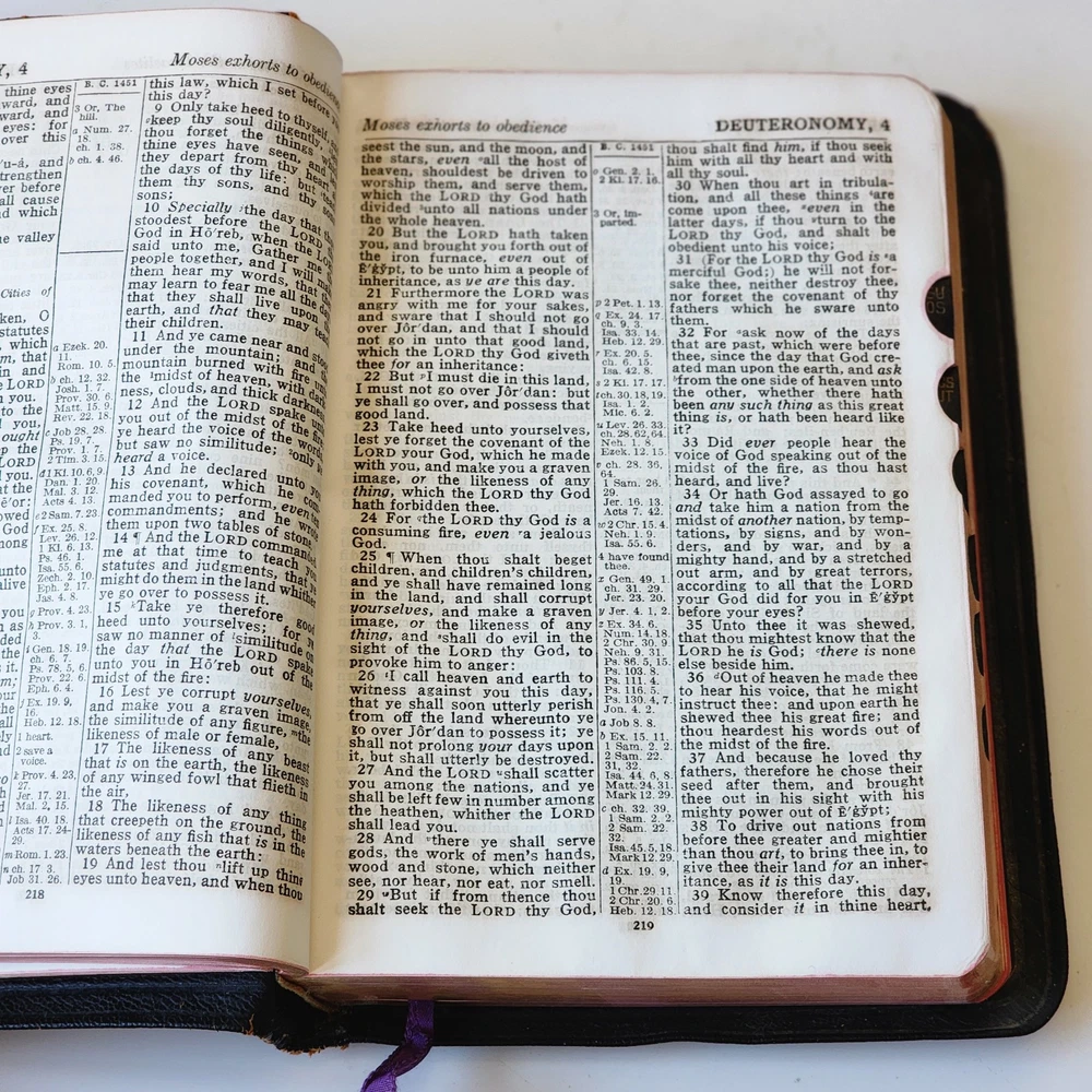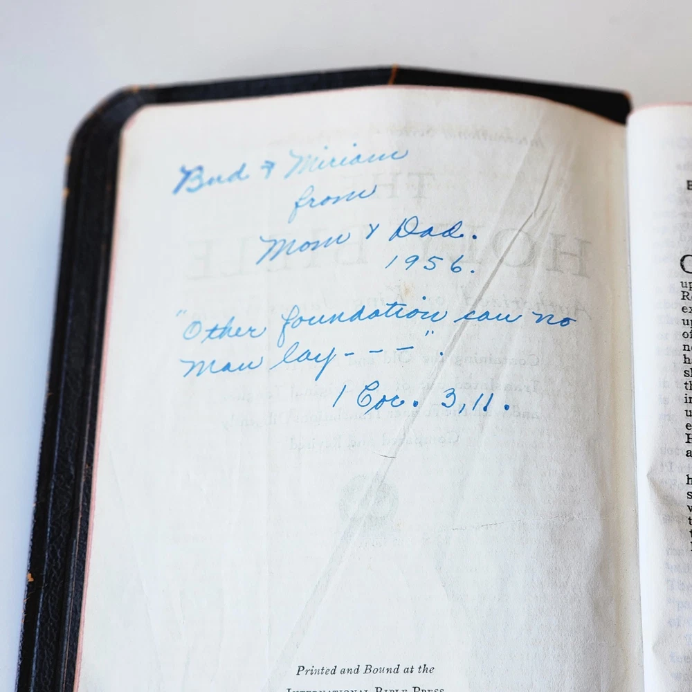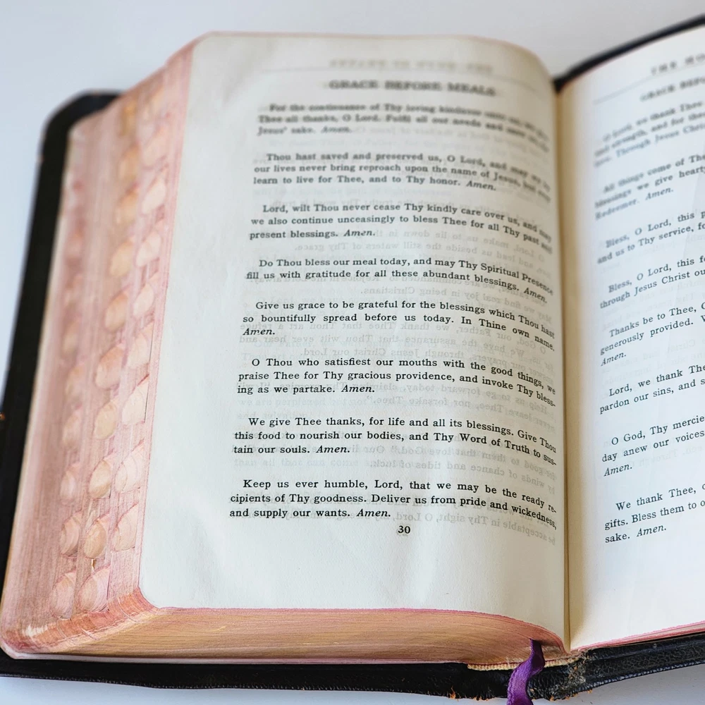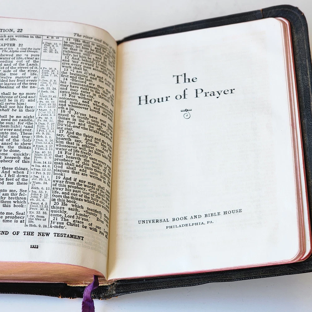 Vintage Holy Bible International Series King James Version Leather Lined Thumb Index John C. Winston *Cover has been bent. It isn't as noticeable on front but is very noticeable inside *There's an inscription in the front, which is dated 1956 *Wide gutter at pages 8 & 9 but still intact *Wear on spine Please see photos and feel free to ask any questions you may have