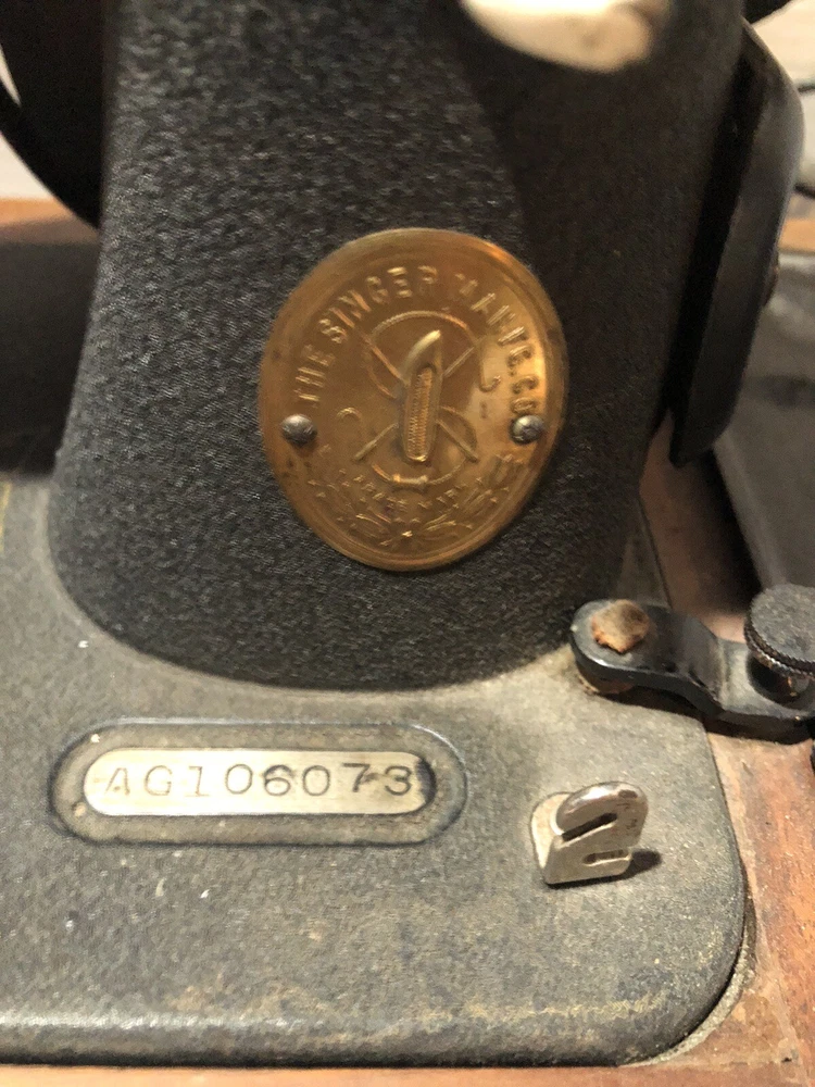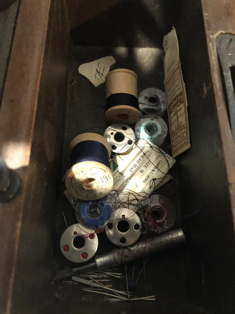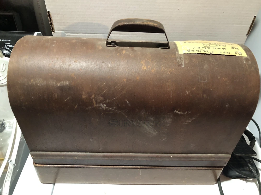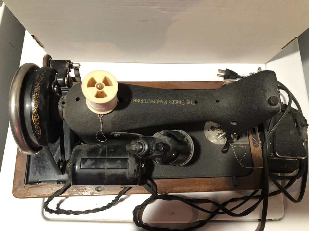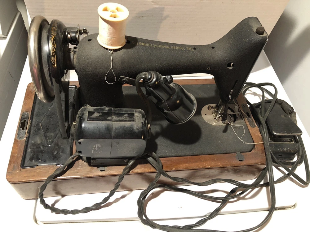 This vintage Singer sewing machine is a true gem. With its unique crinkle Godzilla finish and bentwood case, it's not only a functional sewing machine but also a beautiful collector's item. Made in the United States, the machine is a domestic model and has been well-maintained. It comes with a variety of accessories and is in excellent working condition. Whether you're an avid sewer or a collector, this Singer sewing machine is a must-have. Has foot pedal and a light and some accessories