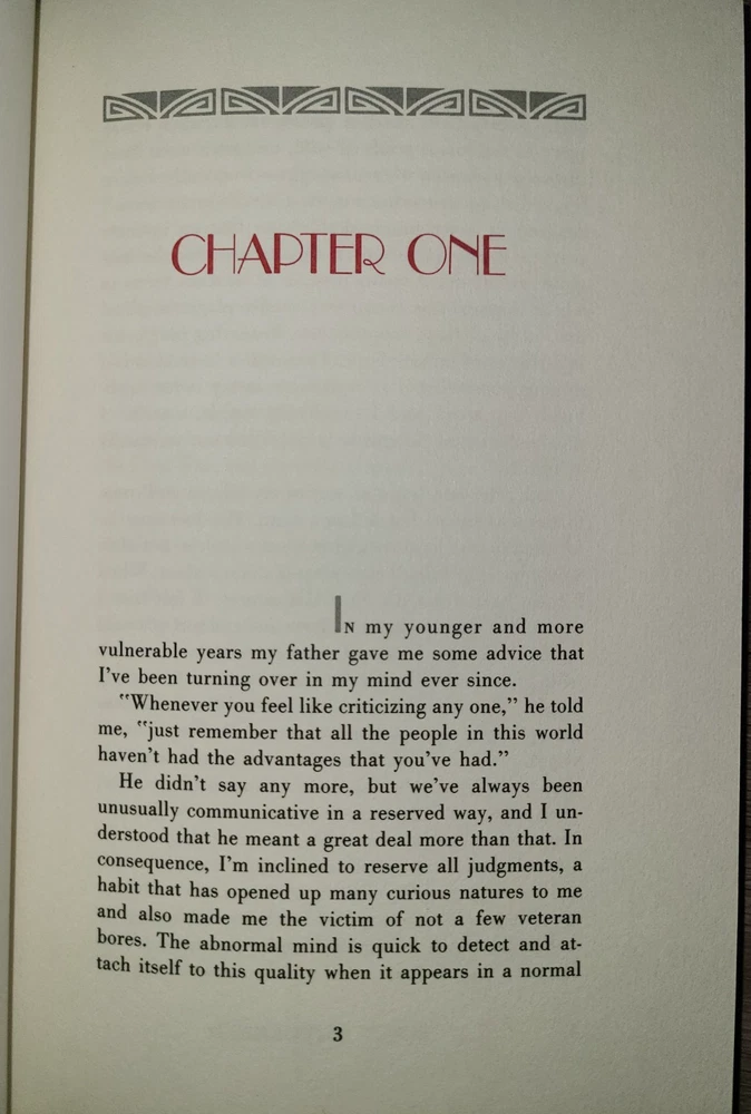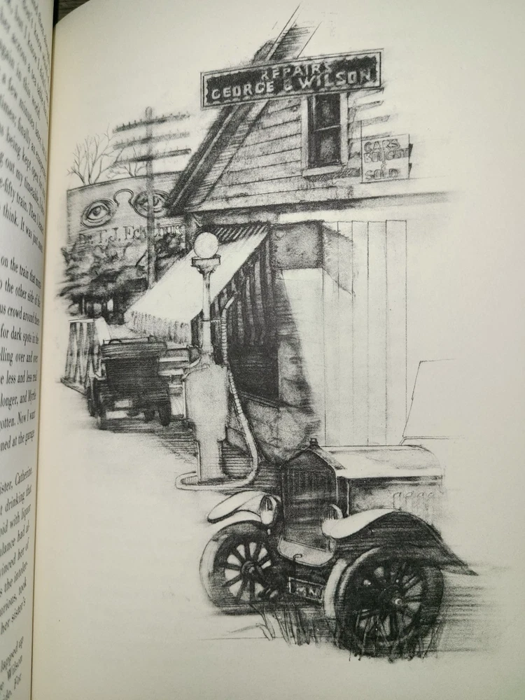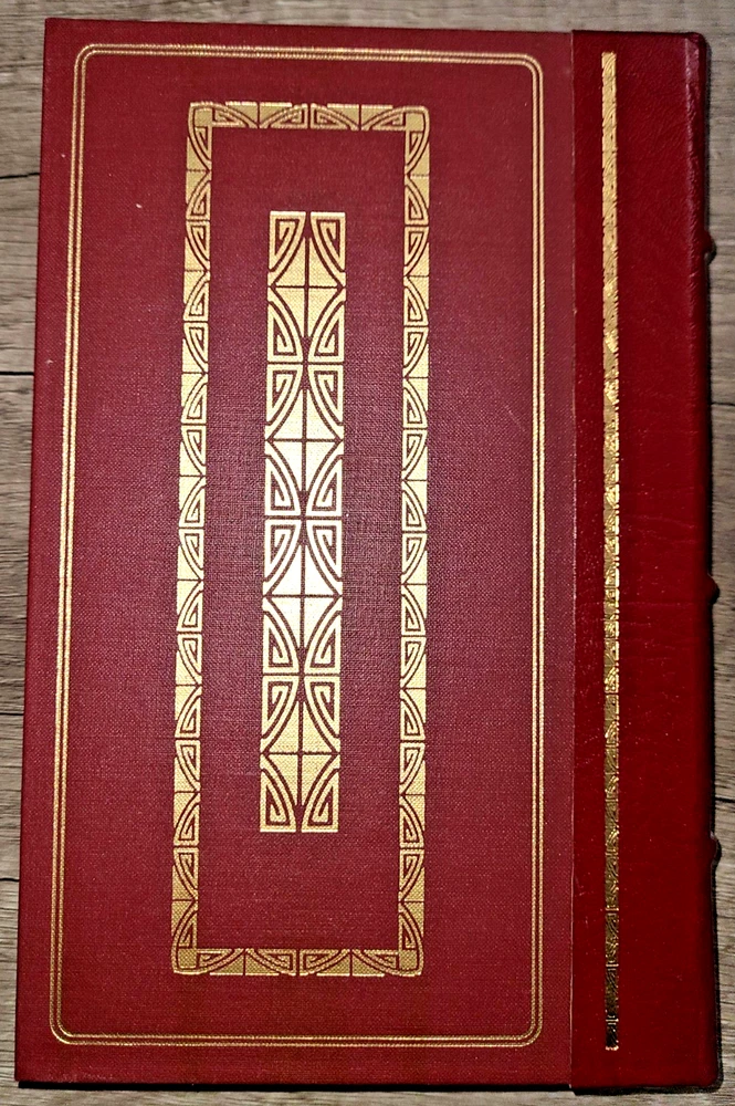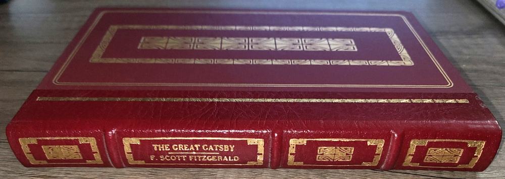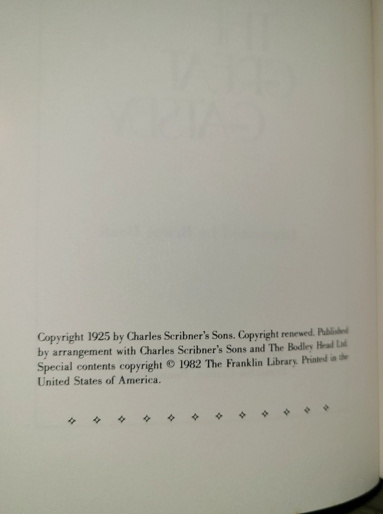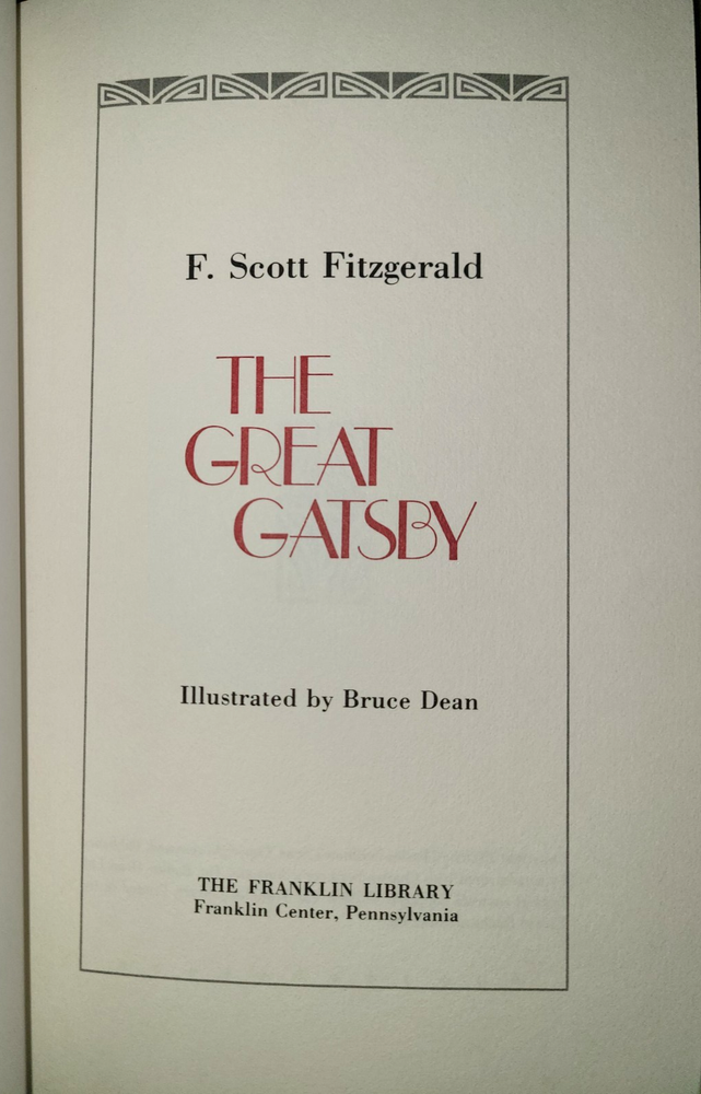 Vintage leatherbound book, The Great Gatsby by F. Scott Fitzgerald, illustrated by Bruce Dean, 1982. Published by The Franklin Library. Measures 5 3/4" x 9". Minor wear as shown in photos; previous owner's bookplate inside front cover. Sent to you from my smoke and pet free household in the US. No returns except in cases of incorrect info (I do my best to list all defects clearly, but I do occasionally miss things). Please see my other listings - now with FREE domestic shipping on all items! Please note that all my orders ship within ONE business day after payment is received (no Saturday shipping).
