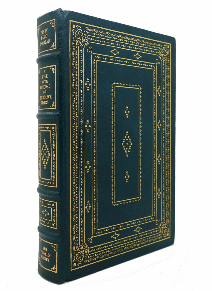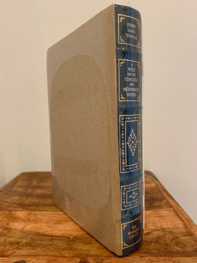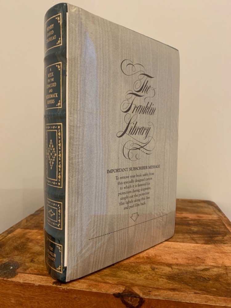 This is full genuine leather bound in new and sealed condition, never opened or read. The publisher’s notes booklet is inside the plastic wrap. The last photo is for exemplification only. There is 1 marking on the bottom and minuscule oxidation on the gold gilt of the page block as shown in photos. This book is the perfect find, perhaps the last one to be found in plastic wrap. It laid in waiting for nearly 40 years to find its unique loving owner. 'A Week on the Concorde and Merrimack Rivers' by Henry David Thoreau is one of Franklin Library's ‘100 Greatest Masterpieces of American Literature’, with wonderful attributes: •Fully and tightly bound in genuine leather. •22kt gold accents deeply inlaid on the "hubbed" spine and covers. •Heavy duty binding boards enhance the book’s durability. •Superbly printed on acid-neutral paper that lasts for generations. •Sewn pages – not just glued like ordinary books. •Handsome moiré end pages and a satin-ribbon page marker. •Gold gilded page ends. •Rigorous inspection at every stage ensured adherence to exacting standards and the highest quality. •Superb craftsmanship and commitment to quality. The appeal for collecting Franklin Library comes from having these attributes taken way further into the exquisite quality, durability and craftmanship, than Easton Press and Folio Society managed with their productions. This book is the perfect companion out on a park bench with a hot cup of coffee or snuggled up in front of the fireplace. Despite its all-inclusive nature it still feels very light and compact at a size of 3 x 15 x 22cm. Wonderful to hold and excellent reading experience.