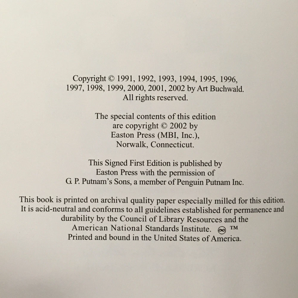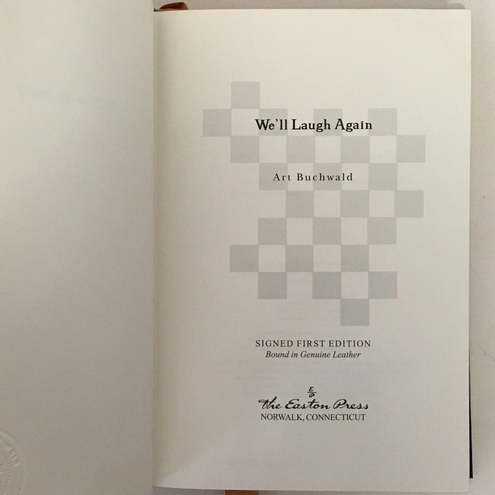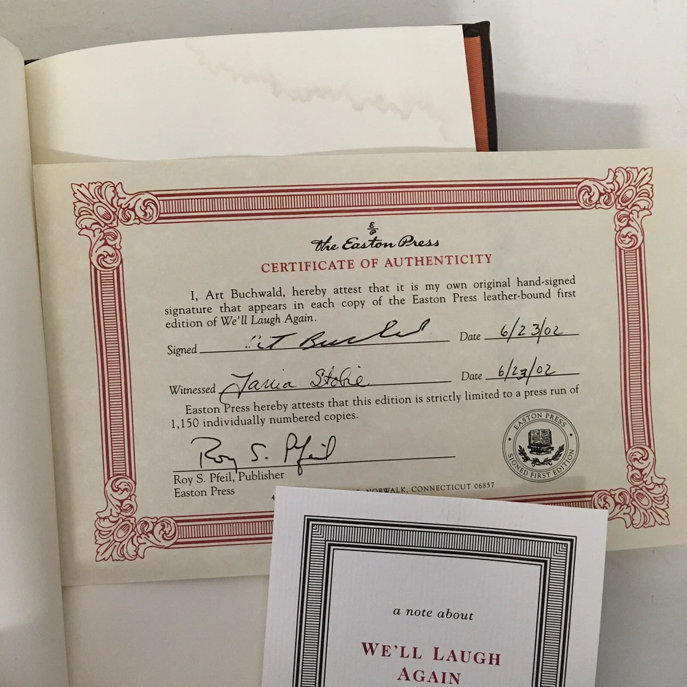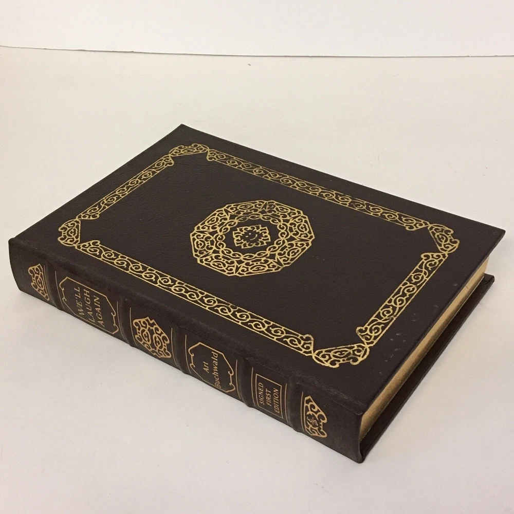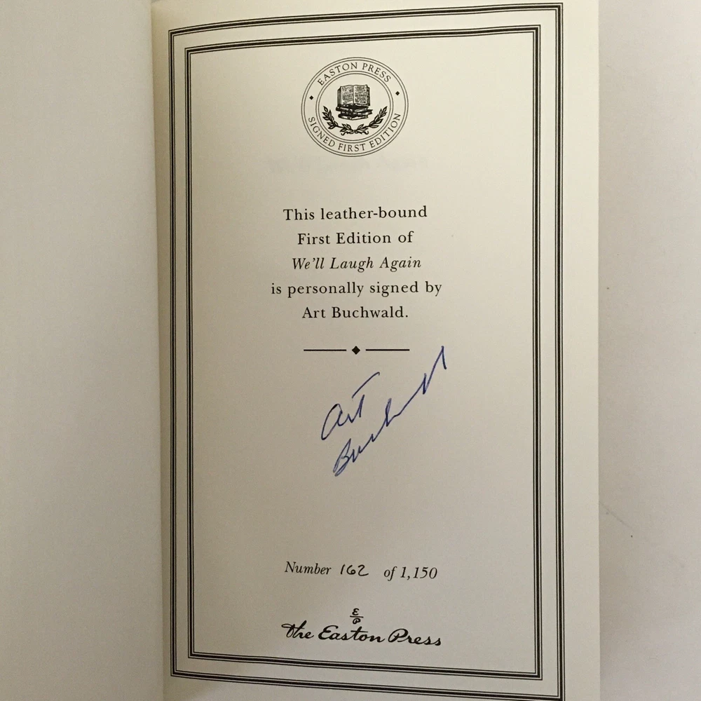 We'll Laugh Again by Art Buchwald, Signed First Edition Leather Bound, #162, COA This is the actual item you will receive We'll Laugh Again By Art Buchwald Signed First Edition Genuine Leather Bound With Certificate of Authenticity COA #162 of 1,150 Signed by author Stamped on Title Page "From the Library of Ex Libres ARBH" Copyright 2002 Published by Easton Press Norwalk, Connecticut Hardcover Book is in Really Nice condition - Some water damage inside rear cover - Does not detract from beautiful readability - Little scuffing and shelf wear to cover - Binding Tight - Corners are crisp - Clean Pages - No tearing of pages - No highlights, other writing or underlines noted - Indepth and comprehensive subject matter material - 265 pages If you choose Media Mail, please be advised that the USPS has been Experiencing significant delays for this class of mail. Choose Priority for a better experience. A Classic in its field! INTERNATIONAL BUYERS WELCOME! - Independent Texas Bookseller values your business and guarantees your satisfaction! Please ask any questions you may have. Thanks for shopping with Crystal & Jules!