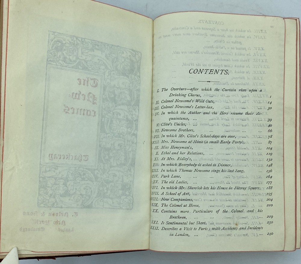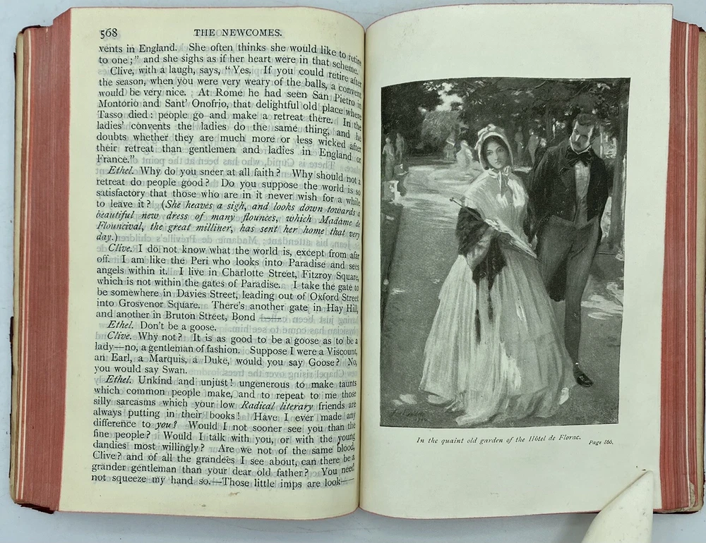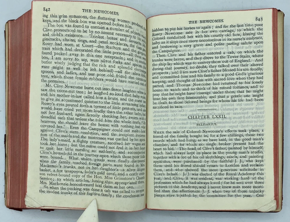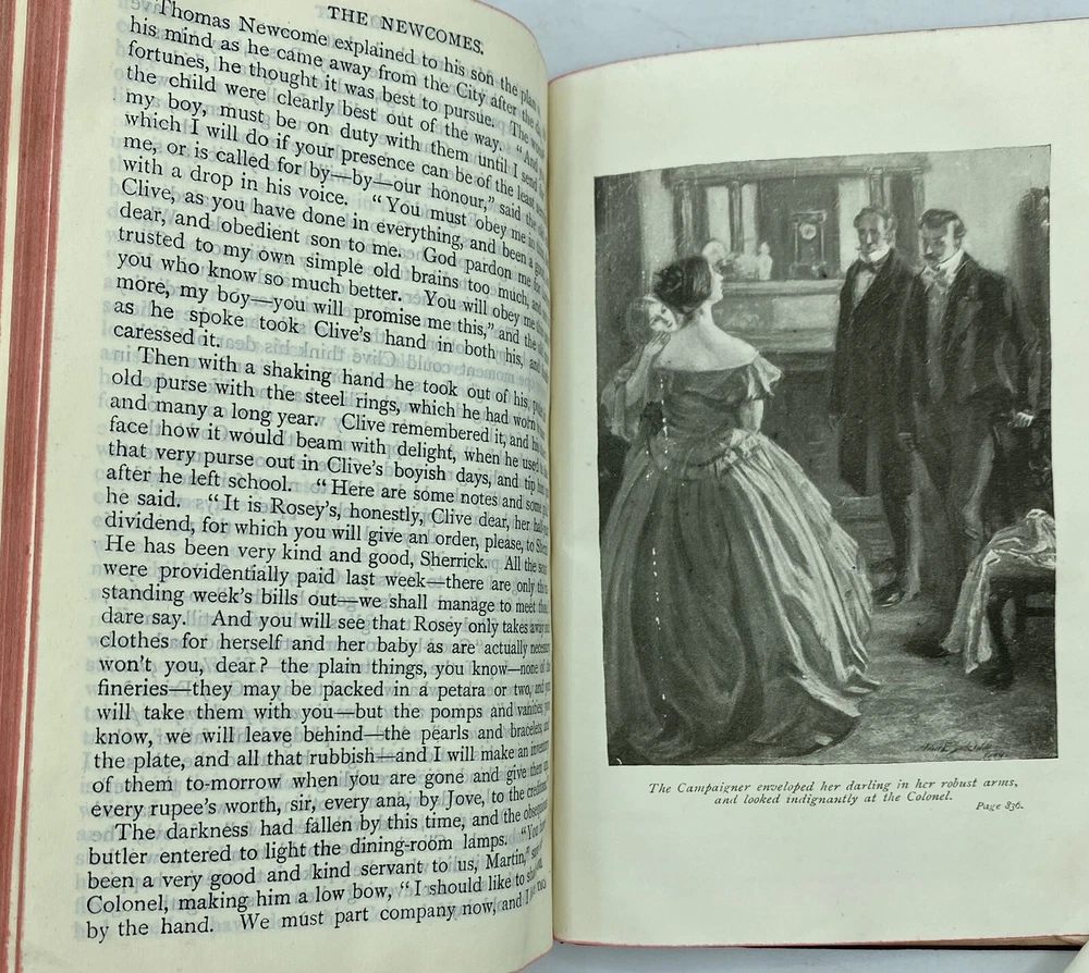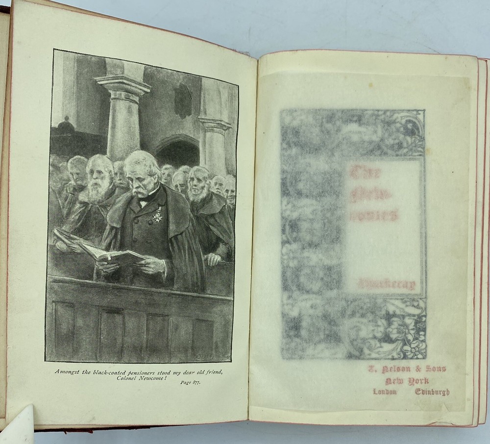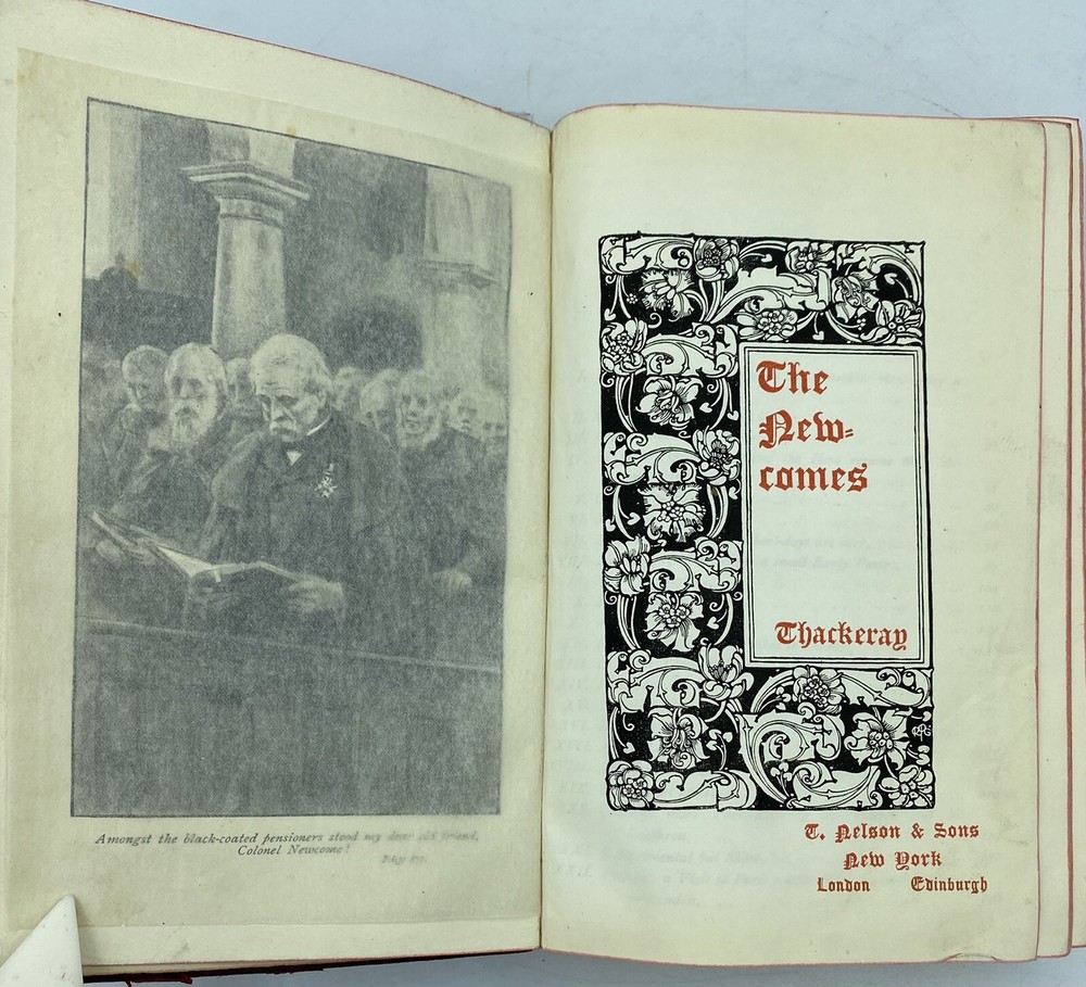 FOR PURCHASE ~ The Newcomes William Makepeace Thackeray. London: T. Nelson & Sons. n/d. (ca. 1900) Leather-bound edition, likely from a larger set of Thackeray's works; however, after quite a bit of searching, I cannot find any Nelson publications with matching spines, and there is no indication on the title that this is of a particular series. Bound in burgundy leather. Gilt tooling on spine. Nearly 1000 pages fit into this 12mo--appears to be scritta or some other kind of lightweight paper. 4 illustrated plates (inc. frontis). All edges gilt. Pages 841 - 852 seem to have been improperly cut at bottom corners, resulting in excess-- likely just a printer's error. Generally nice condition, but with some wear. Previous owner appears to have mended some hinging at front board. Item Spex Measurements: 12mo Weight : 9 oz. Pages : 928 Condition Details : TThis item is in Good-Fair condition. Some pages may show light foxing, stains, or tears. The binding is intact. There is some wear to edges. Please see photos as they are a part of this description! ------------------------------------------------------------------------------------------------------------------------ Shipping : Domestic and International Buyers : For multiple purchases, flat-rate Priority shipping is available. Please contact me at time of purchase. Handing time : 1 business day Shipping combined when applicable. All items are shipped USPS media mail or priority domestically. Other services available upon request. Seller is not responsible for any damages or losses inflicted by shipping services. When packed and shipped, items are exactly as they appear in photos. International buyers are responsible for any VAT or duties/customs taxes in their respective countries. ------------------------------------------------------------------------------------------------------------------------ Grading Guide : Pristine or Mint : Like new. Very Fine : Few if any cosmetic issues. Fine : Minor cosmetic issues with the item, such as small scuffs, scratches, or tears. Good : Some noticeable structural wear and/or cosmetic damage that does not interrupt the item's overall aesthetic integrity or intended use. Fair : Significant, noticeable structural wear and/or cosmetic damage that can interrupt the item's overall integrity and/or intended use. ** Please keep in mind all items are Estate or previously owned unless otherwise noted. Please read the condition details & look over the provided photos carefully. If you have questions about an item, I am happy to help . ** ~~~~~~~~~~~~~~~~~~~~~~~~~~~~~~~~~~~ Live in an Antique D esert or looking for something you cannot find...? ~~~ I started Valley of Ashes Antiques because I love collecting and researching books, print media, the occasional piece of jewelry, and other antique odds & ends. My professional background as an academic/English Professor and GIA-certified collectables & fine jewelry buyer informs how I select and price items. ~~~ Please message with any questions! ~~~