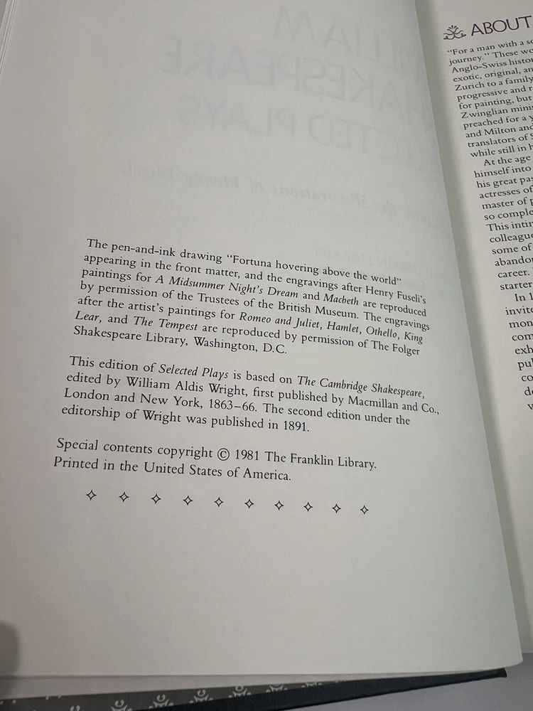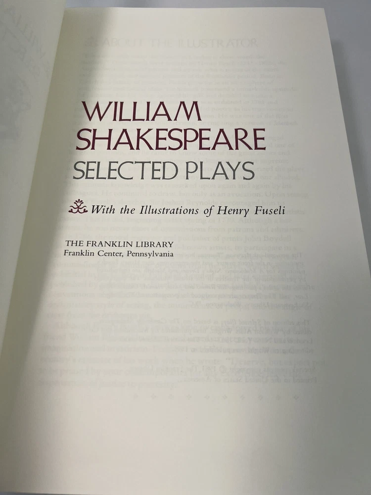 William Shakespeare "Selected Plays" 1981 Vintage HC - The Franklin Library Used . An item that has been used previously . The item may have some signs of cosmetic wear , but is fully operational and functions as intended . This item may be a floor model or store return that has been used . See the pictures for full details of any imperfections . Item sold as its. Thank you for your attention. Let me know if you have questions.