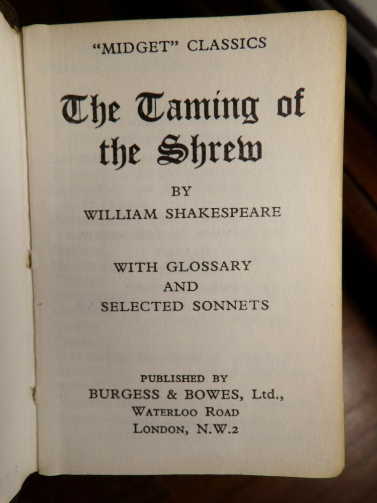 The Taming of the Shrew by William Shakespeare Published by Burgess & Bowes (Not Dated - Circa 1964) Leather Hardcover Edition Info Not Provided Complete and Unabridged Approximately 3-1/8 x 2-1/4 inches 250 Pages Part of the "Midget" Classics series of Shakespeare plays. Black leather with gold titles and design on spine. Gold top, fore, and bottom page edges.