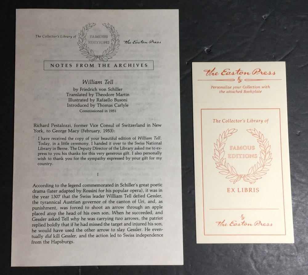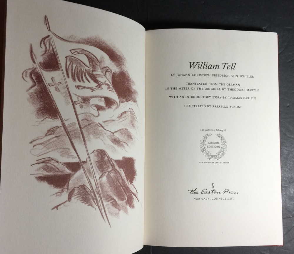William Tell by Friedrich von Schiller Part of the Famous Editions collection of The Easton Press, Norwalk, Connecticut, 1952. This book is in excellent, unread condition. Includes "Notes from the Archives." The Easton Press books are bound in genuine leather binding, with 22kt gold accents and hubbed spines, gilded page ends, acid-neutral paper, Moire fabric endsheets, and evocative illustrations and decorations. We will be happy to combine shipping, wherever possible. Some items cannot be combined because of their size, weight or because they are fragile. Please ask if you have any questions. Your order will ship by the next business day after receiving payment. All items are from a smoke-free environment. Thank you, and Happy Reading!