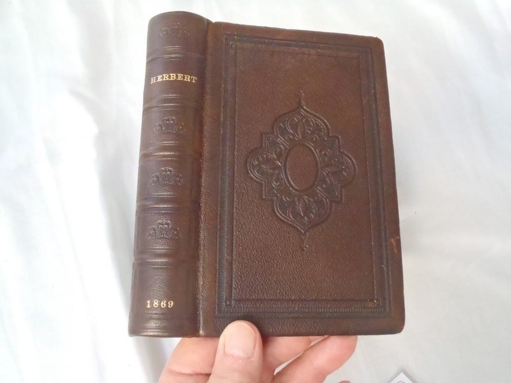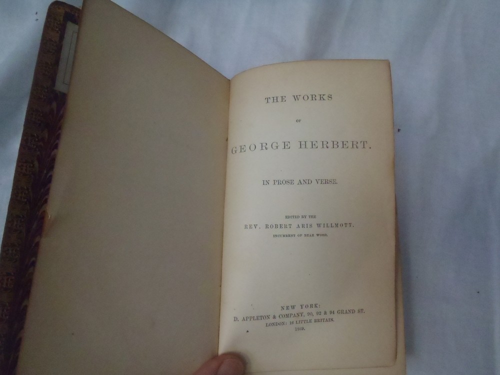 Works of George Herbert in Prose & Verse Edited by Rev Robert Aris Willmott. New York [:] D. Appleton & Company. 1869 4 1/4 " x 6 1/2, 466pp. Full tooled pebbled covers with gilt lettering on spine. Outer and inner dentelles, marble endpapers and gilt page edges. Covers very slightly scuffed. Title page, portrait, text clean. Ink Signature front blank, bookplate inside front cover. Binding solid, professionally repaired by The Gilded Leaf. This is from a smoke free home. Please email me with any questions before bidding. All sales are final. Please check out my other auctions. I will be glad to combine your purchases to save you postage! Please let me know if you are bidding on more items. I ship the next day except for weekends and holidays. Payment musts be received within 5 days of auction closing. Returns accepted if there is a problem. Please contact me before returning an item. Buyer pays return postage. Refund given when item has been returned to the seller. Happy Buying!!! Thanks for looking!!! International bidders please wait for an invoice. Packages will be weighed and USPS rates will apply with s small handling charge for packaging, usually under a dollar. If you want tracking, you must use priority rates. I will use first class rates when weight allows. * Import duties, taxes and charges are not included in the item price or shipping charges. These charges are the buyer’s responsibility. * Please check with your country’s customs office to determine what these additional costs will be prior to bidding/buying.” * “These charges are normally collected by the delivering freight (shipping) company or when you pick the item up – do not confuse them for additional shipping charges.” * I do not mark merchandise values below value or mark items as ‘gifts’ - US and International government regulations prohibit such behavior.”