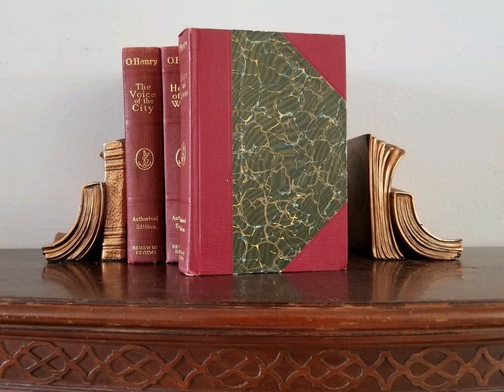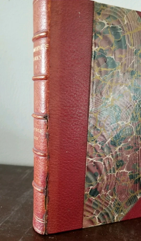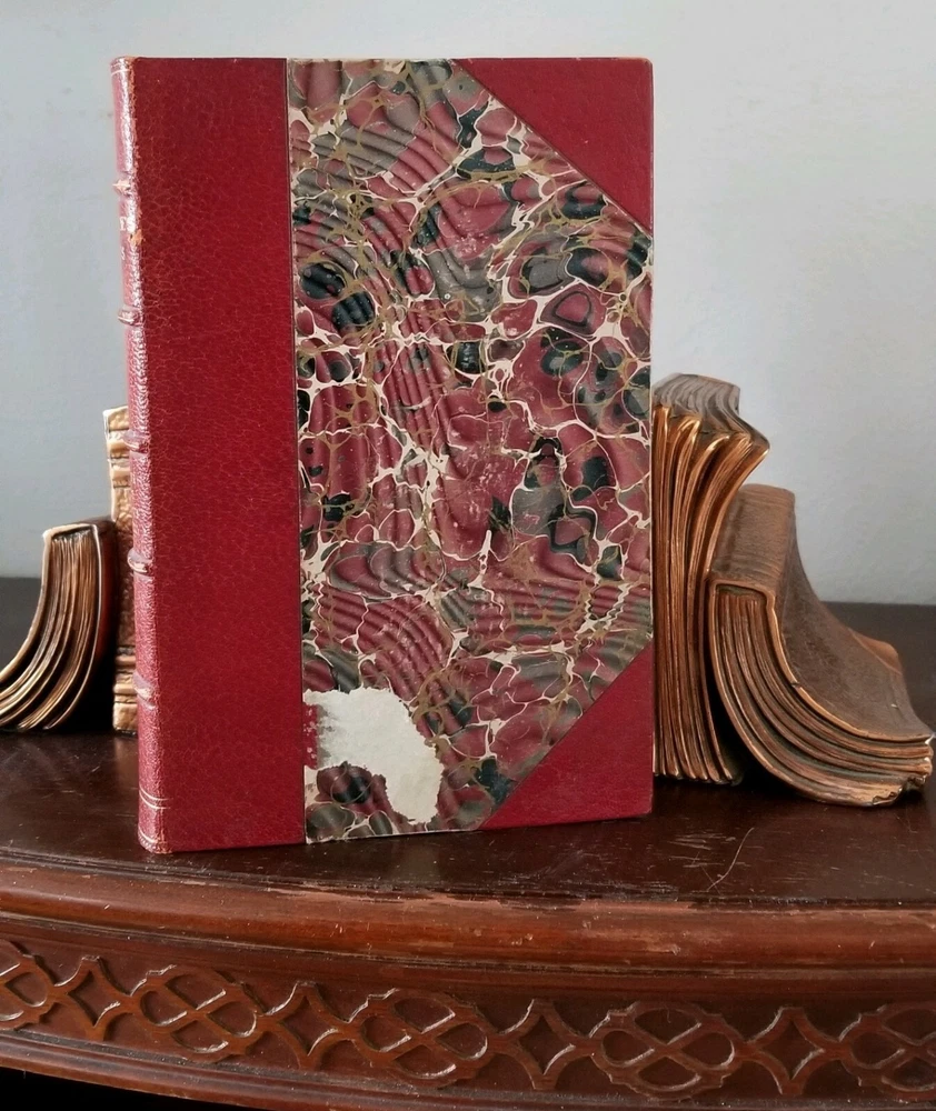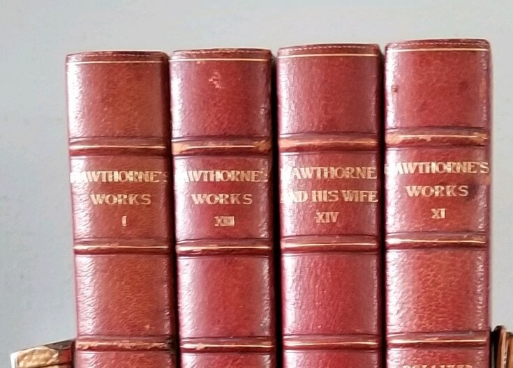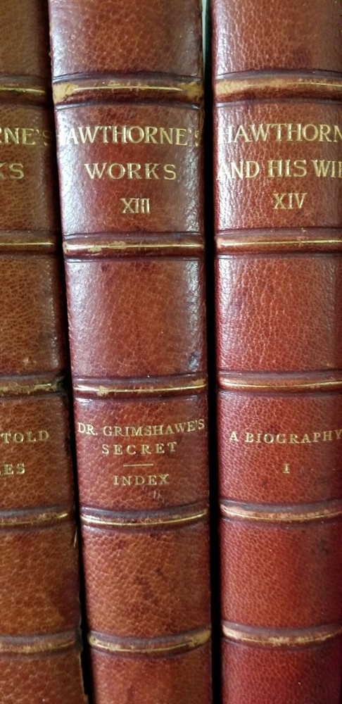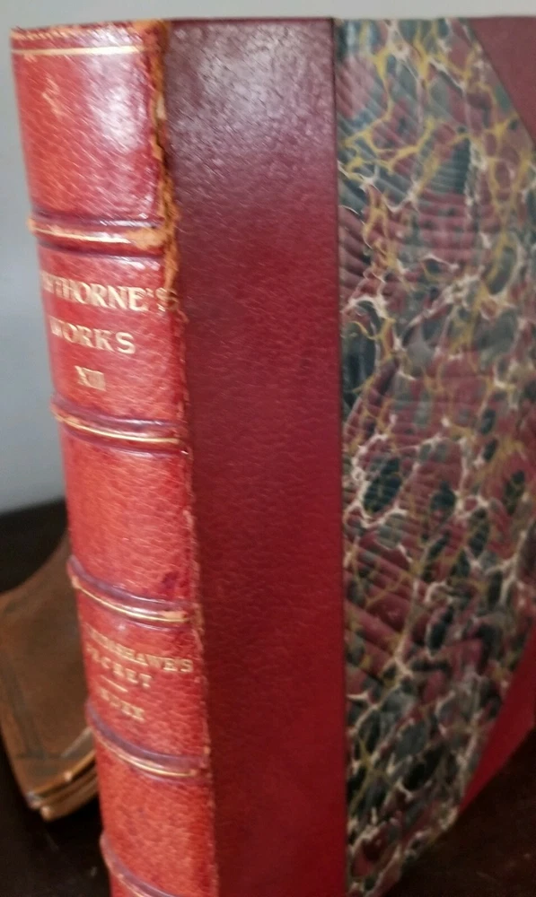 Pretty little set of Hawthorne's works. Not a complete set, but still look great on your shelf! Includes Vol 1 (Twice Told Tales), XI (Dolliver Romance), XIII (Dr Grimshawe's Secret) and XIV (A Biography of Hawthorne, part 1). Standard Library Edition, 1884, Riverside Press. All have an etching with cover paper across from title pages. Gilt top edges (bright), marble fly pages, leather and marble covers. Notice the gold title and details on the 5 spine ribs - an upgrade not found on all leather books. Vol XI has a small piece of marbling missing on front cover; Vol XIII has a 2 in. split (repaired) at top spine; Vol 1 has a 4 in split (also repaired) at front bottom spine (barely seen when on the shelf). All have "Mission House College Library" neatly stamped on title page. No bookplates or other writing found. All have some rubbing to corners and edges. Overall very attractive books.
