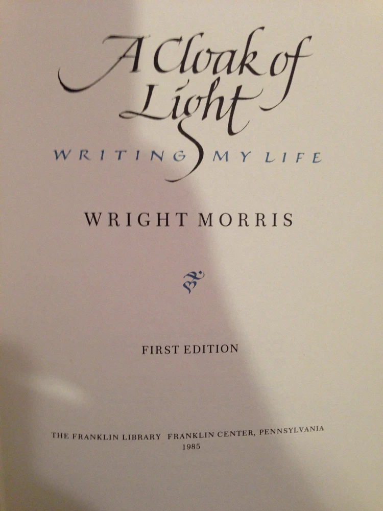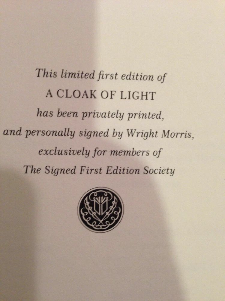 A CLOAK OF LIGHT by Wright Morris. HARDCOVER. Leather Bound. SIGNED. SIGNED to the full limitation page by Wright Morris, the author. Brand New and Never owned. This is a Franklin Library Leather Bound true FIRST Edition, FIRST Printing copy. This book was issued without Dust jacket. Book is in Brand New condition with no issues. Book has no tears, marks, creases, remainder marks, library markings, or black lines on the edges. Not inscribed to anyone. Not price clipped, not a Book Club Edition (BCE), or signed on a bookplate. True Collectible Quality. Full-Leather. A special Limited First Edition/First Printing preceding the trade edition copy. An unread Fine condition, SIGNED by author Wright Morris. This book will be carefully wrapped and shipped via USPS mail with free delivery confirmation. In this memoir, Morris chronicles the development of his craft, allowing the reader to look inside the man as the creative process takes place. Never forgetting his Midwestern roots, Morris traveled extensively in this country and around the world photographing as he went. This volume is illustrated with many of those photographs and serves as a travelogue that takes us to places like the plains of Nebraska, sultry Mexico, and romantic Venice. The third and concluding volume of memoirs (preceded by Wills Boy and Solo) chronicling the increasing interplay between the craft of fiction and the demands of life. Blue morocco leather, spine and covers decorated in gilt, all edges gilt, marbled endpapers, ribbon bookmark, 306 pp. and 1 plate and 16p illustrations from photos by the author. (Trade Edition ISBN: 9780060153991). BSF00040, BSF00042.