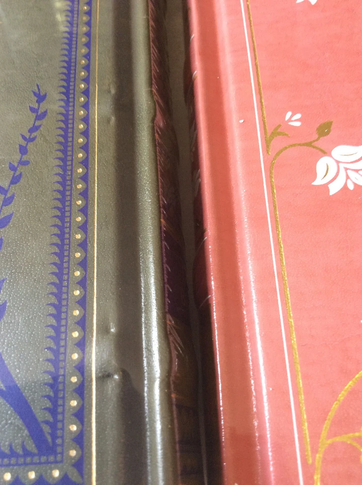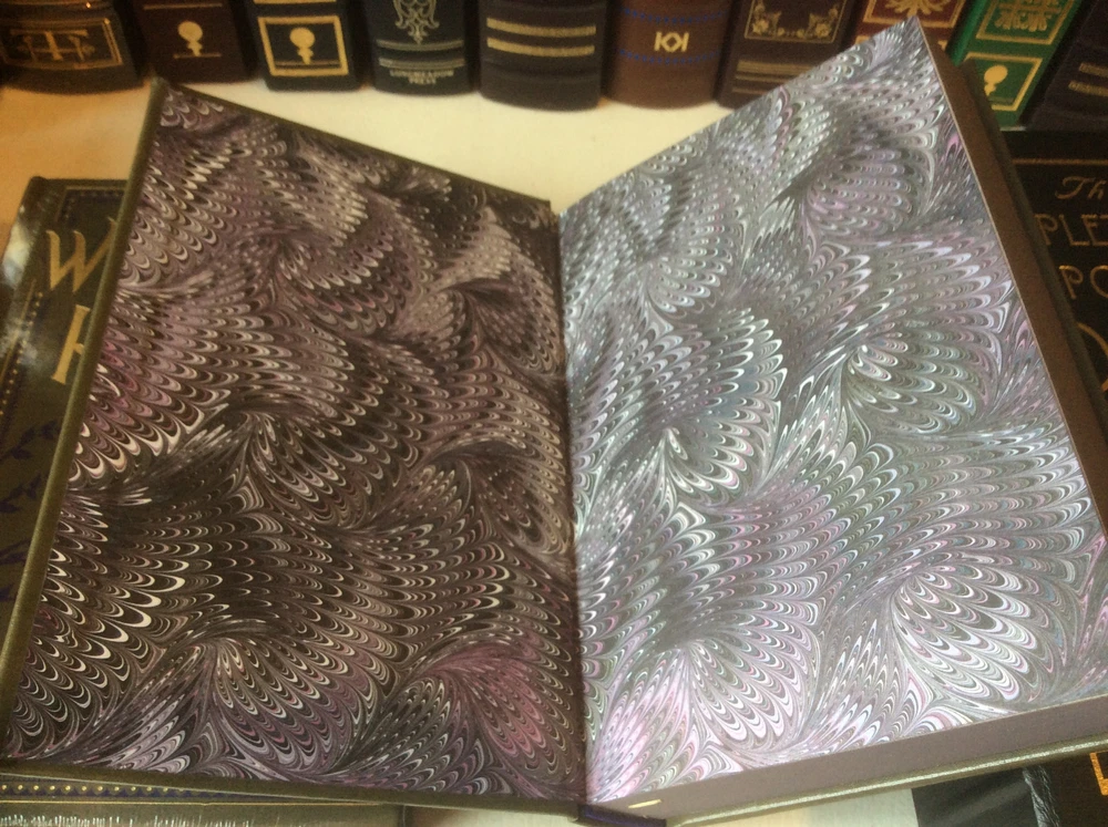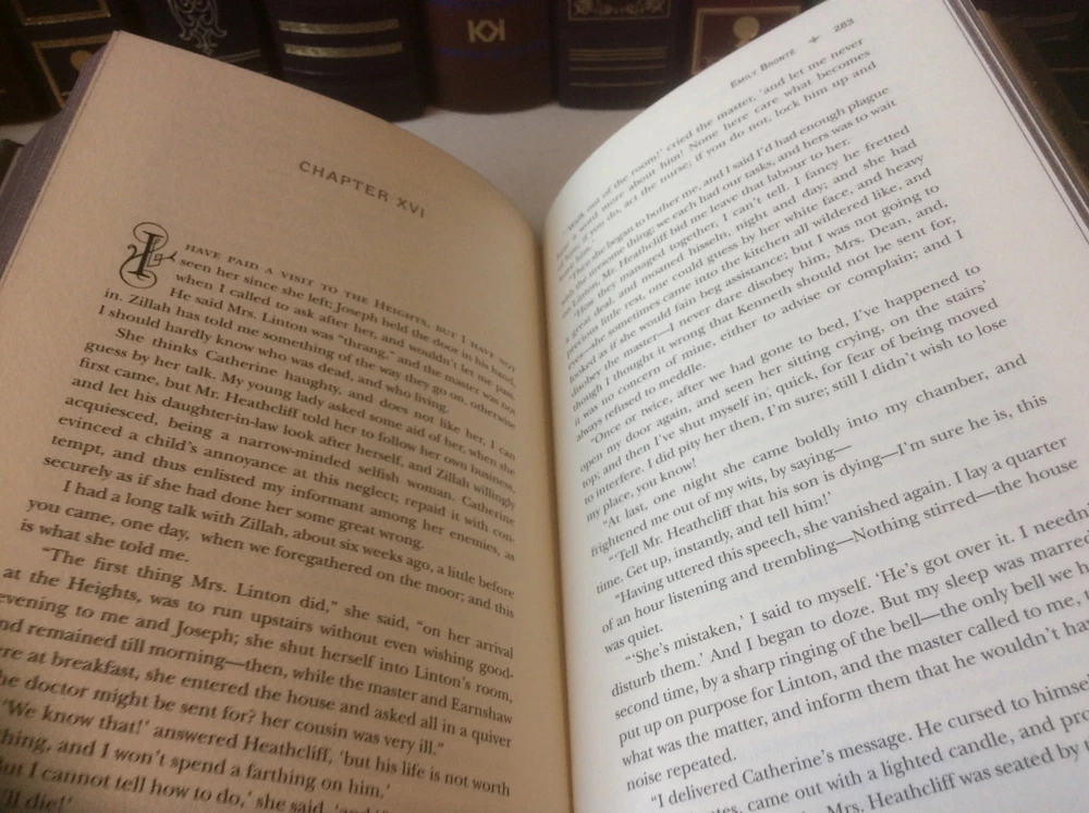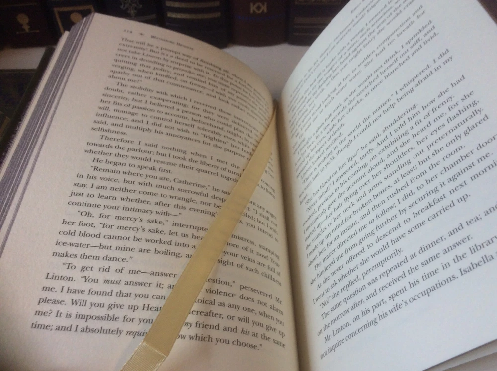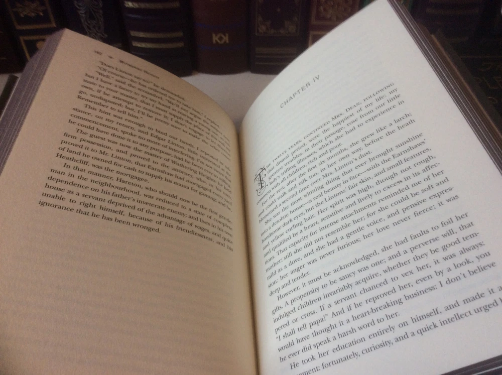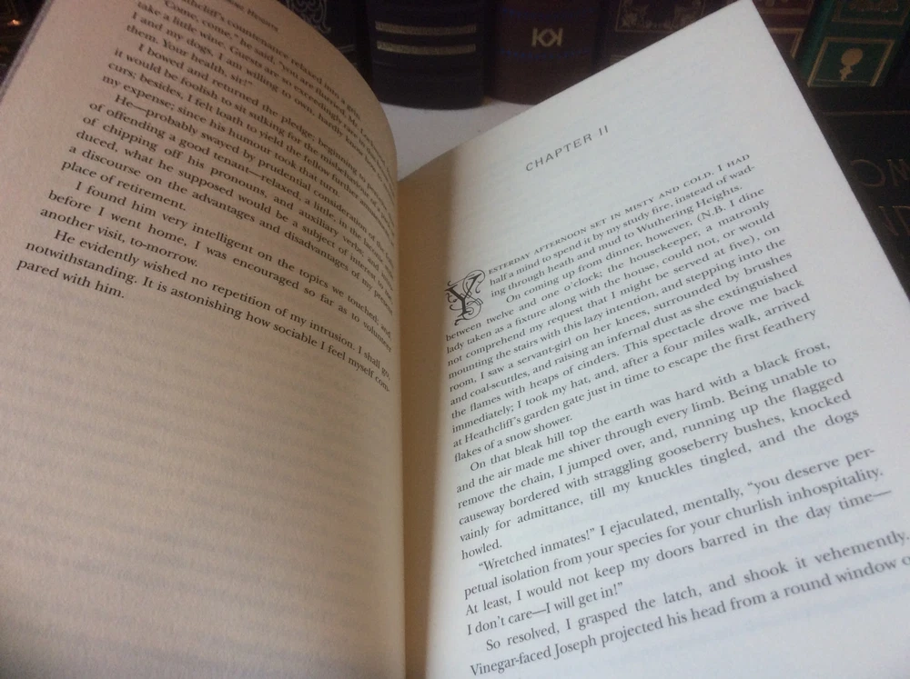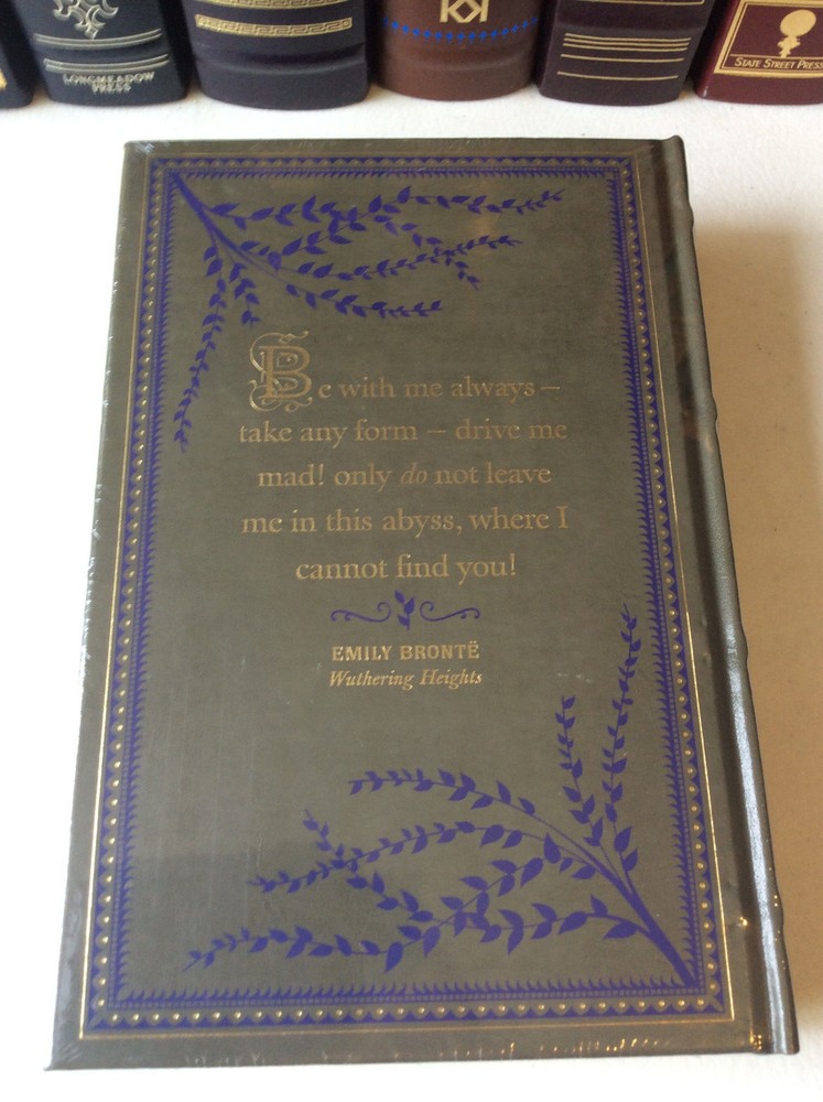 Wuthering Heights by Emily Brontë Hardcover bound in leather, with a ribbed spine, and a ribbon marker. Item Condition: Brand new, leatherbound hardcover sealed. There is a binding flaw on the back cover near the spine (see photo #7). Dimensions are approx: 8.5" x 5.75" x 1.25" This book will ship in a box, with bubble wrap. Photos 1-7 are of the actual book that will be shipped, the rest are examples of the book from an open copy.