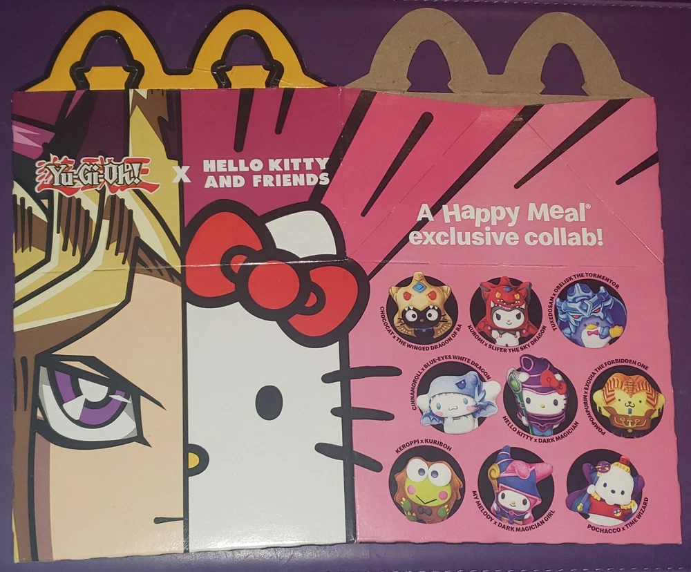 WE SHIP ALL MCDONALD'S TOYS IN SMALL BOXES WITH LOTS OF SOFT PACKING PAPER TO PROTECT THE TOYS DURING SHIPPING. WE DO NOT SHIP MCDONALD'S TOYS IN PADDED ENVELOPES OR POLY MAILERS. WE ARE COLLECTORS TOO. Check out our feedback to see how well we ship our orders. Brand New, factory sealed and not played with... 2024 Mcdonald's Original HELLO KITTY X Yu-Gi-Oh! Happy Meal toys or gently used HELLO KITTY x Yu-Gi-Oh! Happy Meal box. Choose which one you want. YOU ARE ONLY BUYING ONE, NOT A WHOLE SET. $4.00 shipping for the first toy and just $.25 for each additional toy . We combine shipping with all of our toy listings. Updating quantity daily. Complete your set now before they are gone... #1 - HELLO KITTY x DARK MAGICIAN #2 - CINNAMOROLL x BLUE-EYES WHITE DRAGON #3 - MY MELODY x DARK MAGICIAN GIRL #4 - KEROPPI x KURIBOH #5 - POMPOMPURIN x EXODIA THE FORBIDDEN ONE #6 - KUROMI x SLIFER THE SKY DRAGON #7 - TUXEDOSAM x OBELISK THE TORMENTOR #8 - POCHACCO x TIME WIZARD #9 CHOCOCAT x THE WINGED DRAGON OF RA Gently Used HELLO KITTY x Yu-Gi-Oh! Happy Meal Box (Box may/will have some fry grease on the inside of the box)