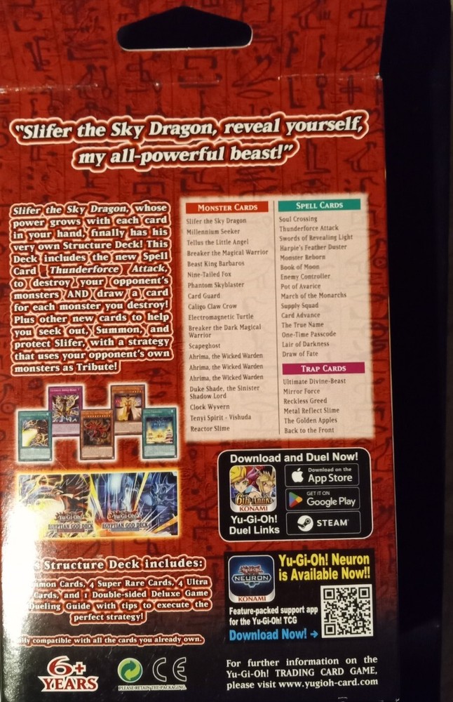 Immerse yourself in the world of Yu-Gi-Oh! TCG with the Egyptian God Deck featuring Slifer the Sky Dragon. This deck contains 40 cards and is designed with the Dragon archetype. It comes in Japanese card size and is a factory-sealed, new edition in English. The deck is a Structure Deck and is the perfect addition to any collection. It is manufactured by Konami and is suitable for players aged six and above. This deck is a great way to experience the game and is sure to provide hours of fun. Discount on price and shipping!!!