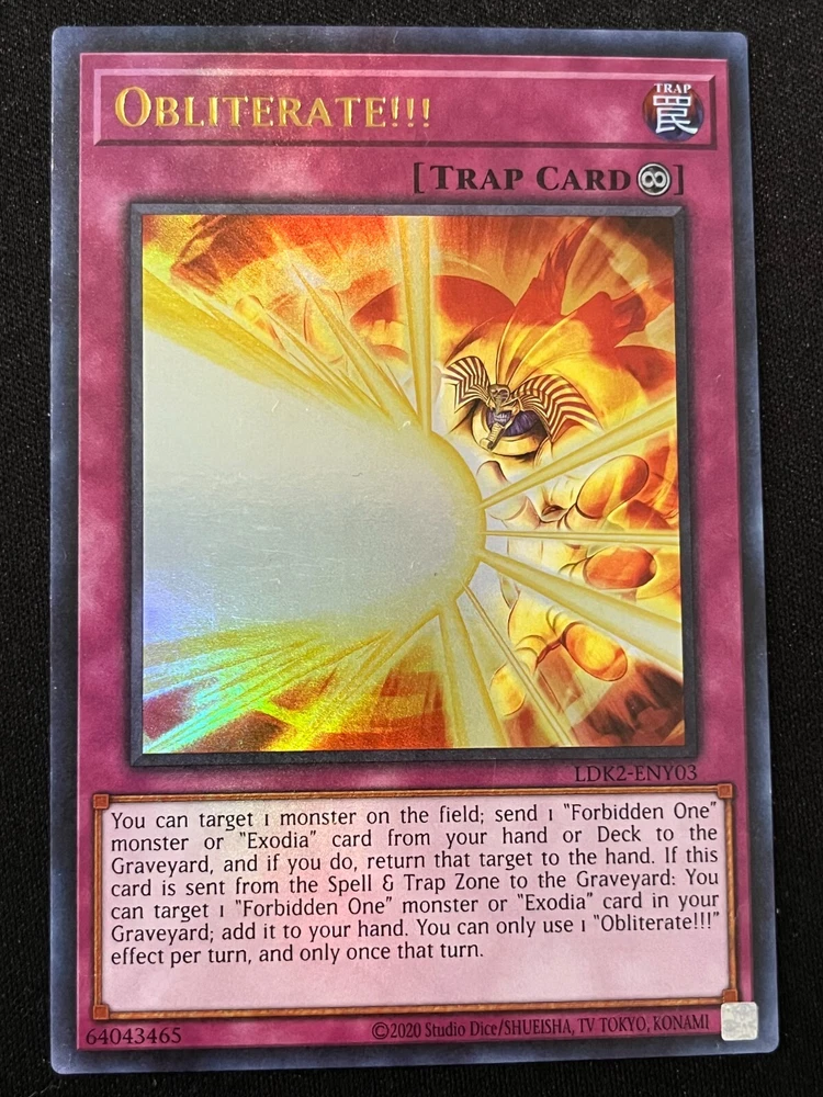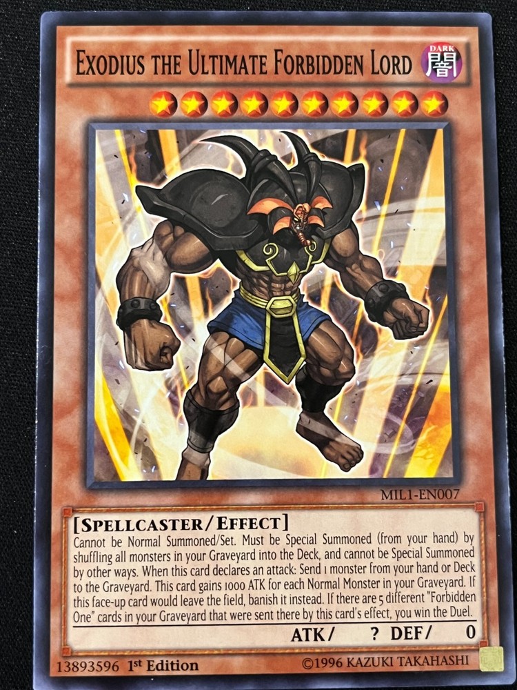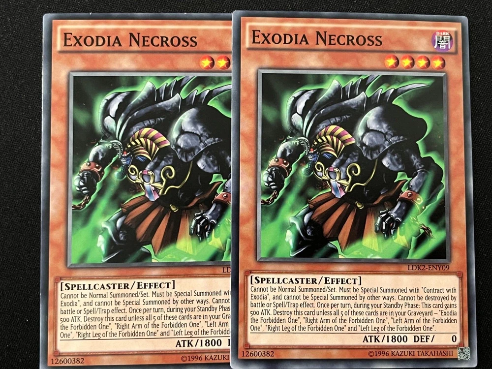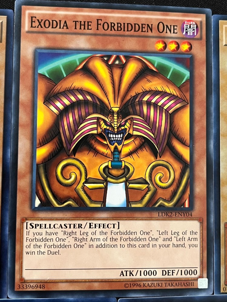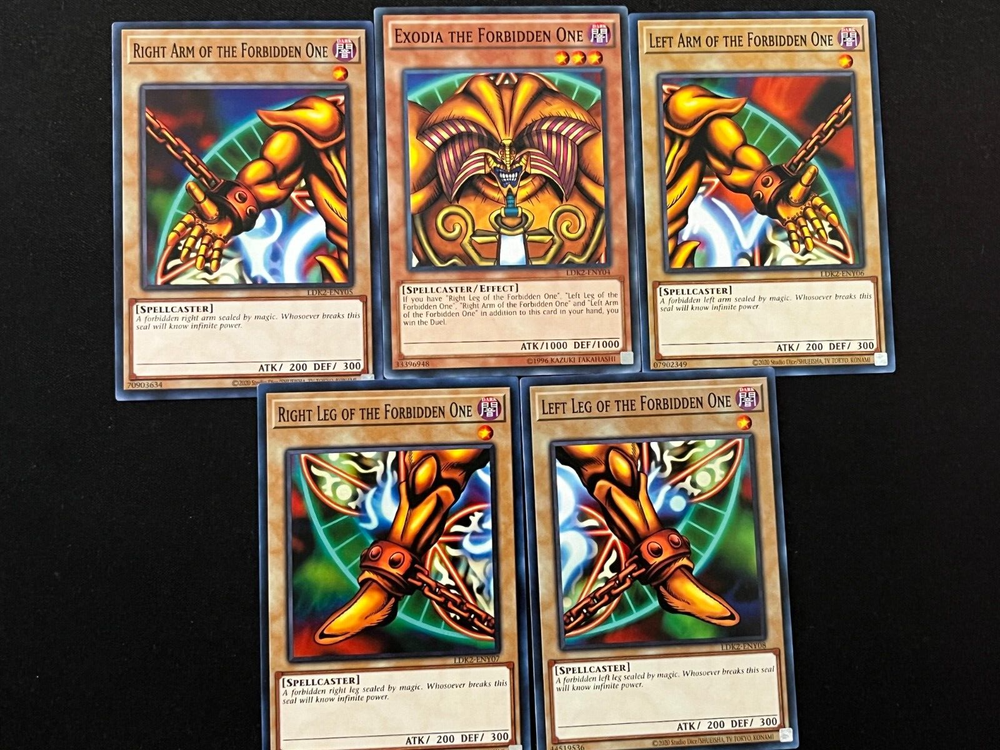 MONSTERS: 1X EXODIA THE FORBIDDEN ONE (COMMON) 1X RIGHT ARM OF THE FORBIDDEN ONE (COMMON) 1X RIGHT LEG OF THE FORBIDDEN ONE (COMMON) 1X LEFT ARM OF THE FORBIDDEN ONE (COMMON) 1X LEFT LEG OF THE FORBIDDEN ONE (COMMON) 1X THE LEGENDARY EXODIA INCARNATE (ULTRA RARE) 1X EXODIUS THE ULTIMATE FORBIDDEN LORD (COMMON) 2X EXODIA NECROSS (COMMON) 3X CARDCAR D (COMMON) 1X SANGAN (RARE) SPELLS: 2X CONTRACT WITH EXODIA (COMMON) 1X POT OF DUALITY (RARE) 1X POT OF AVARICE (COMMON) 3X DARK WORLD DEALINGS (COMMON) 1X ALLURE OF DARKNESS (RARE) 1X CARD OF DESTRUCTION (COMMON) 1X GOLD SARCOPHAGUS (COMMON) 1X DRAGGED DOWN INTO THE GARVE (COMMON) 2X HAND DESTRUCTION (COMMON) 1X INTO THE VOID (COMMON) 1X DARK FACTORY OF MASS PRODUCTION (COMMON) 3X CUP OF ACE (COMMON) 1X MAGICAL STONE EXCAVATION (COMMON) 1X SPELLBOOK OF KNOWLEDGE (COMMON) 1X SHARD OF GREED (COMMON) 1X LEDGER OF LEGERDEMAIN (COMMON) TRAPS: 1X OBLITERATE!!! (ULTRA RARE) 1X BACKUP SOLDIER (COMMON) 3X RECKLESS GREED (RARE)