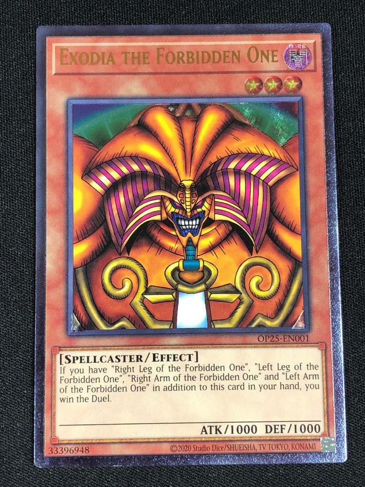 YUGIOH EXODIA THE FORBIDDEN ONE OP25-EN001 ULTIMATE NM ALL CARDS IN THIS AUCTION ARE IN NEAR MINT TO MINT CONDITION UNLESS STATED OTHERWISE IN THE TITLE. AND, YOU ARE GUARANTEED TO RECEIVE THE CARD NAMED IN THE TITLE. PLEASE NOTE, IF THERE'S MORE THAN 1 COPY AVAILABLE, YOU MAY NOT RECIEVE THE SAME EXACT CARD IN THE PHOTO. HOWEVER, IT WILL BE THE SAME EXACT CARD IN THE TITLE, AND DESCRIPTION! PLEASE CONTACT ME IF THERE IS ANYTHING WRONG WITH YOUR ORDER OR SHIPPING BEFORE LEAVING FEEDBACK. PLEASE GIVE ME A CHANCE TO FIX ANY PROBLEM YOU MAY HAVE. THANK YOU! Shipping Information: Shipping and Handling for this auction will be Free inside the United States - With Tracking! International Shipping Available Through Ebay’s Global Shipping Program. (BUYER IS RESPONSIBLE FOR ANY TAX) **Read the TITLE to see the condition of the cards Before you place a bid. Any damaged cards will be listed as such In The Title (FOR EXAMPLE: Blue Eyes White Dragon LOB-001 (HP) If it doesn't say anything about damage, it is in near-mint to mint condition. If you have any questions, message me Before you place your bid.** *PLEASE READ* Ebay's Card Condition Guidelines: (NM) = Near mint or better Comparable to a fresh pack Flaws may include Minor corner and edge wear (LP) = Lightly played (Excellent) Has clearly visible signs of wear Flaws may include Moderate edge chipping Moderate surface scuffing Fuzzy corners (MP) = Moderately played (Very good) Has moderate-to-heavy damage all over Flaws may include Moderate discoloration Moderate creasing Moderate to heavy edge chipping Rounding and soft corner (HP) = Heavily played (Poor) Is extremely worn and displays flaws all over Heavily Played condition cards exhibit signs of heavy wear. Heavily Played condition cards may include cards that have significant creasing, folding, severe water damage, heavy whitening, heavy border wear, and/or tearing. RETURN POLICY: RETURNS ARE ACCEPTED IF THE ITEM ARRIVES DAMAGED, OR NOT AS DESCRIBED. RETURNS ARE NOT ACCEPTED FOR BUYERS REMORSE. CHECK OUT MY OTHER AUCTIONS! _gsrx_vers_1677 (GS 9.8.1 (1677))