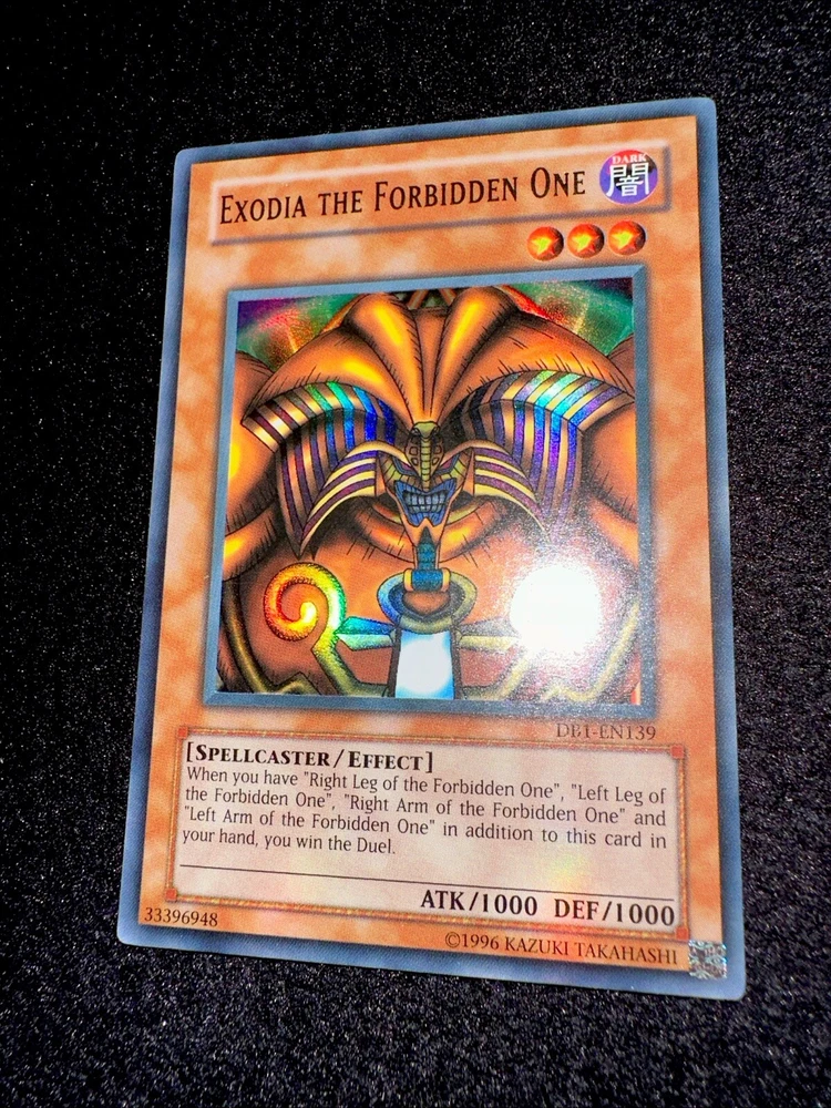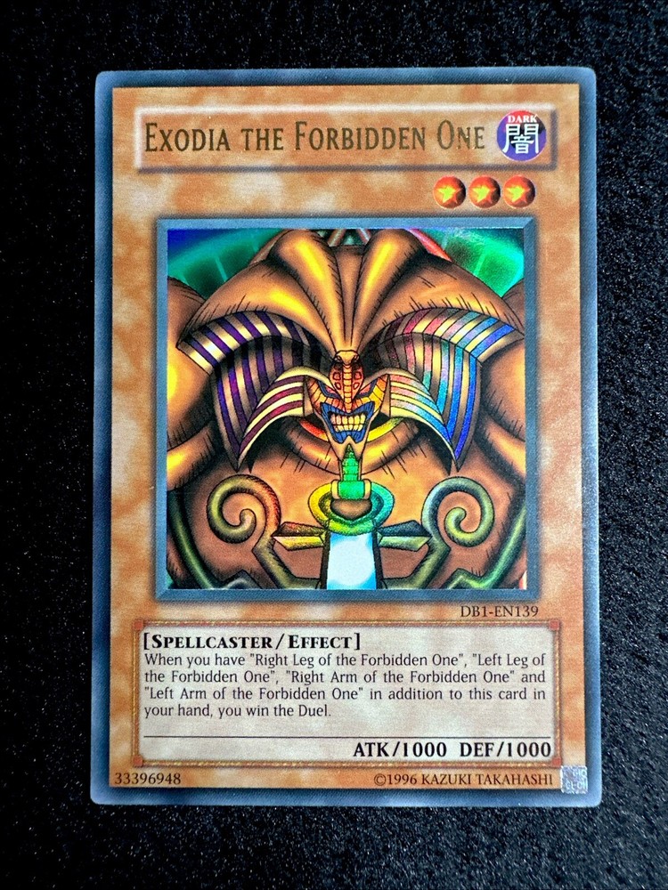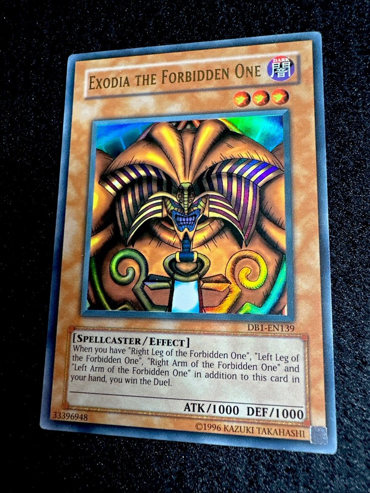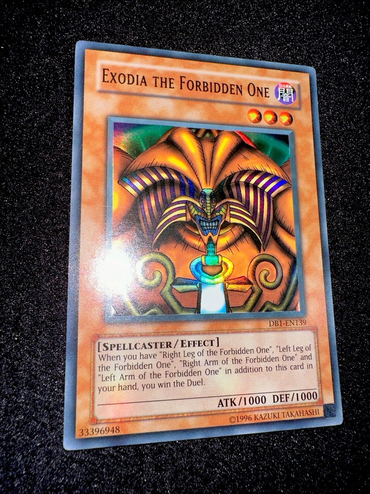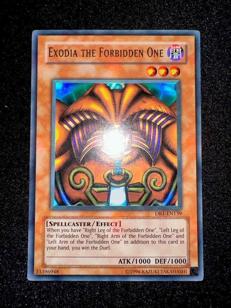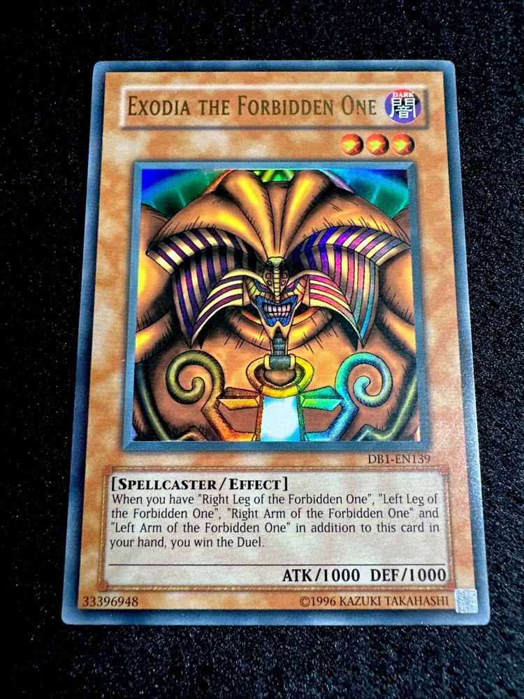🔥YUGIOH • EXODIA THE FORBIDDEN ONE • ULTRA RARE • DB1-EN139 • VLP🔥 Card Sleeve Included + Top Loader • Very Lightly Play Card • Authentic Konami USA Version YOU ARE GUARANTEED TO GET THE CARD NAMED IN THE TITLE. Thank you