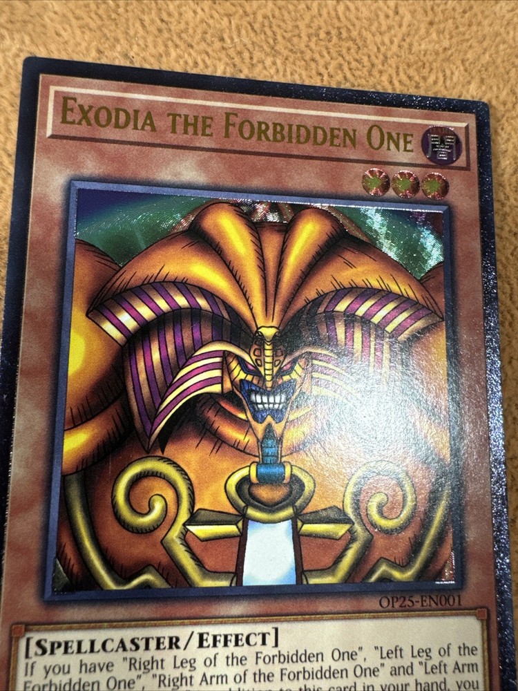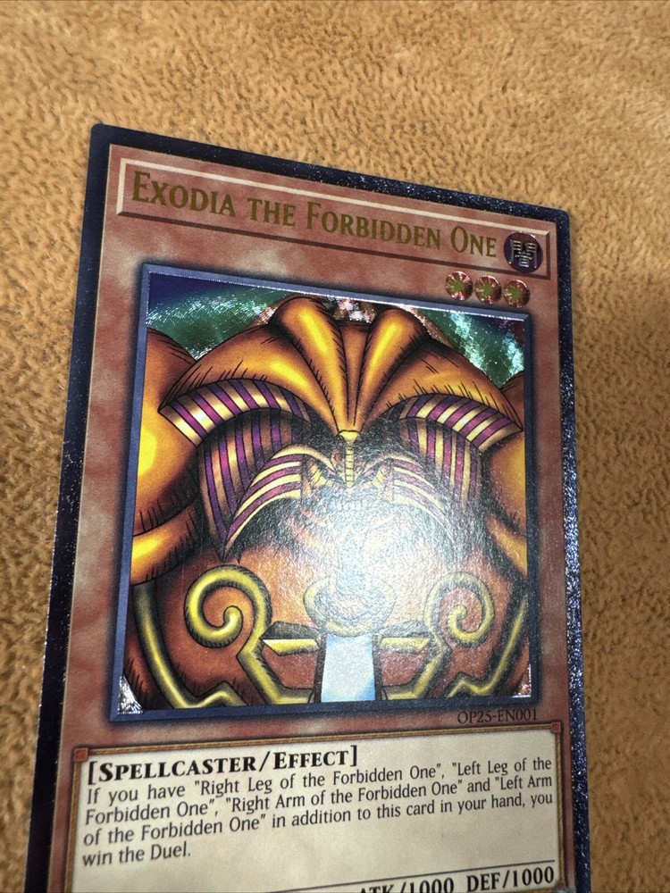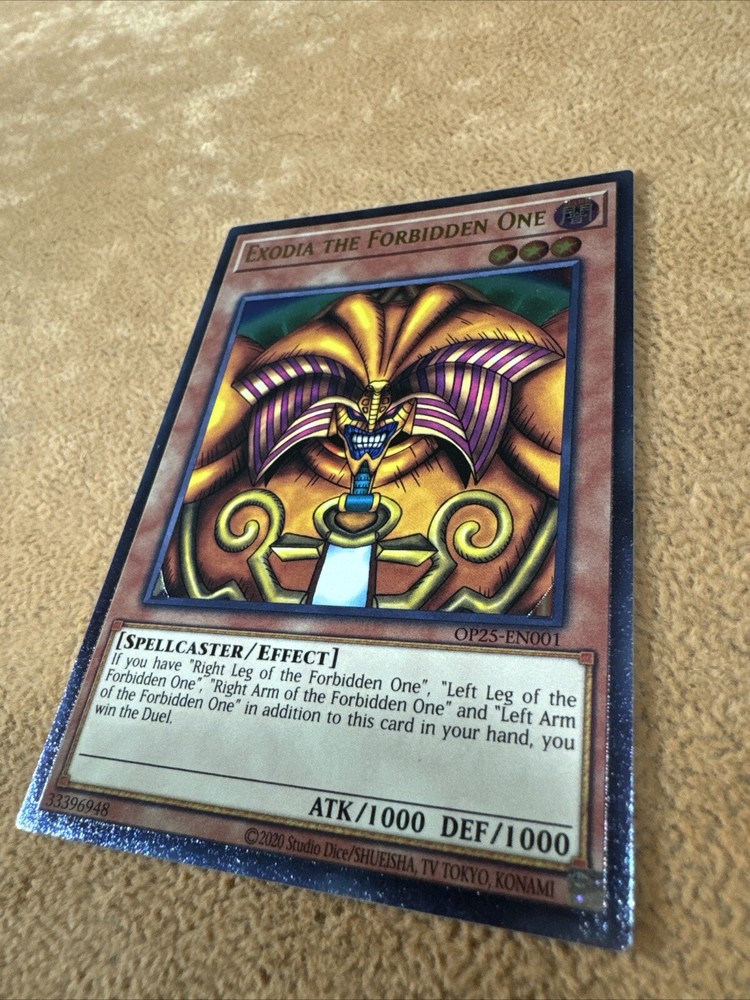 🔥 YUGIOH Exodia The Forbidden One OP25-EN001 ULTIMATE RARE NEAR MINT This card is the ultimate rare Exodia the Forbidden One from the Yu-Gi-Oh! TCG game. It is in excellent shape and has been well-maintained. The card is in English and is part of the Yugi set. It is a spellcaster creature/monster type and has an effect card type. The card is manufactured by Konami and is a must-have for any collector of rare cards. This item will be sent in a plastic sleeve/deck protector sleeve and in a toploader for maximum protection. Shipping is FREE! Payment is due immediately. The faster the payment the faster i'll ship out. Questions or comments?? Feel free to contact me. I'll get back to you within 24 hours. Check out my eBay store for more Yugioh items!