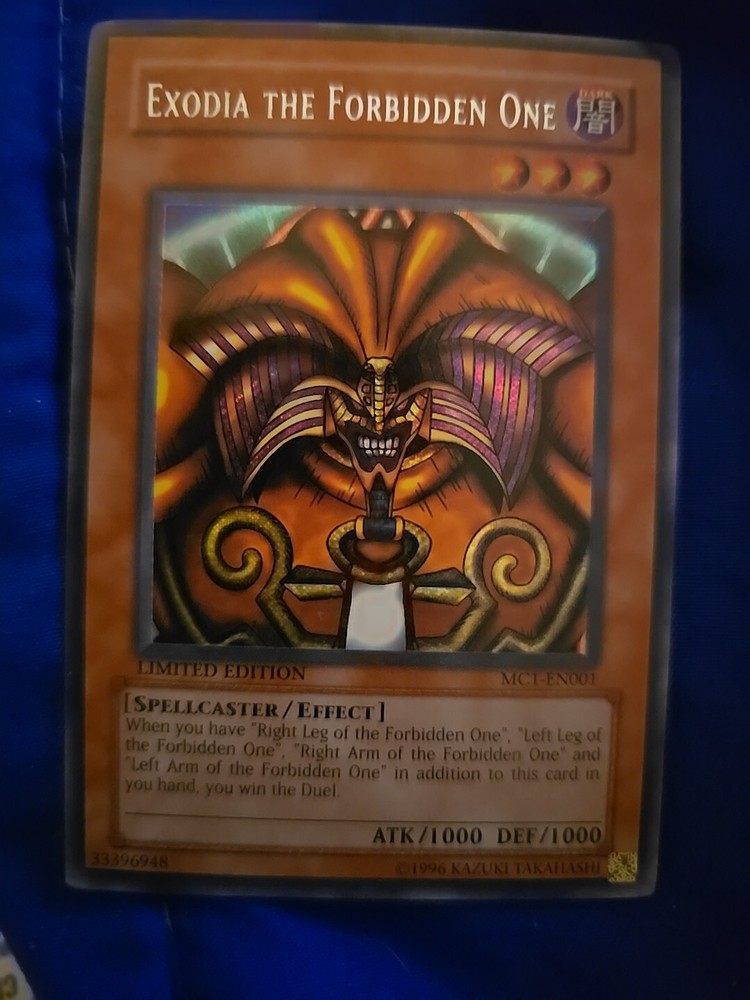 This is a rare and limited edition Exodia the Forbidden One card from the Yu-Gi-Oh! TCG game. It features a holographic finish and is made of high-quality card stock material. The card is part of the Master Collection Volume 1 set and has the card number MC1-EN001. This card is a must-have for any collector or player of the Yu-Gi-Oh! TCG game. It is an Effect card with a Spellcaster creature type and has a defense/toughness of 1000 along with an attack/power of 1000. The card is in English language and is manufactured by Konami. Get your hands on this secret rare card and add it to your collection today!