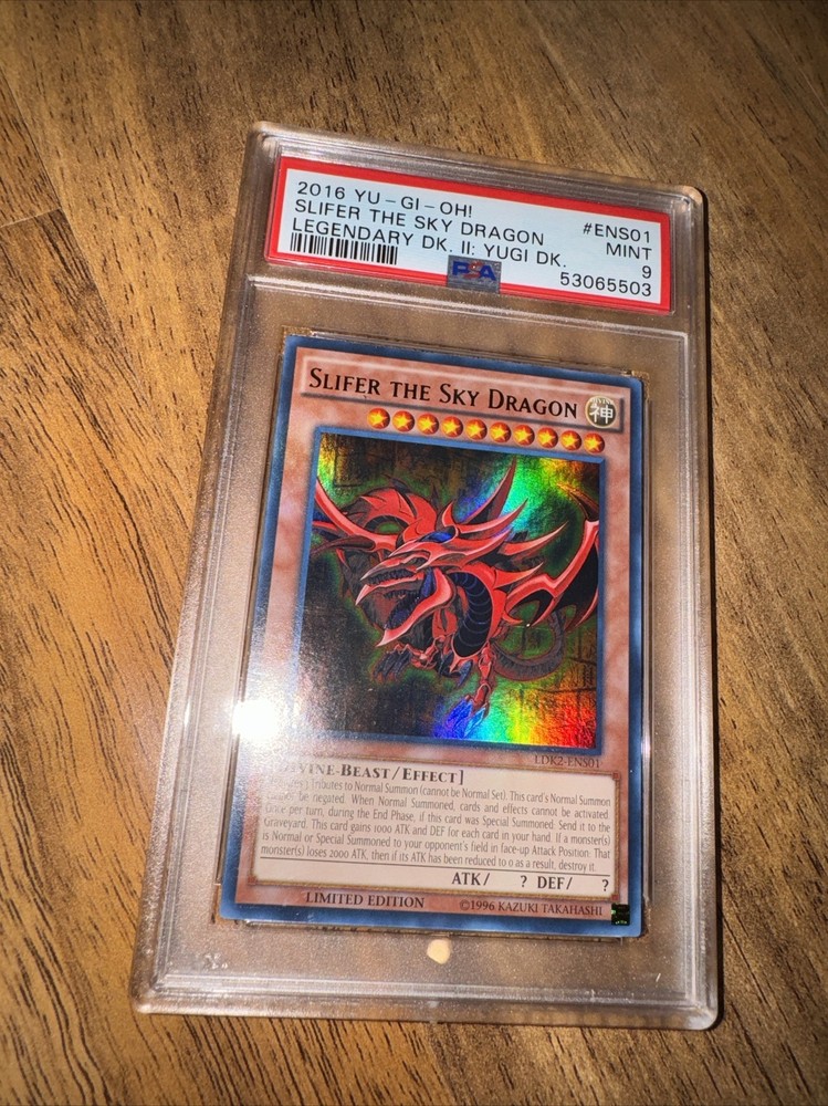 This Yu-Gi-Oh! TCG card is a highly sought-after Ultra Rare Slifer The Sky Dragon from 2016. It has been professionally graded by the reputable Professional Sports Authenticator (PSA) with a grade of 9, ensuring its mint condition. This collectible card is a must-have for any serious collector and a great addition to your collection. Don't miss out on the opportunity to own this rare piece.