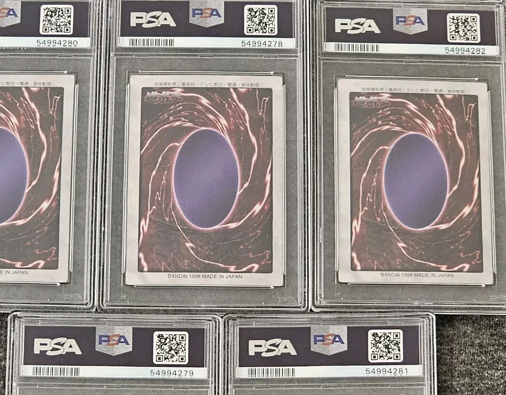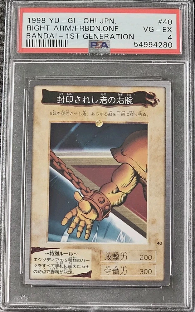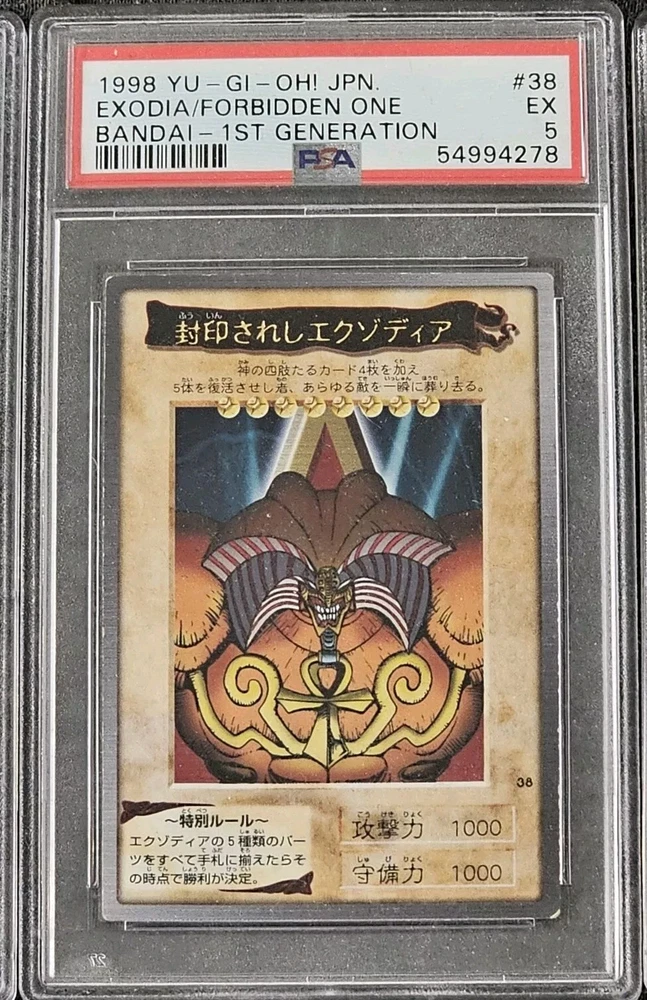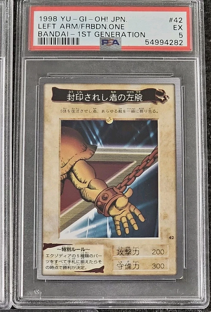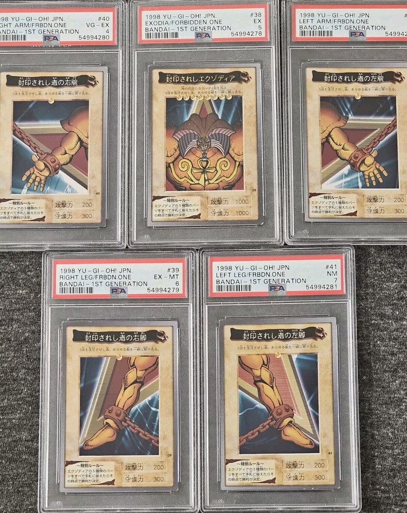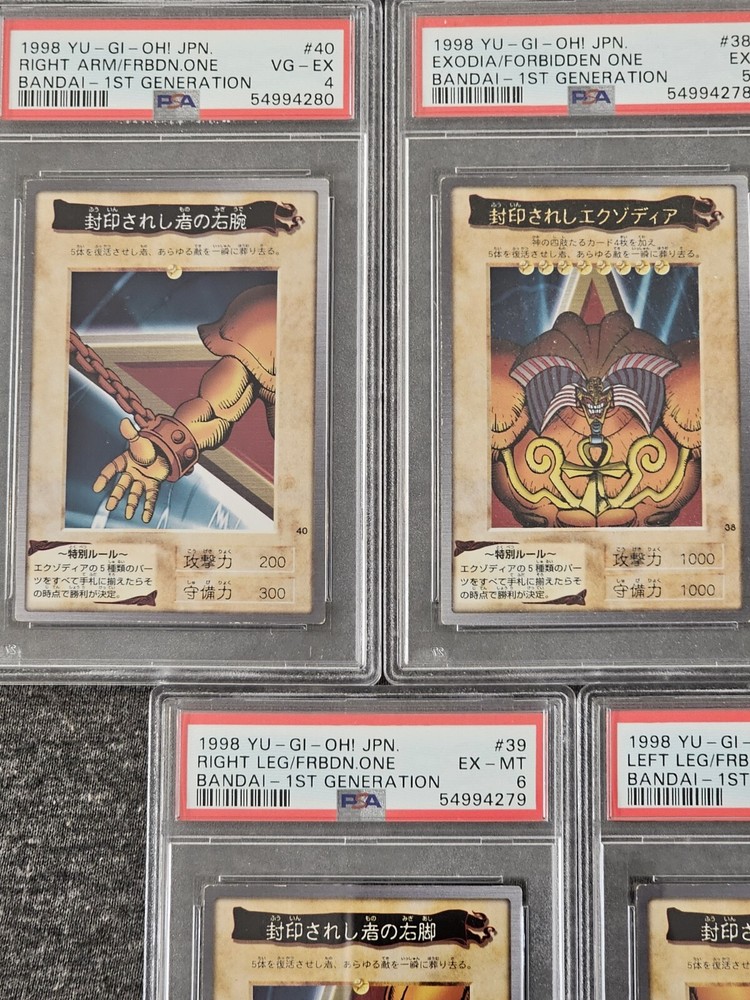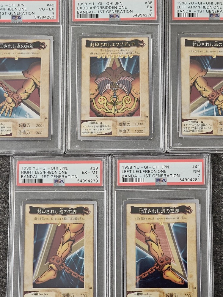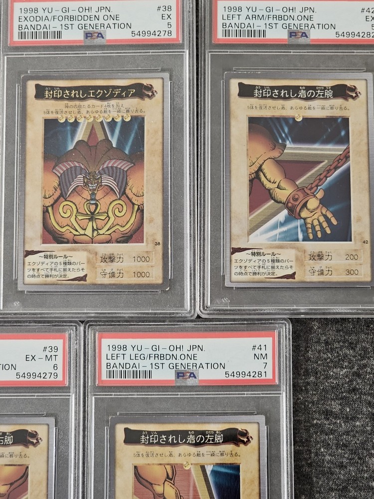 YU-GI-OH! PSA JAPAN 1998 1st Generation EXODIA THE FORBIDDEN ONE All 5 Set With Sequential Serial Numbers: #1) - EXODIA PSA Graded 5 #54994278 #2) - RIGHT LEG PSA Graded 6 #54994279 #3) - RIGHT ARM PSA Graded 4 #54994280 #4) - LEFT LEG PSA Graded 7 #54994281 #5) - LEFT ARM PSA Graded 5 #54994282 If you have any questions, please feel free to ask, and thank you for looking.