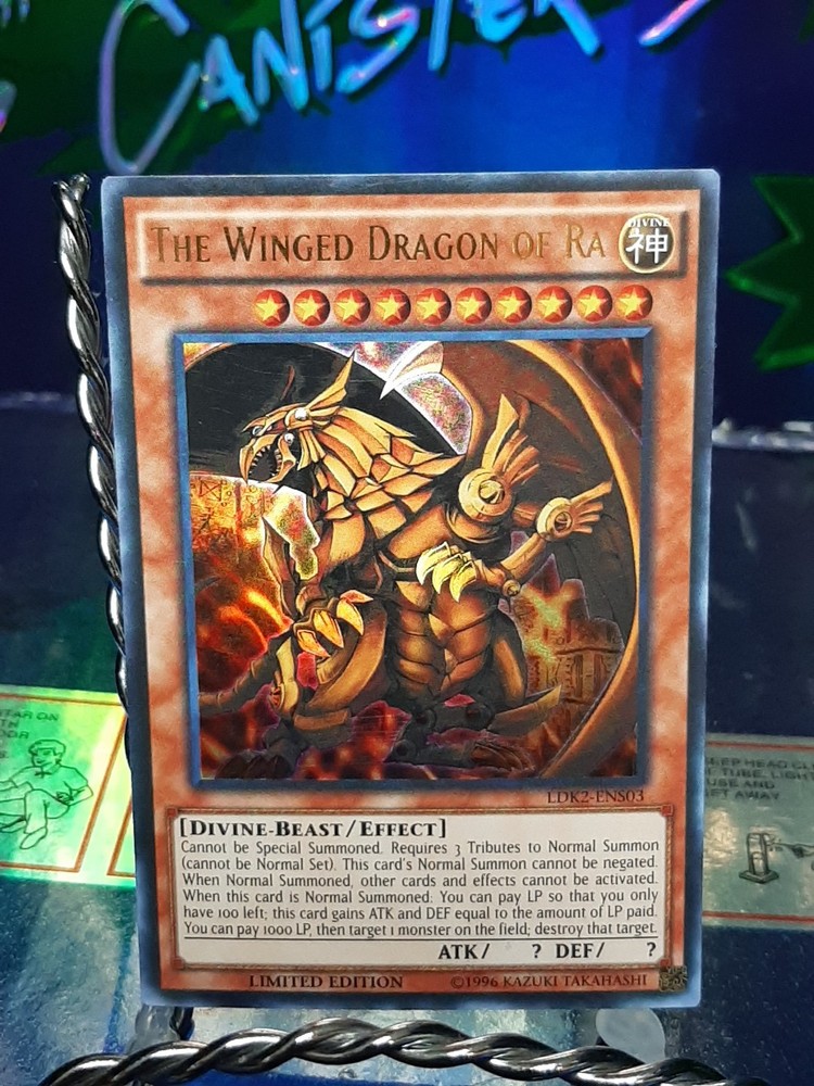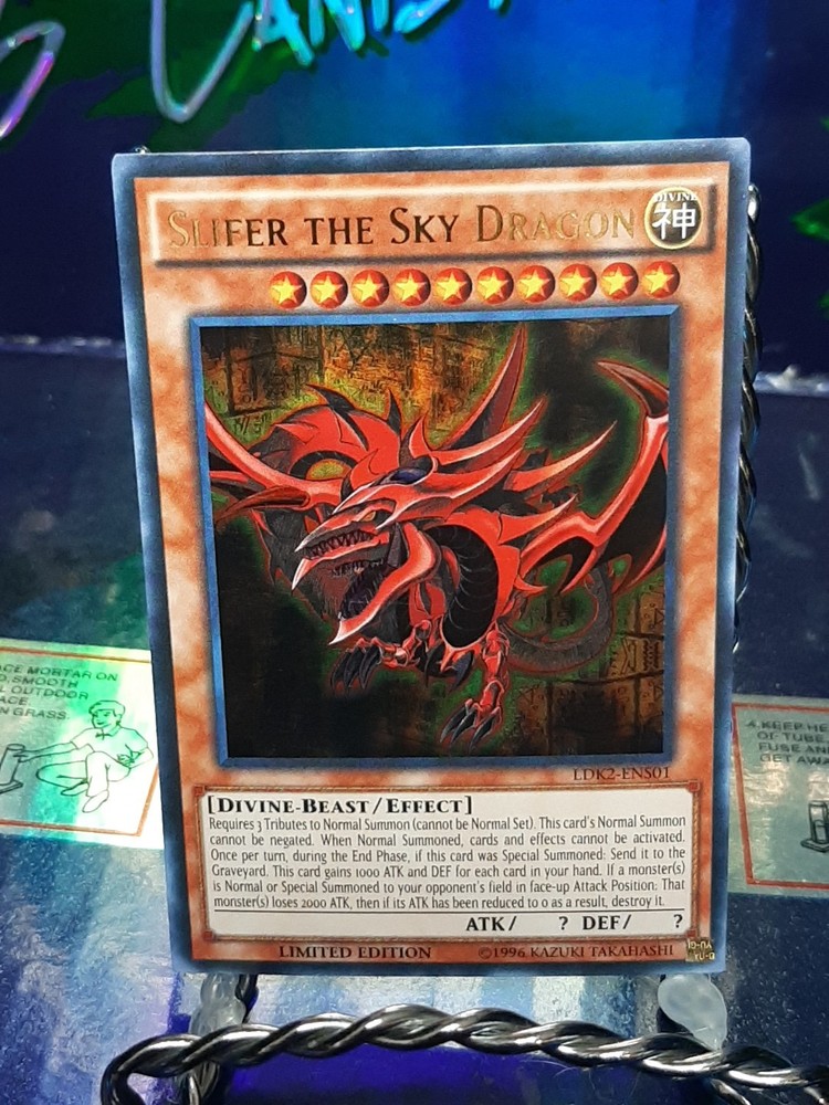 The product is a Yu-Gi-Oh! Trading Card Game card featuring Slifer The Sky Dragon from the 2016 set. Specifically, it is an Ultra Rare card with the card number 02/03. The set also includes cards for Obelisk and Ra, making it a sought-after collection for fans of the game. This card holds value within the trading card game community due to its rarity and iconic character representation.