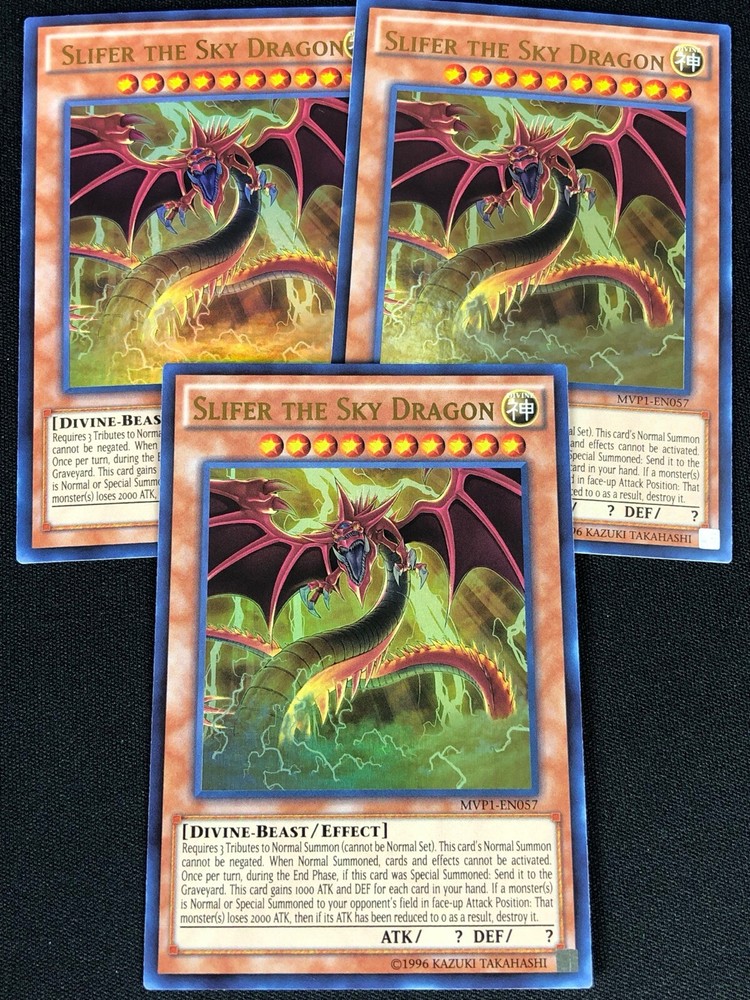 YUGIOH SLIFER SKY DRAGON MVP1-EN057 ULTRA X3 (NM) ALL CARDS IN THIS AUCTION ARE IN NEAR MINT TO MINT CONDITION UNLESS STATED OTHERWISE IN THE TITLE. AND, YOU ARE GUARANTEED TO RECEIVE THE CARD NAMED IN THE TITLE. PLEASE NOTE, IF THERE'S MORE THAN 1 COPY AVAILABLE, YOU MAY NOT RECIEVE THE SAME EXACT CARD IN THE PHOTO. HOWEVER, IT WILL BE THE SAME EXACT CARD IN THE TITLE, AND DESCRIPTION! PLEASE CONTACT ME IF THERE IS ANYTHING WRONG WITH YOUR ORDER OR SHIPPING BEFORE LEAVING FEEDBACK. PLEASE GIVE ME A CHANCE TO FIX ANY PROBLEM YOU MAY HAVE. THANK YOU! Shipping Information: Shipping and Handling for this auction will be Free inside the United States - With Tracking! International Shipping Available Through Ebay’s Global Shipping Program. (BUYER IS RESPONSIBLE FOR ANY TAX) **Read the TITLE to see the condition of the cards Before you place a bid. Any damaged cards will be listed as such In The Title (FOR EXAMPLE: Blue Eyes White Dragon LOB-001 (HP) If it doesn't say anything about damage, it is in near-mint to mint condition. If you have any questions, message me Before you place your bid.** *PLEASE READ* Ebay's Card Condition Guidelines: (NM) = Near mint or better Comparable to a fresh pack Flaws may include Minor corner and edge wear (LP) = Lightly played (Excellent) Has clearly visible signs of wear Flaws may include Moderate edge chipping Moderate surface scuffing Fuzzy corners (MP) = Moderately played (Very good) Has moderate-to-heavy damage all over Flaws may include Moderate discoloration Moderate creasing Moderate to heavy edge chipping Rounding and soft corner (HP) = Heavily played (Poor) Is extremely worn and displays flaws all over Heavily Played condition cards exhibit signs of heavy wear. Heavily Played condition cards may include cards that have significant creasing, folding, severe water damage, heavy whitening, heavy border wear, and/or tearing. RETURN POLICY: RETURNS ARE ACCEPTED IF THE ITEM ARRIVES DAMAGED, OR NOT AS DESCRIBED. RETURNS ARE NOT ACCEPTED FOR BUYERS REMORSE. CHECK OUT MY OTHER AUCTIONS! _gsrx_vers_1680 (GS 9.8.3 (1680))