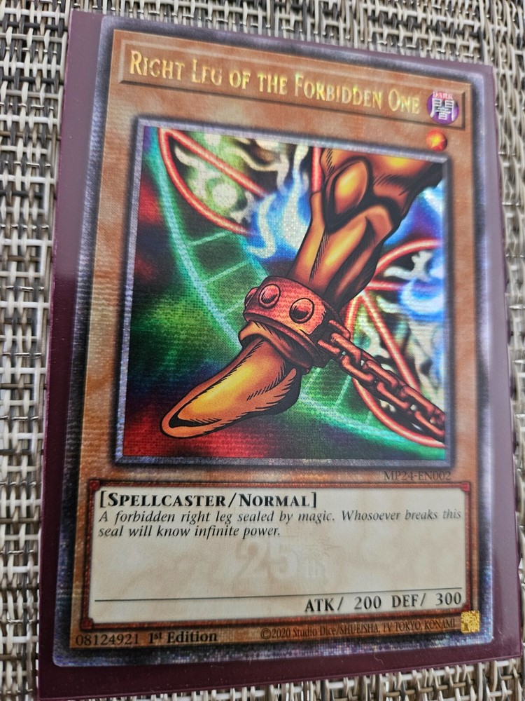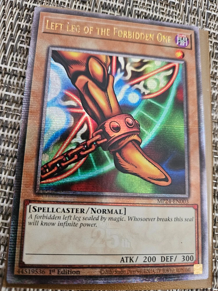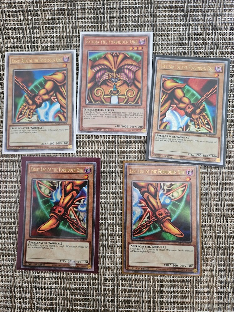 You will receive the 5-piece (Quater Century Secrete Rare) Exodia the Forbidden set in near-new condition. (TN23-EN002, MP24-EN002, MP24-EN003, MP24-EN004, and MP24-EN005) I'll also include a bonus! eBay doesn't allow me to set a flat shipping rate (or I don't know how to because I'm new), so I can't lower or view international shipping price. Shipping will be a envelope. Feel free to message me.