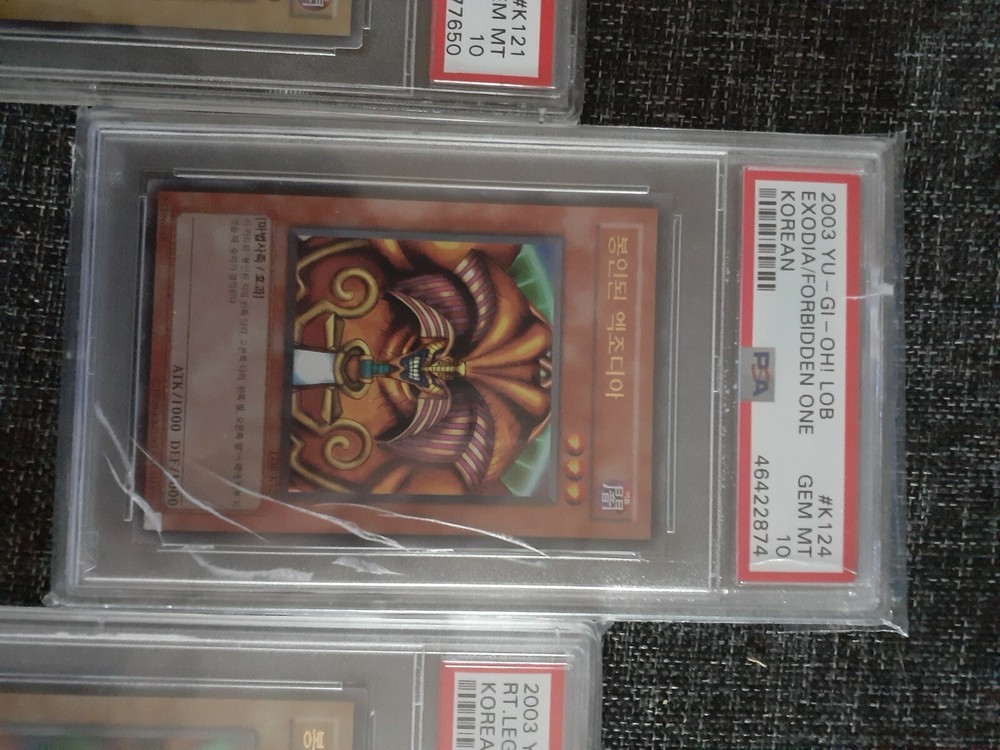 yugioh psa graded 10 gem mint bundle As you see in the pics its korean exodia all 4 pieces are from the same set LOB theres 3 cards graded 10-9 and 1 piece is have not yet got graded The heads case does have damage to it but the card is still in mint condition all the cards went from pack to sleeve.. Will ship with care and tracking