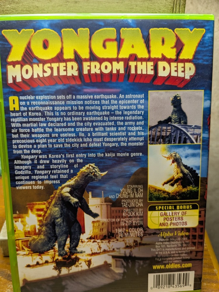 The "Yongary: Monster From the Deep" DVD, released in 1967 by Alpha Video, features a classic sci-fi monster movie directed by Ki-Duk Kim. The film follows the story of a monster with a horn, created by a scientist to restore the ocean, but instead unleashes chaos and terror. The DVD includes a gallery of posters and photos, making it a must-have for fans of Kaiju and creature/monster genres. With a sleek green case and a standard edition format, this movie is a timeless classic that will keep you entertained for hours.