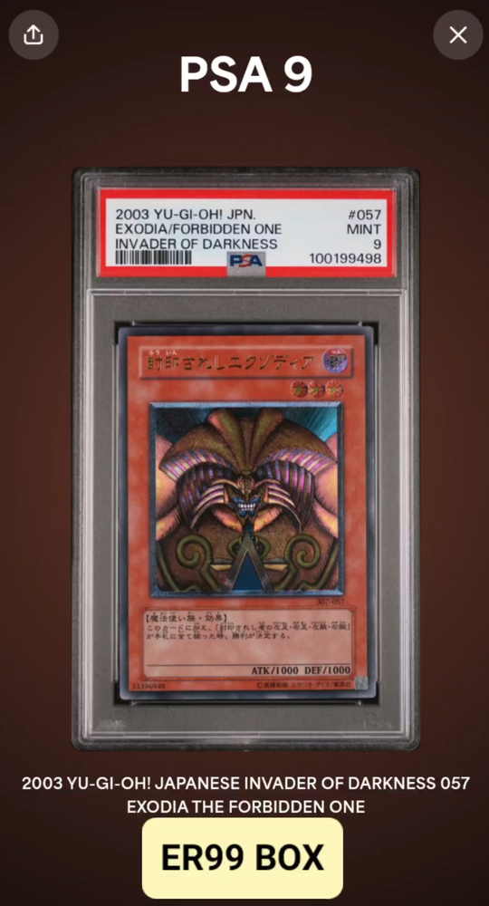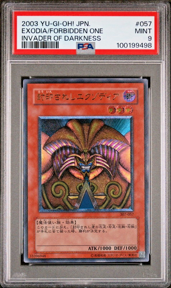 This Yu-Gi-Oh! TCG card is a 2003 iconic and must have - Exodia The Forbidden One from the Vintage Japanese set " Invader Of Darkness" in a PSA 9 MINT grading. It features one of the most powerful card of Yami Yugi from the Yu-Gi-Oh TV Show , with a super special Ultimate Rare rarity foil. This OG card is A MUST HAVE for any Yu-Gi-OH! and Exodia collectors with its unique features and history. This card is exactly what you need for your collection! Get your hands on this highly sought-after card today! Uniqueness: * 1st ever Ultimate Rare * Long time Icon & Mascot of Yu-Gi-oh TCG * PSA 9 MINT. Shipping policy: * Each order is sent in a secure case with top-loading protection, cushioned by foam, and packaged in a box with a tracking number for monitoring. * I provide additional insurance free of charge for orders over $500. Thank you for taking an interest in my treasured collection. Wishing you a successful bidding & buying experience! ᵔᴗᵔ * If you enjoy my store and want to stay updated with the latest additions, don't forget to ♡ Save Seller : https://www.ebay.com/str/er99box . Haim, ER99 BOX