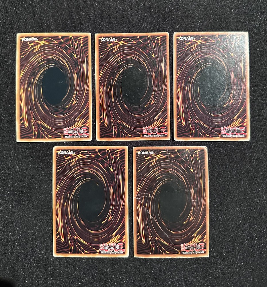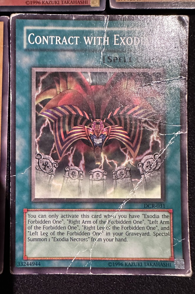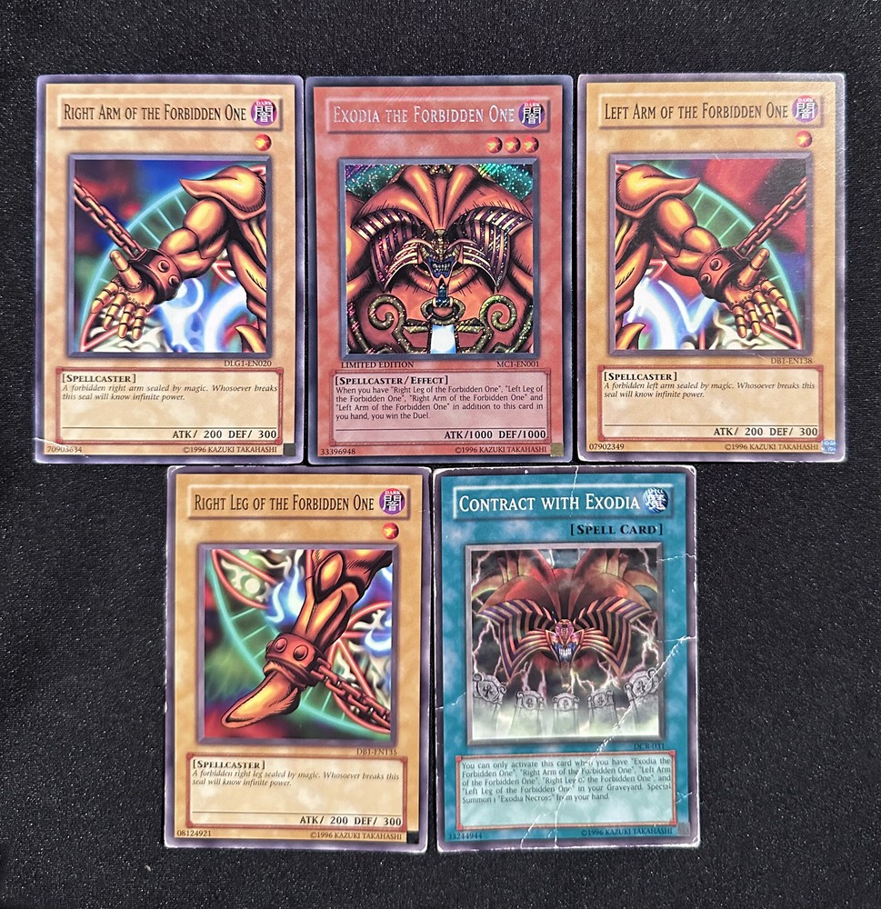This is a collection of five Yu-Gi-Oh! cards that include Exodia the Forbidden One, Exodia's Right Arm, Left Arm, and Right Leg, and Contract with Exodia. The Exodia the Forbidden One card is holographic and limited edition; the other four are non-holographic. The Exodia's Right Arm card has a crease near the bottom-left corner and the Contract with Exodia card shows heavy signs of wear, and the other three cards show minor signs of wear, but are in good condition otherwise. Seller does not accept returns.