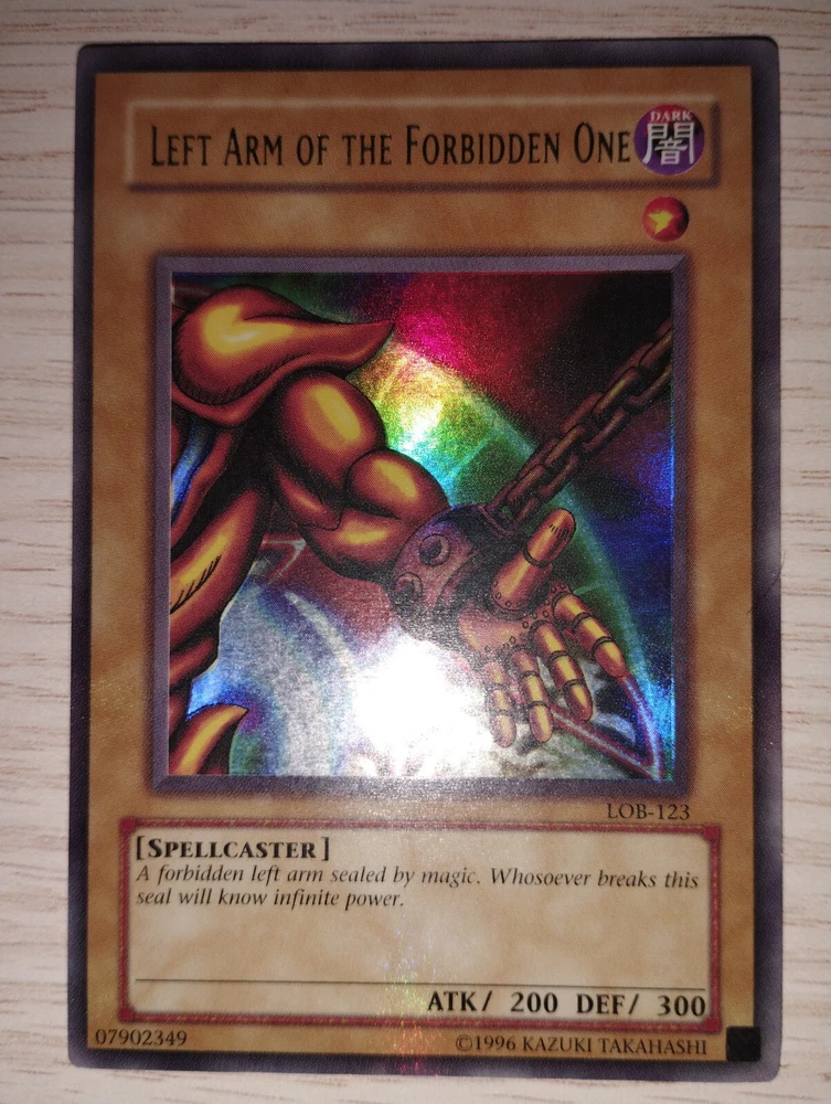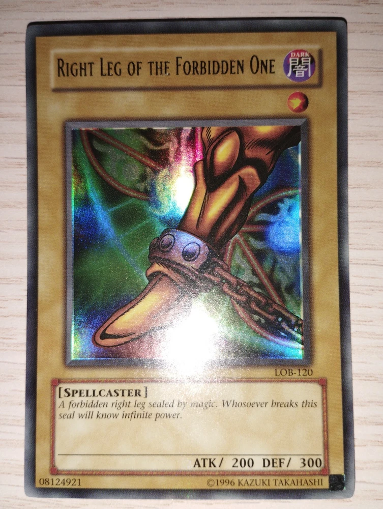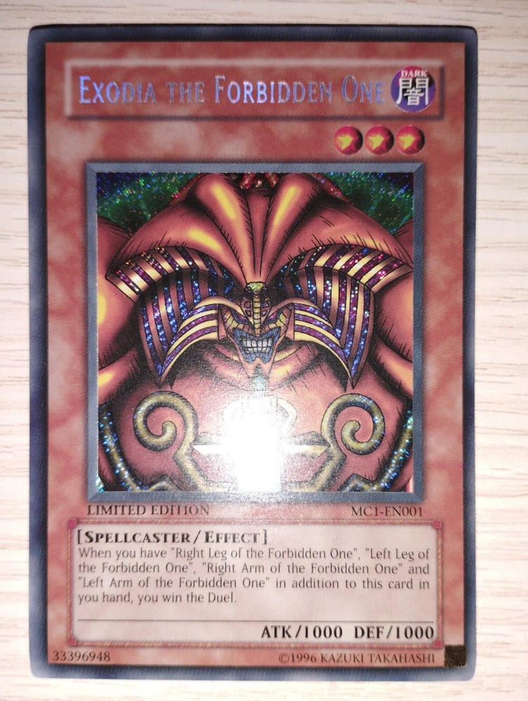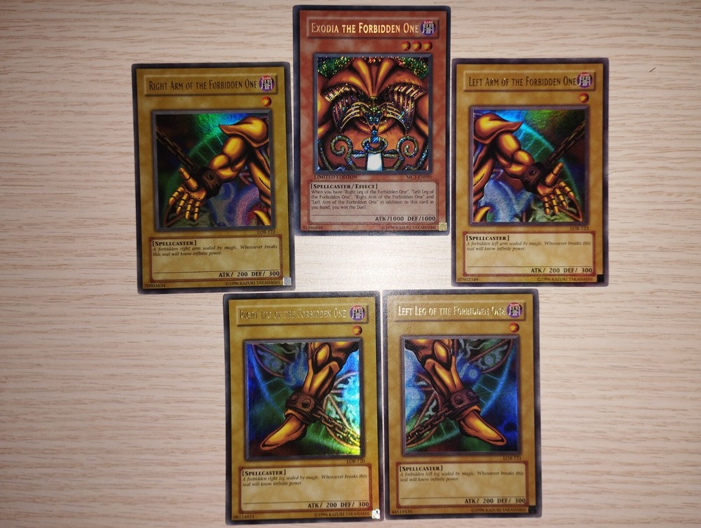 These are 100% authentic Yu-Gi-Oh cards! A total of 5 cards : Exodia the Forbidden One MC1-EN001 Near Mint Limited Edition Right Leg of the Forbidden One LOB-120 Near Mint Old Unlimited Edition Left Leg of the Forbidden One LOB-121 Near Mint/ Light Played Old Unlimited Edition (light scratches) Right Arm of the Forbidden One LOB-122 Light Played Old Unlimited Edition Left Arm of the Forbidden One LOB-123 Light Played/ Played Old Unlimited Edition (has a small crease as seen on the additional photo) The cards in photos are the ones you will receive. Shipping is FREE first class REGISTERED mail international with tracking number. It will be shipped carefully packed. If there are any questions feel free to ask.