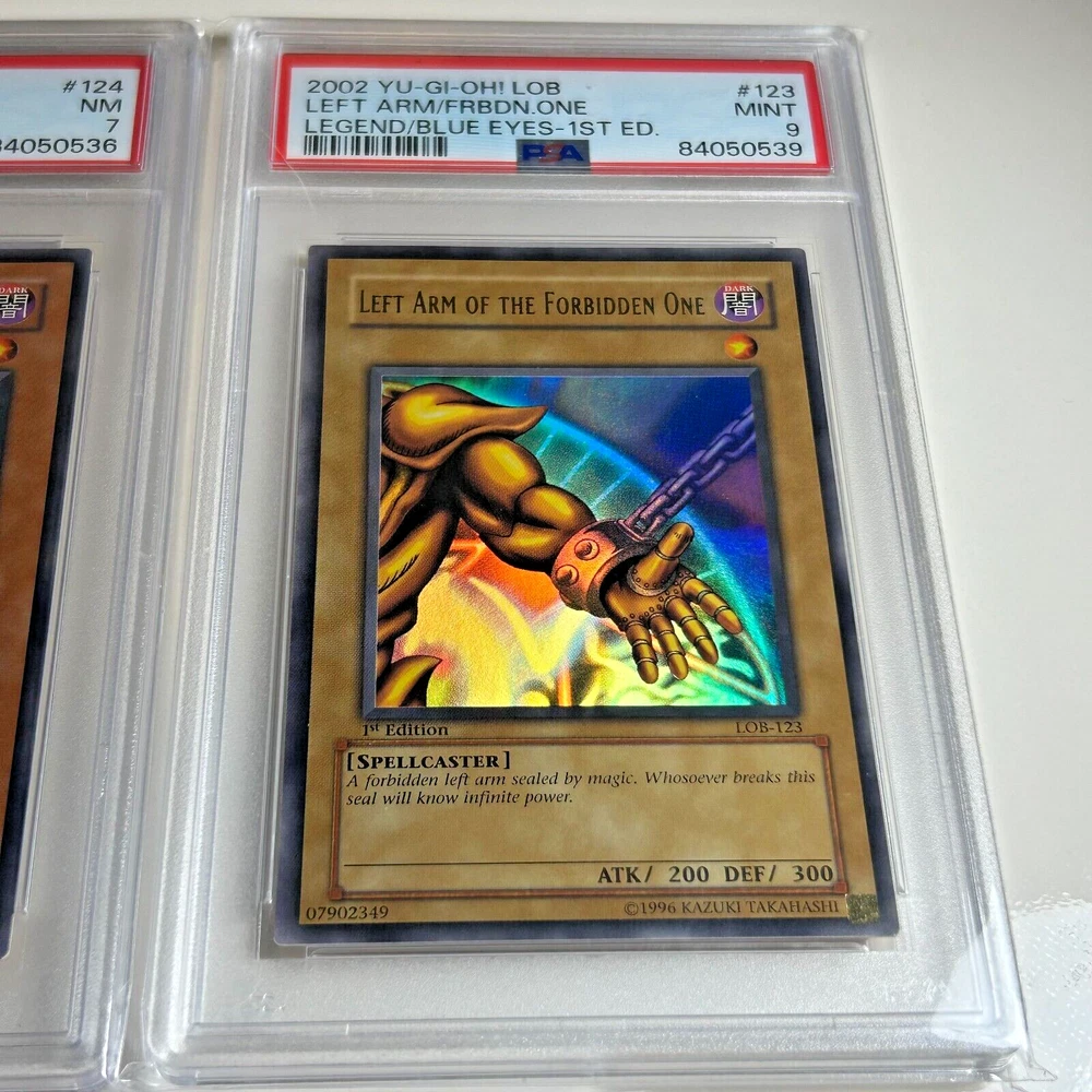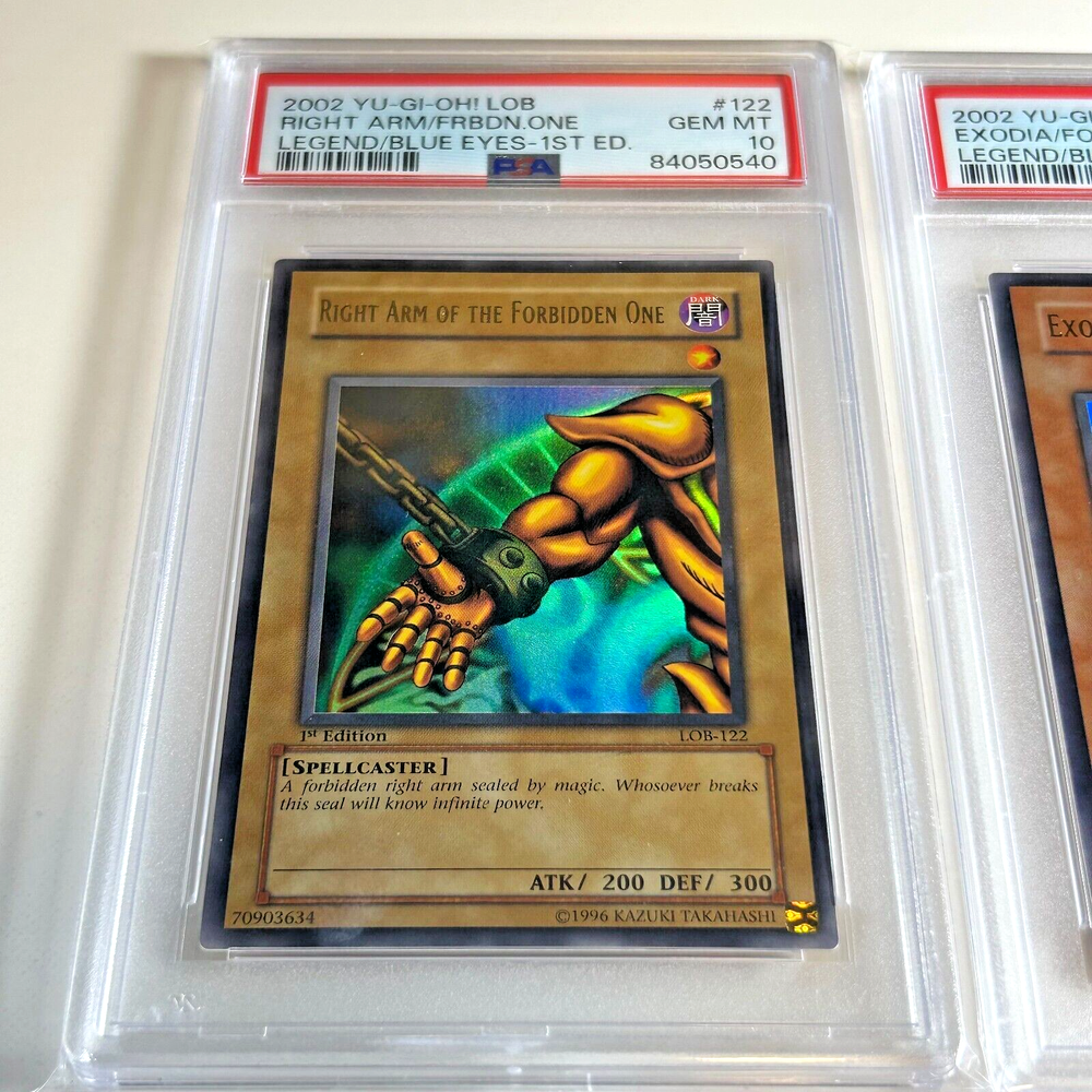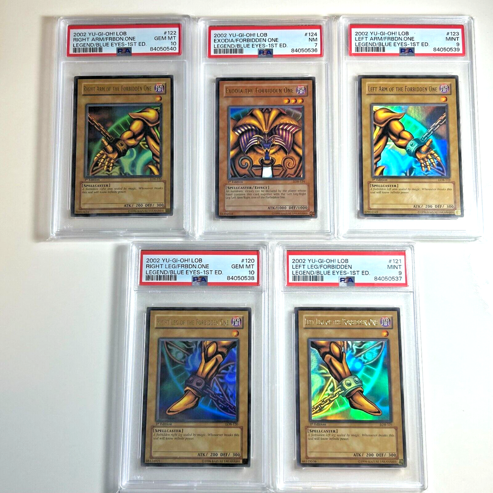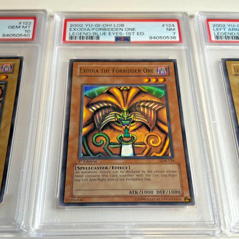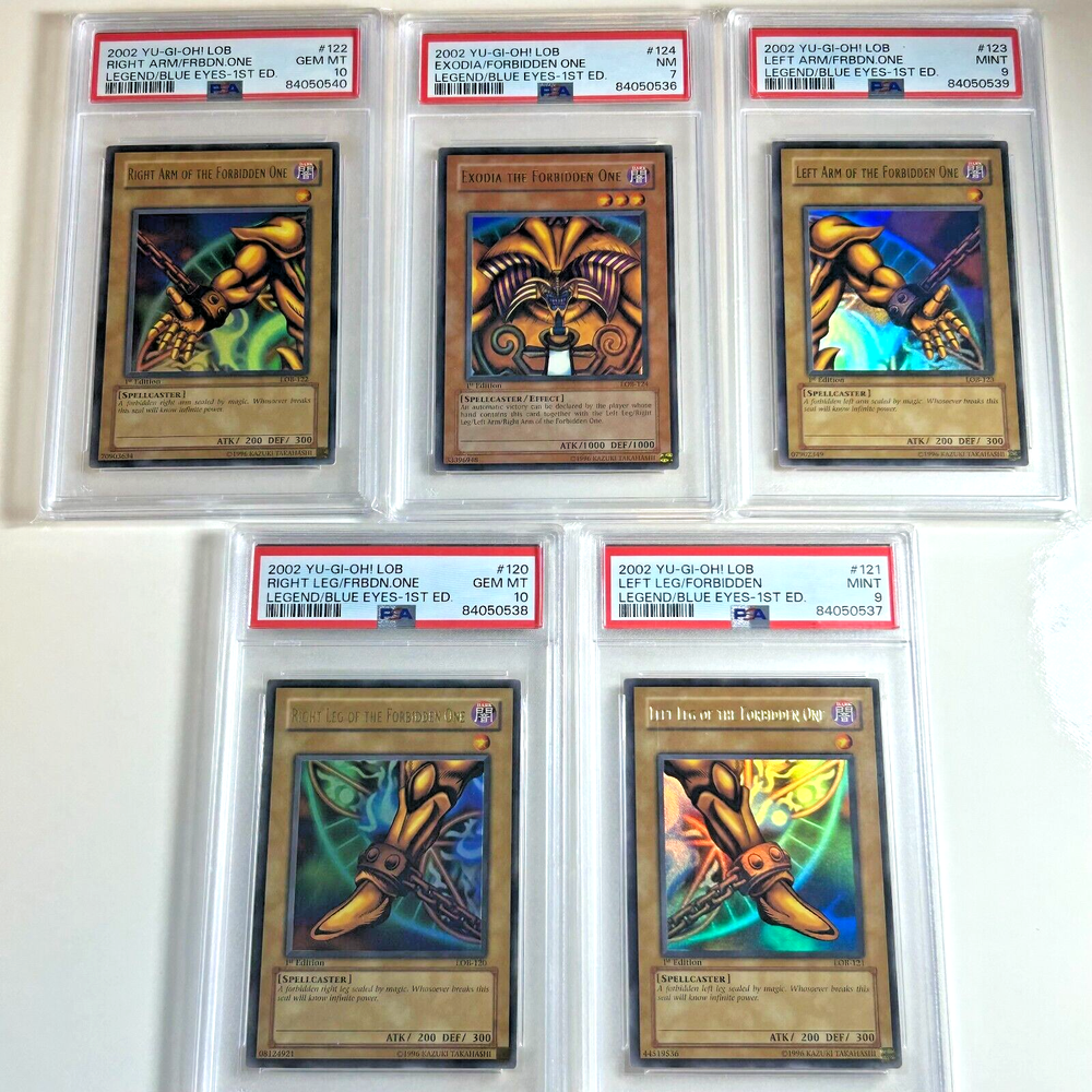 PRODUCT INFORMATION This listing is for the Full Exodia The Forbidden One 1st Edition Yu-Gi-Oh! card set , sequentially graded from PSA 84050536 - 84050540. Exodia The Forbidden One (Head) graded PSA 7 - POP 60 Left Arm Of The Forbidden One graded PSA 9 - POP 163 Right Arm Of The Forbidden One graded PSA 10 - POP 75 Left Leg Of The Forbidden One graded PSA 9 - POP 145 Left Leg Of The Forbidden One graded PSA 10 - POP 72 Please carefully check the condition of the item from the photos as we have a no refund/exchanges policy. We are not professional graders, but we will give an honest condition grade based on our experience. We will not accept returns or offer any partial refunds for card condition. We do our best to show all aspects of the card condition, you as the buyer must take the time to review all photos, item specifics and description to ensure these are the right card for you. If you need more photos, feel free to contact us. All our products are 100% authentic. SHIPPING & DELIVERY PSA Slab Shipping Rates: North America (Canada/USA): 3-10 Business Days (Canada Post 1x Shipping Box + Bubble - Tracked Registered Mail - CAD $100) International: 3-15 Business Days (Canada Post 1x Shipping Box + Bubble - Tracked Registered Mail - CAD $100.00 - Customs & Duties not included) We strive to send your order out within 1 BUSINESS DAY after payment confirmation is received. Please keep in mind that the post office is closed on all statutory holidays and weekends in Canada. Delivery is typically within 10-15 working days for most Countries. Additional days may incur for any delays, handling, or checks. If you do not receive your item within 3-4 weeks, please contact us and we will work towards a resolution for you. International buyer’s are responsible for ANY/ ALL import duties & taxes. ITEM PROTECTION GUARANTEE Your Card(s) will be protected in sleeves (for singles) Placed in or against a Card Saver 1 top-loader to avoid breaking (for singles) Wrapped again in a sealed Team Bag cover (including slabs) Sealed in bubble wrap envelope / shipping box for additional protection If you purchase multiple items, we will ship them together as much as possible ABOUT US We are a father-son duo based out of Toronto Canada and have been avid collectors since 1999. We hope you enjoy these cards as much as we do. DEAR CUSTOMERS If you were happy with your purchase, please leave us a positive feedback and introduce us to your friends! If you have any issues or concerns, please do not hesitate to contact us!