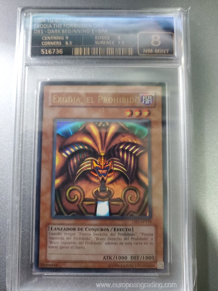Yu-Gi-Oh! Exodia The Forbidden One Spanish - Exodia El Prohibido Español GRADED CARD EUROPEAN GRADING EG. Certificado Gradeo: https://www.europeangrading.com/es/card-verifier?certificate=516736 Carta Gradeada por European Grading (EG) Card Graded by European Grading (EG) Se envía en un sobre de burbujas totalmente protegido y por correo certificado. It will be sent in a bubble envelope wrapped totally protected and by registred insurance shipping. Mis 100 % de votos positivos son mi garantía y te avalan. My 100 % positive feedback is my guarantee and endorse me. Si tienes cualquier pregunta, mándame un mensaje. Se aceptan ofertas. Se envía a todo el mundo. If you have any question, don't hesitate to send me a message. Offers are accepted. Woldwide shipping. #tags: tace, ark, bccg, bgs, bcg, cga, cgc, gma, gsg, hga, isa, ksa, mnt, eg, european, grading, pgs, pcg, pca, psa, rcg, sgc, tag, tcg, ocg,