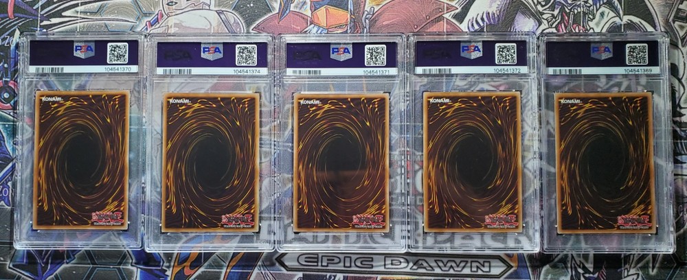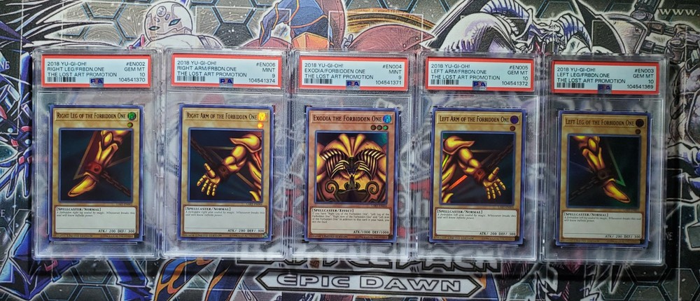 The product is a set of 5 English language Yu-Gi-Oh! TCG cards featuring "Exodia The Forbidden One" from the Yugi set. These cards are Promo cards with the Lost Art design. They are manufactured by Konami and are Effect type cards. The set includes all cards graded PSA 9-10. Suitable for ages 10 and up, this set is a valuable addition for collectors and fans of the game.