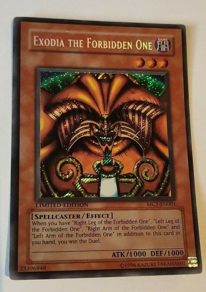 Ich verkaufe hier die englische Yu-Gi-Oh! Karte Exodia, The Forbidden One in Secret Rare aus der Master Collection Volume 1 und die deutschen Exodiateile (linker Arm, linkes Bein, rechter Arm, rechtes Bein) in Common aus Dark Beginning 1 von 2004 in gebrauchtem Zustand - siehe Fotos. Die Karten werden in einer Hülle versendet. Privatverkauf, keine Garantie, keine Rücknahme Auf meinem Profil biete ich außerdem noch diverse andere Sammelkarten an.