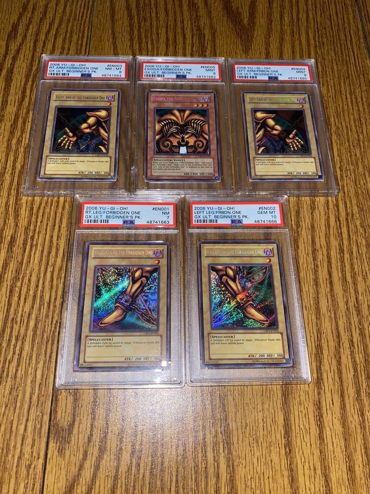 This listing is for the rare UBP1 set of Exodia. This set is right up there with the LOB set. All cards are PSA graded and secret rare. Exodia the forbidden one - PSA 9 population 5 Right Arm - PSA 8 population 3 Left Arm - PSA 9 population 6 Right Leg - PSA 7 population 2 Left Leg - PSA 10 population 4 These cards rarely come available on eBay raw and never show up graded. That being said, there’s no market to base prices off of. Please contact me with offers and questions. Thanks :)