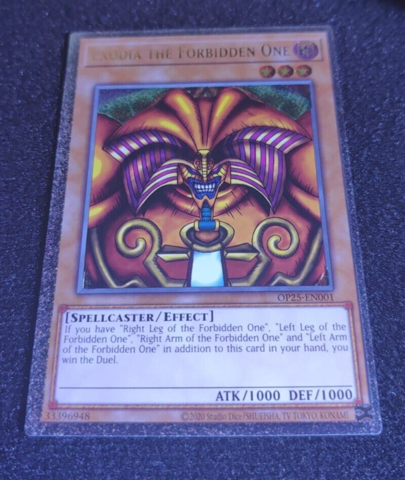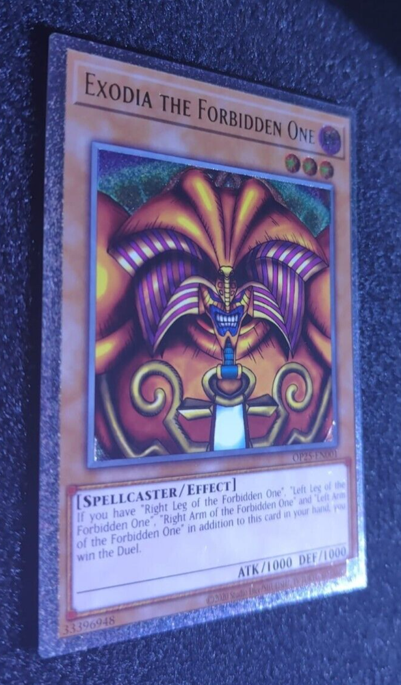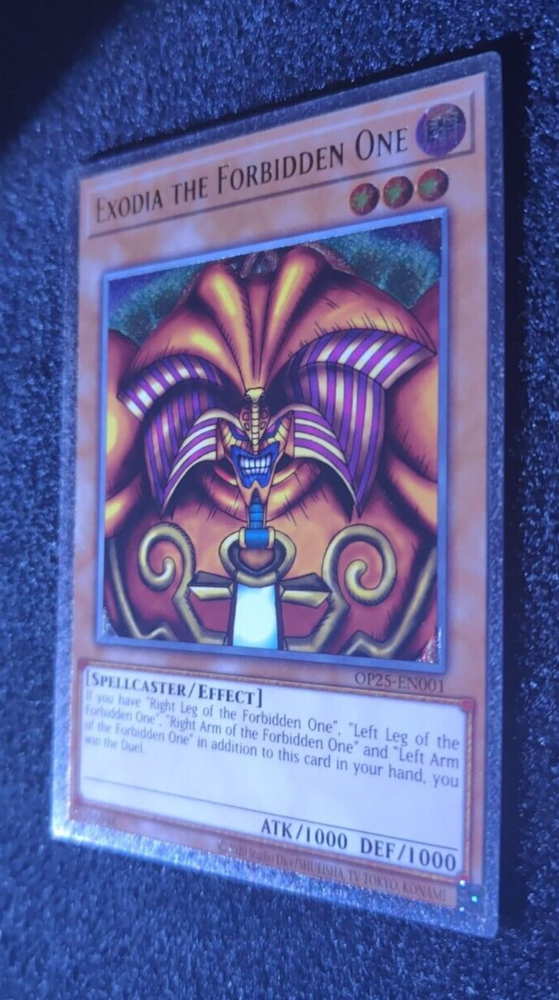 This Yu-Gi-Oh! TCG card is a must-have for any collector. The Exodia the Forbidden One card is a rare find, featuring a spellcaster creature type, dark colour, and Japanese card size. This Ultimate Rare card OP25-EN001 is in excellent condition, made of sturdy card stock material. The card, manufactured by Konami, is in English language and has a high rarity value. Its card condition type is 4000, making it a valuable addition to any collection. Don't miss out on the opportunity to add this sought-after card to your Yu-Gi-Oh! collection.