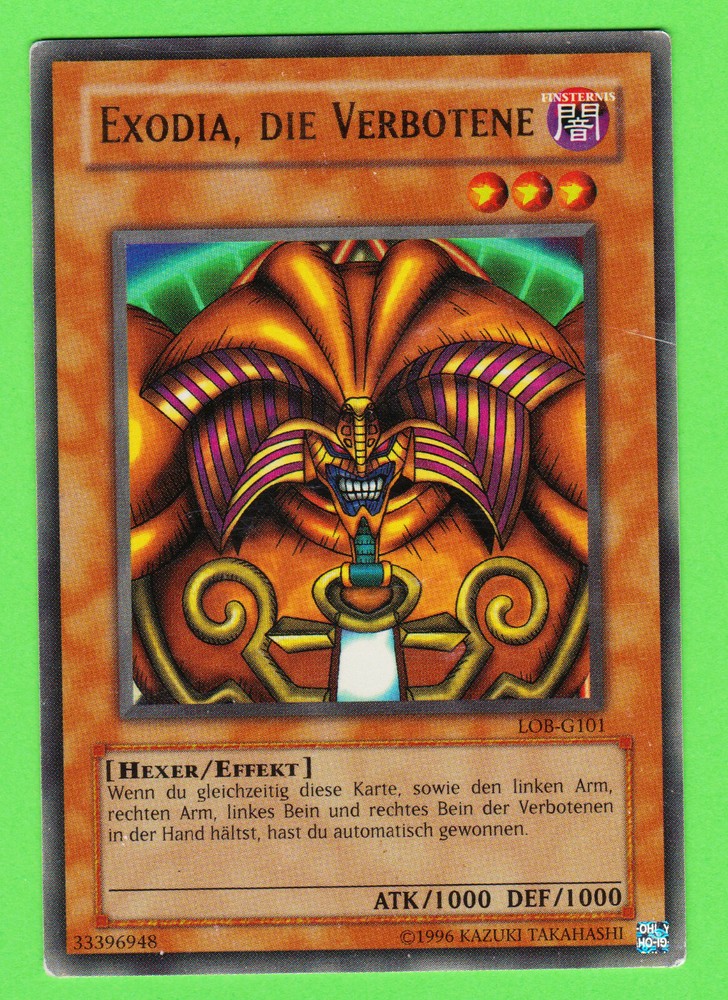 Verkaufe ein deutsches Exemplar Exodia the Forbidden One aus Legend of Blue-Eyes White Dragon. Die Karte mittelschwer bis schwer bespielt. Die Mängel bestehen aus wenigen Kratzern und leicht beschädigten Ecken. Die Bilder #2 und #3 zeigen 600dpi Scans der Vorder- und Rückseite. Der Versand erfolgt in doppelten Penny-Sleeves + Toploader im gepolsterten Umschlag und per Deutsche Post Wertbrief, Trackingnummer inklusive. Internationaler Versand ist möglich, aber beachten Sie bitte, dass abhängig von den Gesetzen ihres Landes Zoll und/oder Importgebühren anfallen können. Es handelt sich hier um einen Privatverkauf, daher ist eine Rücknahme ausgeschlossen. ____ Selling a single german version of Exodia the Forbidden One from Legends of Blue-Eyes White Dragon. The card has been moderately to heavily played. Damage to the card includes a few scratches and slight bends to the corners. Please see pictures #2 and #3 for 600dpi scans of both front and back side. The cards will be shipped in double penny sleeves and a toploader in a padded envelope. International shipping with tracking included is possible, however please note that taxes and/or import fees may arise, depending on your country's laws. I'm a private seller, so all sales are final and non-returnable.