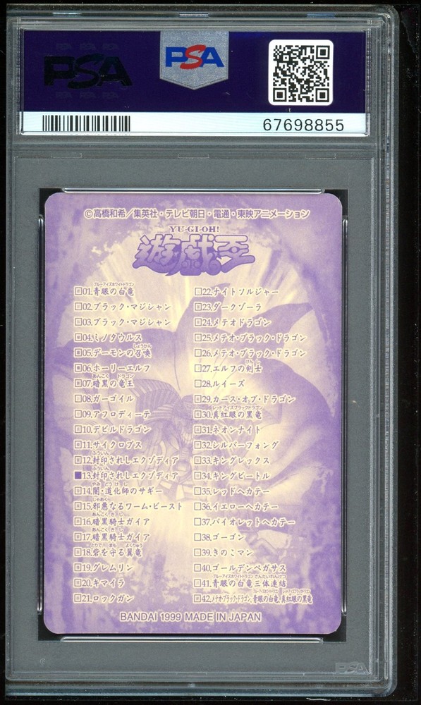 Please Tap See full Description.For shipping requests, please write a note at the time of payment. PSA10 PSA9 PSA8 PSA7 PSA5-6 PSA1-4 Yu-gi-oh Topsun Carddass Get Card Promo Sealdass Scratch Holo Pikachu Charizard Mewtwo Mew Gengar Gyarados Misty 1996-Original Series 1999-Neo 2009-Legend 2013-XY 2016-Sun & Moon 2019-Sword & Shield 1st Check Out Our Store Shipping Payment Returns International For auctions, please pay within 3 days after the end. If you have a request at the time of shipping, please be sure to send a message before purchasing. Please change the address or name registered on ebay to English before making payment. Other languages cannot be shipped (Chinese, Korean, etc.) You cannot select Fedex The shipping method differs depending on the shipping country. If you live in a rural or remote island, you may incur additional charges. If additional charges are incurred, we will send you a separate message. We will ship after you pay. Due to the suspension of shipping by the delivery company, shipping from Japan may suddenly become impossible. In that case, we will refund you promptly. For auctions, please pay within 3 days after the end. Please change the address or name registered on ebay to English before making payment. Other languages cannot be shipped (Chinese, Korean, etc.) We are not involved in the payment of customs duties. When purchasing multiIf you have a request at the time of shipping, please be sure to send a message before purchasing. You cannot select Fedex. The shipping method differs depending on the shipping country. If you live in a rural or remote island, you may incur additional charges. If additional charges are incurred, we will send you a separate message. We will ship after you pay. Due to the suspension of shipping by the delivery company, shipping from Japan may suddenly become impossible. In that case, we will refund you promptly. ple items, add them to the shopping cart and pay in bulk. Users who do not pay will be added to the block list. Please contact the customs office in your country for customs payments.We are not involved in the payment of customs duties. Payment Method Credit Cards Debit Cards Gift Cards Apple Pay Google Pay PayPal PayPal Credit Apple Pay Please check the product immediately upon arrival. If the product is damaged during delivery, please file a complaint with the logistics company. Insurance will be applied. Please take a photo of the damaged product immediately. Do not throw away the packaging material or the slip. If there is a hole or tear in the packaging material, please take multiple photos in all directions before opening it. If you are returning the product due to a defective product, please contact us immediately with photos attached. If the product is defective, please contact us within 2 days of arrival. We will only accept returns within 14 days if you contact us during that period. In order to prevent product replacement, we will not accept returns if more than 2 days have passed since arrival. When returning the product, please use the materials that the product was packed in inside and return it by a shipping method with a tracking number. After receiving the product, check the product and if it is the same as when it was shipped, we will promptly process a refund. Please complain to PSA about defects that are not caused by us, such as PSA's appraisal results or dust in the case. We will not accept returns due to personal reasons. If the item is returned due to reasons caused by the buyer, such as refusal to accept the item or pay customs duties, or the shipping company being unable to contact the buyer, we will only refund the amount minus the cost of round-trip shipping and packaging materials, customs duties, eBay fees, damages due to exchange losses, etc. Minor scratches may occur on the case during storage or packaging. These may not be covered by the warranty. Import duties, taxes and charges are not included in the item price or shipping charges. These charges are the buyer responsibility. Please check with your country customs office to determine what these additional costs will be prior to bidding/buying. These charges are normally collected by the delivering freight (shipping) company or when you pick the item up do not confuse them for additional shipping charges. We do not mark merchandise values below value or mark items as US and International government regulations prohibit such behavior. We hope you will love your purchase, however if you need to return it, we have a 60 day return policy. We hope you will love your purchase, however if you need to return it, we have a 60 day return policy. We hope you will love your purchase, however if you need to return it, we have a 60 day return policy. We hope you will love your purchase, however if you need to return it, we have a 60 day return policy. PSA10 PSA9 PSA8 PSA7 PSA5-6 PSA1-4 Yu-gi-oh Topsun Carddass Get Card Promo Sealdass Scratch Holo Pikachu Charizard Mewtwo Mew Gengar Gyarados Misty 1996-Original Series 1999-Neo 2009-Legend 2013-XY 2016-Sun & Moon 2019-Sword & Shield 1st Other Deals Evangelion Battle Spirits CB21-X04 Asuka Shikinami Langley Test PSA 10 82216185 $138.80 Evangelion Wafer 2010 Embossed 1 VA-03 Rei Ayanami VA03 Japanese PSA 10 82216140 $143.80 Donkey Kong Carddass Country 2 44 Diddy Dixie 1996 Japanese Card PSA 9 82216127 $104.53 Pokemon Japanese Topsun Green Back 008 8 Wartortle Card 1995 PSA 8 68931021 $272.97 Pokemon Japanese Neo 1 Genesis 025 Pikachu 2000 Card 25 70/111 PSA 8 68609514 C $113.96 Pokemon japonais Topsun vert dos 008 8 Wartortle carte 1995 PSA 8 63831086 €161.92 Pokemon Japanese Topsun Green Back 008 8 Wartortle Card 1995 PSA 8 68931021 £136.94 Pokémon Japonais Topsun Vert Dos 008 8 Wartortle Card 1995 PSA 8 68931021 €162.60 Pokémon Japonais Sealdass 1 133 Eievui Prism Eevee 1997 Autocollant PSA 8... €141.40 Pokemon Japanese Topsun Green Back 008 8 Wartortle Card 1995 PSA 8 63831086 $272.97 Pokemon J