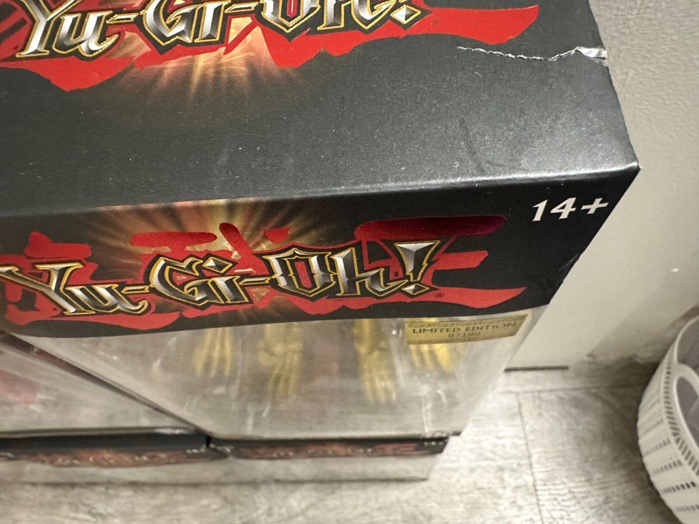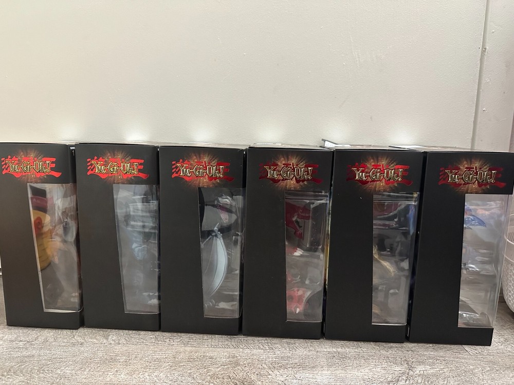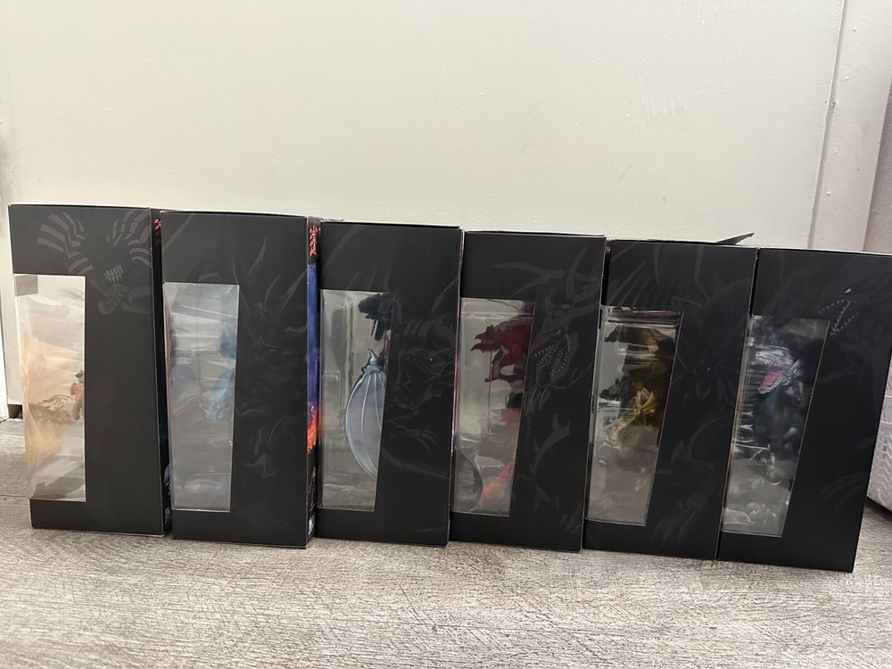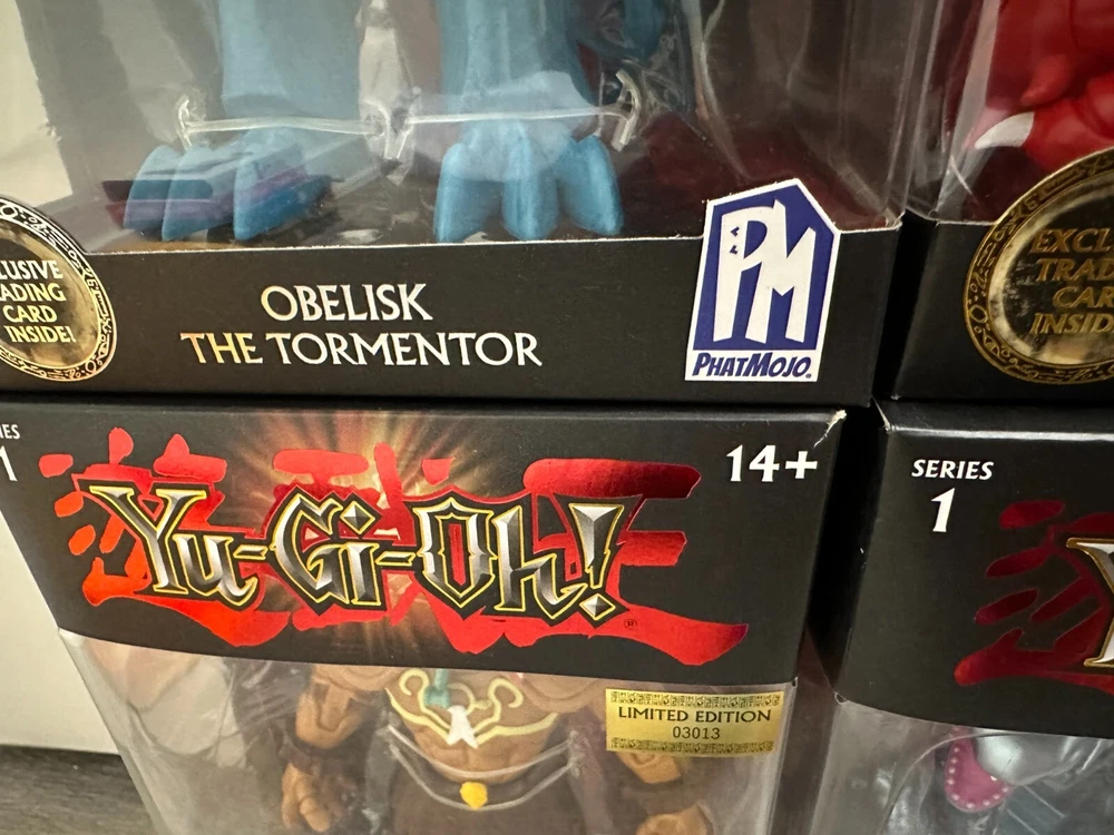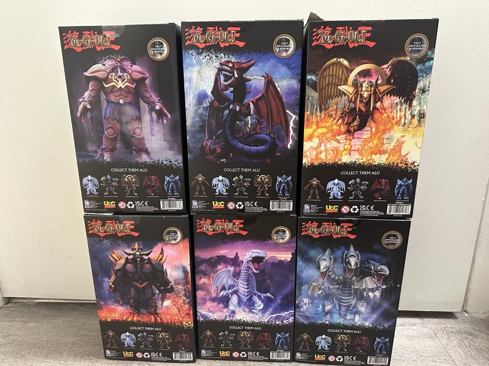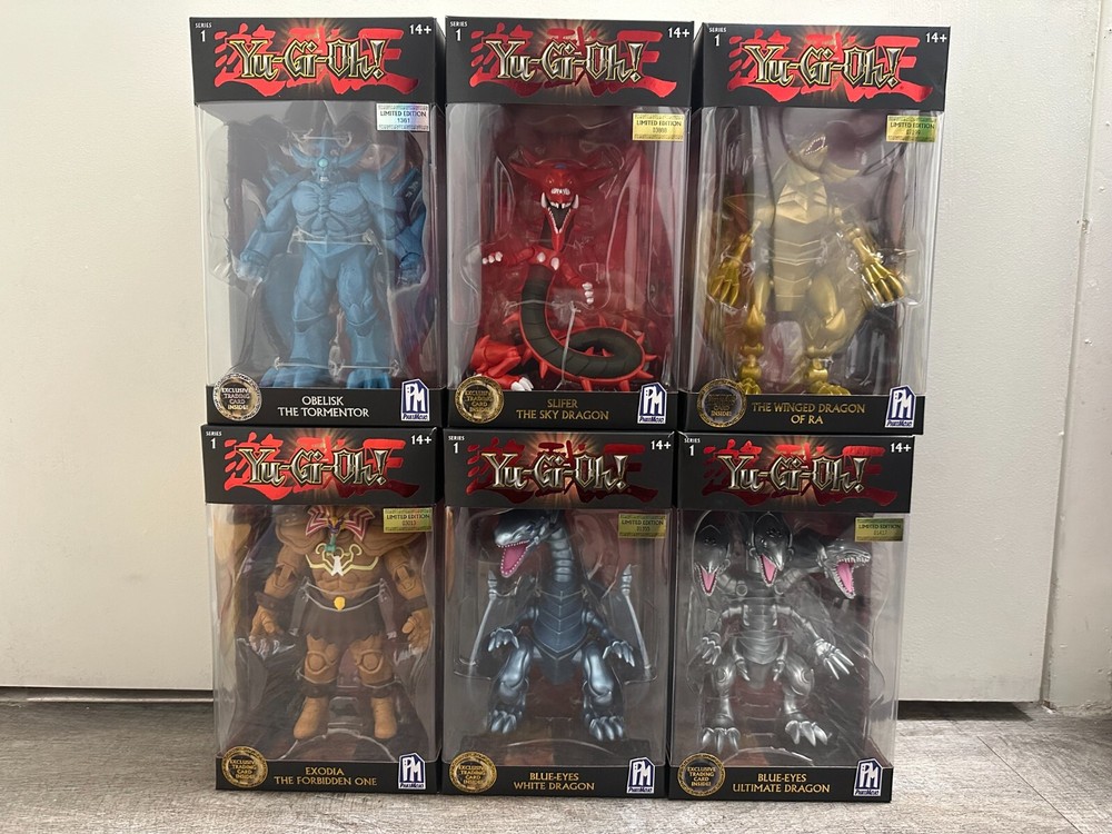 The Yu-Gi-Oh! PhatMojo Series 1 LIMITED EDITION Action Figure FULL SET includes action figures of various characters from the Yugioh TV show, including Blue Eyes White Dragon, Slifer the Sky Dragon, the Winged Dragon of Ra, Obelisk the Tormentor, Exodia the Forbidden One, Blue Eyes Ultimate Dragon. The figures are 7 inches tall, made of plastic, and are part of a limited edition release in the year 2023.