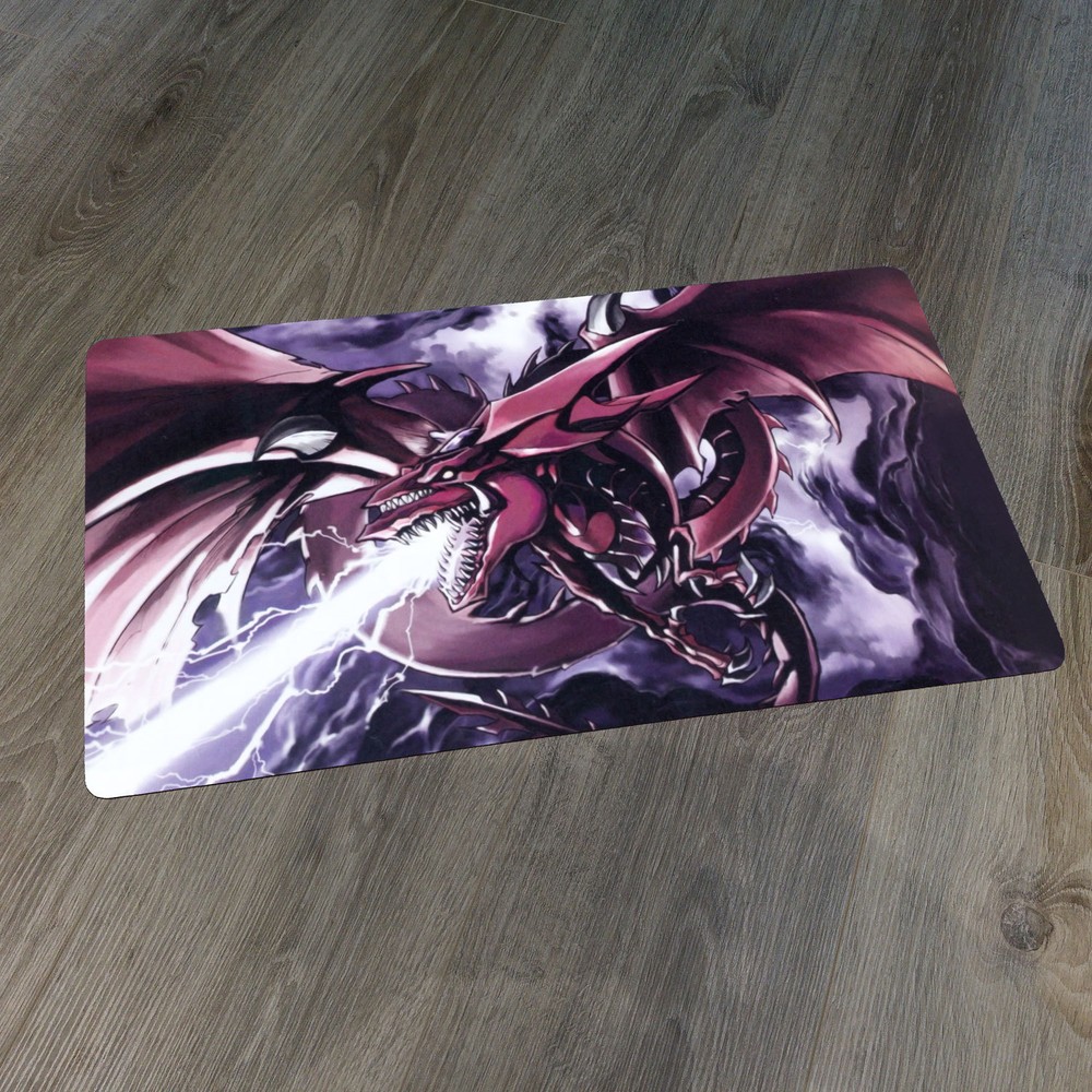 NEW Rubber Backed fabric Mat For Yu Gi Oh - Slifer the Sky Dragon Description: Standard 23x13.5 Inch Fabric Rubber Backed 1.5mm Playmat. The mats are a great addition to the game. Material: Neoprene Rubber Backing on Mousemat type Polyester fabric front Why Our Premium Mats Are So Great! HD Printing with the latest printer and ink technology on an 8 colour printer Water Resist Ultra flexible Non-Slip System Roll-able and lay flat.