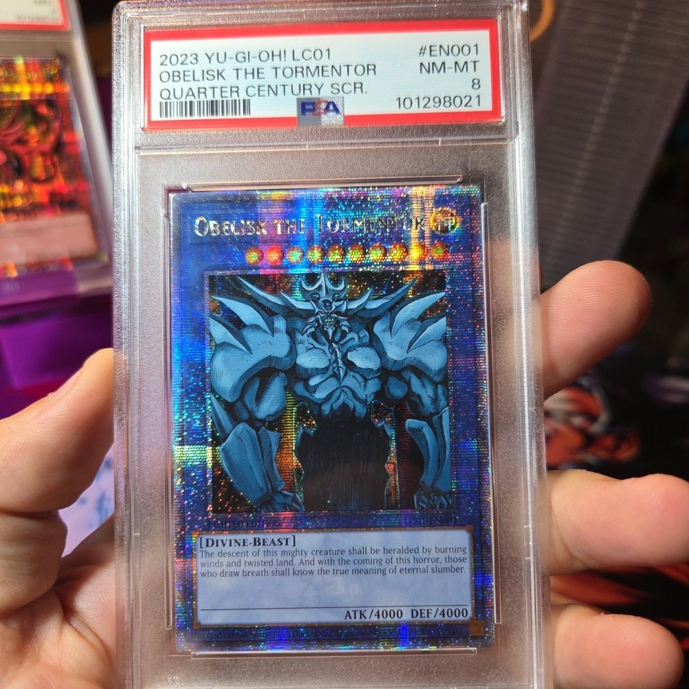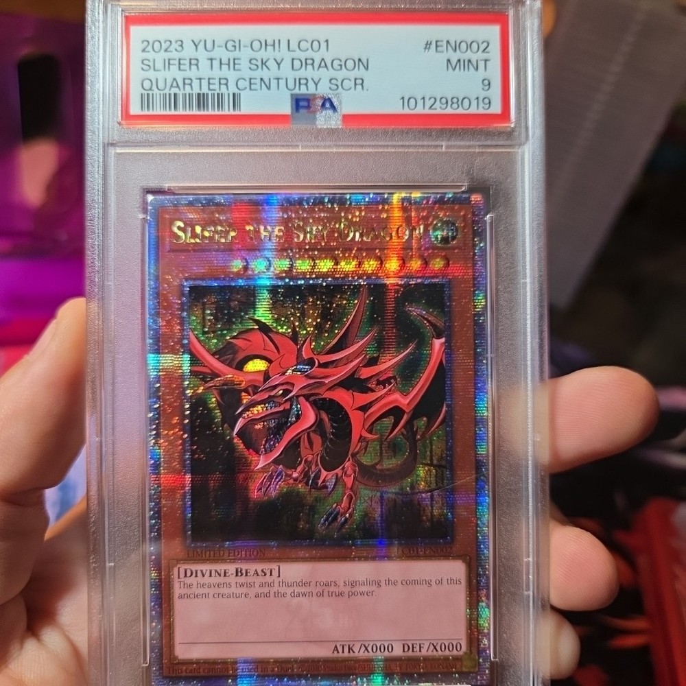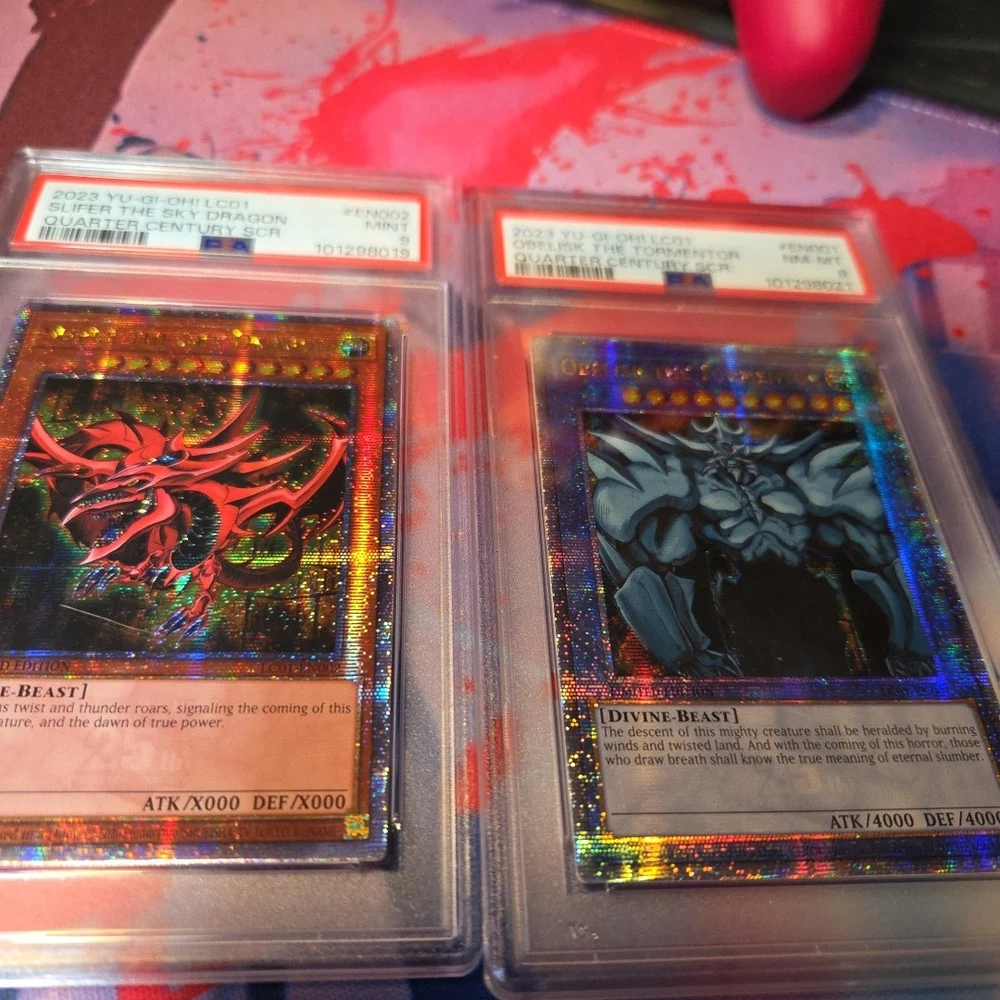Dive into the world of ancient Egyptian mythology with this Yu-Gi-Oh! TCG lot featuring two iconic cards: Obelisk and Slifer the Sky Dragon. Both cards are quarter century rare finds from the classic '- Yugi -' set, a must-have for collectors and duelists alike. They come in standard card size with a stunning holo finish that makes them stand out in any collection. Crafted from quality card stock and manufactured in the United States, these cards are in excellent condition, ready to be the centerpiece of your display or to take on any challenger in a battle. The cards are not autographed and are presented in English, ensuring their accessibility to a wide audience of Yu-Gi-Oh! enthusiasts.