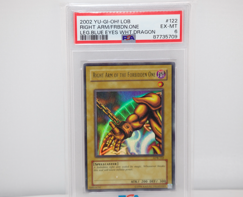 Unleash the power of Exodia with the "Right Arm of the Forbidden One" card, a must-have for any Yu-Gi-Oh! enthusiast. From the iconic Legend of Blue Eyes White Dragon set, this Ultra Rare - Unlimited MP card is a formidable addition to your deck, featuring the dark and mystical creature that strikes fear into the hearts of your opponents. Card Number LOB-122, this piece boasts an attack power of 200 and a defense toughness of 300, ready to tip the scales in your favor. Crafted in the United States, its holographic finish captures the essence of the character's dark majesty, making it a standout in any collection. Suitable for ages 6 and up, it's a timeless piece for both young duelist and seasoned player alike.
