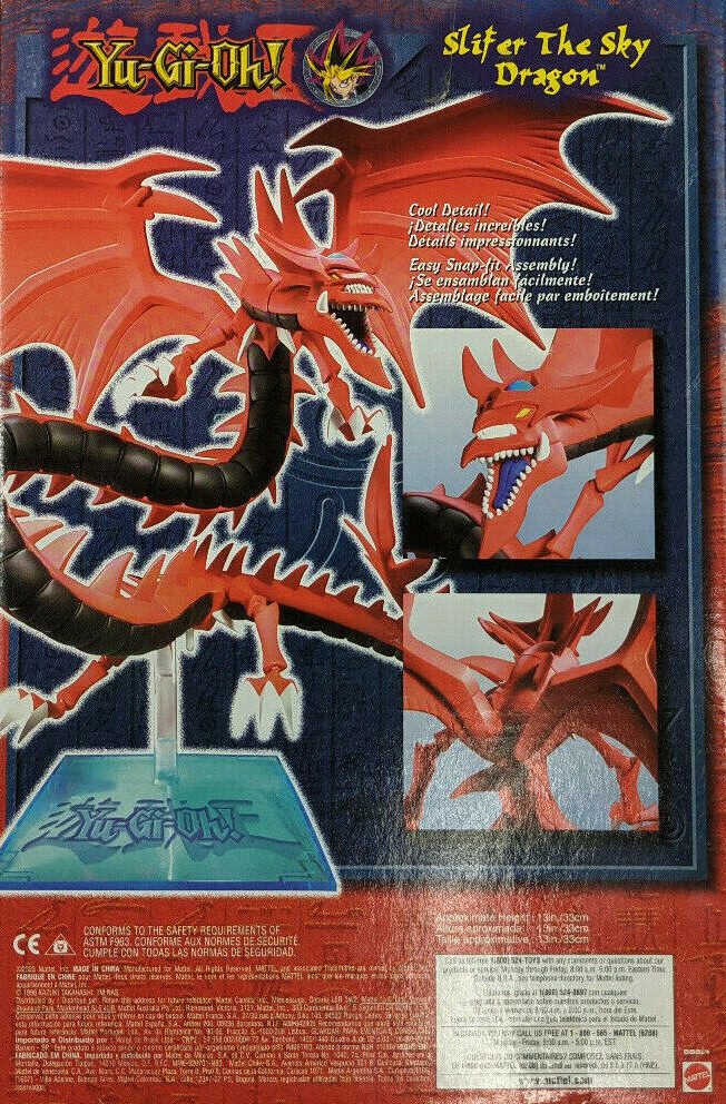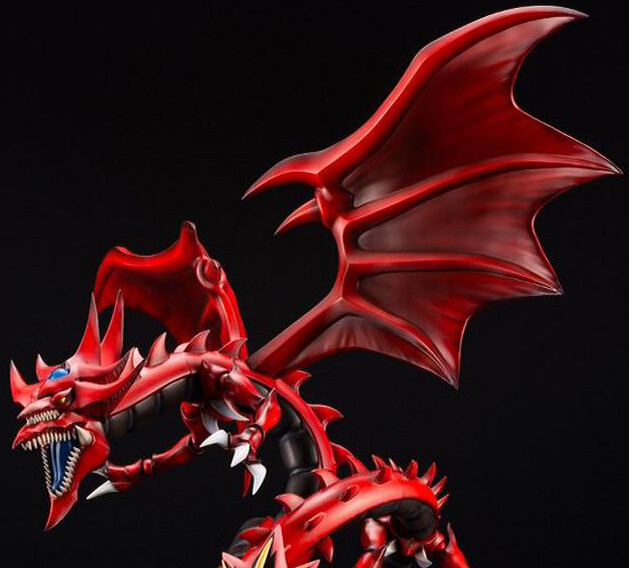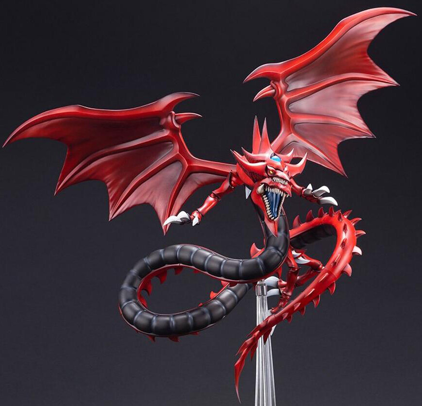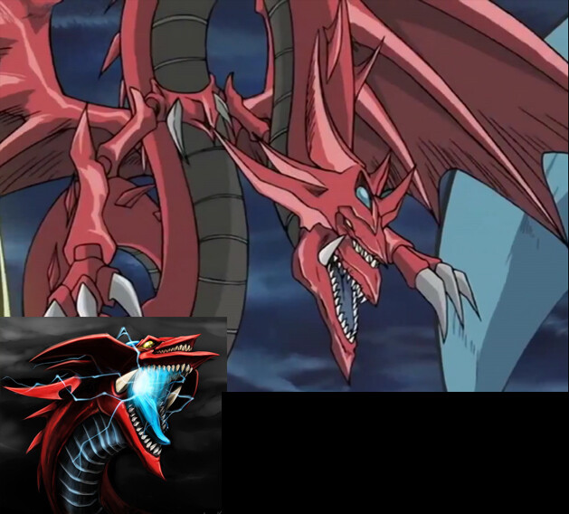 Slifer is a large, serpentine red-skinned, black-bellied dragon with spikes running down its body. Its wings are bat-like in form, with two thumb claws. Slifer's head has two mouths; the bottom jaw of the smaller top set is part of the top jaw of the larger set. The last tooth at each cheek is larger than the others. Slifer's head is crested with four spikes protruding horizontally, and two larger ones from the back of the head curving vertically; the sapphire common to the Egyptian Gods is nestled at the front of the crest. Its tail crest is shaped in a similar manner, but with a single flattened spike at the tip rather than two spikes. Slifer has short limbs with three-toed feet. It is the only Egyptian God whose appearance remains constant in the anime between the present and the Memory World arc.