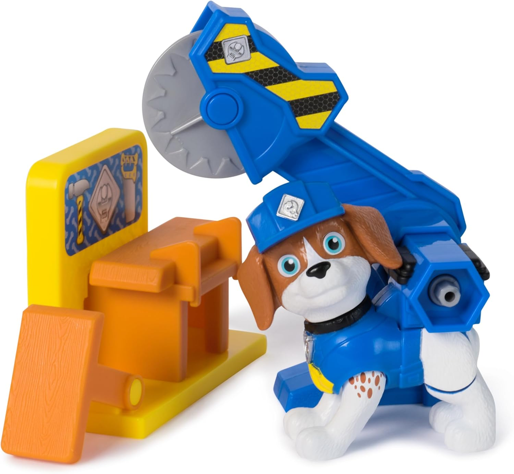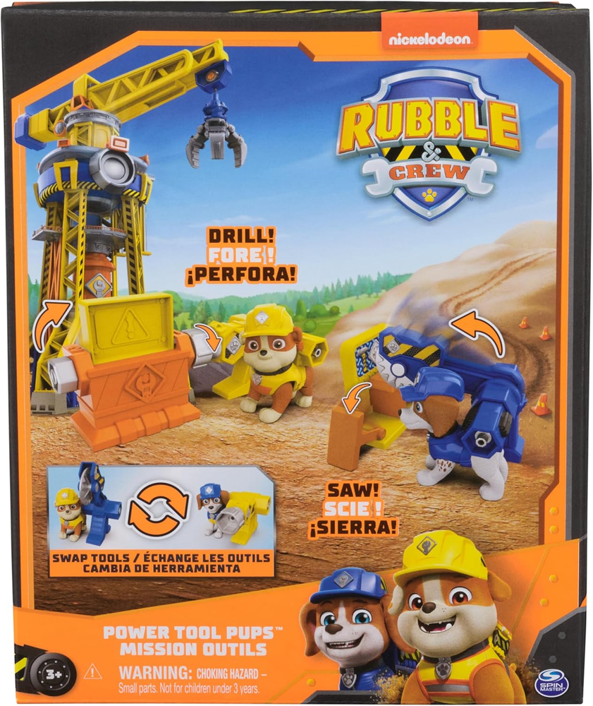 Rubble & Crew Power Tool Pups Rubble & Wheeler Figures & 2 Building Accessories FIGURES WITH BUILT-IN TOOL DRIVERS: Set comes with Rubble & Wheeler toy figures that are over 2 inches tall and feature built-in tool driver backpacks that engage when you push the pups downward 2 WORKING CONSTRUCTION TOYS: Attach the impact drill or chop saw to the pups, then push the pups downwards to operate the barricade sign & chop table for exciting pretend play construction adventures GENUINE PAW PATROL TOYS: There’s a world of Rubble & Crew construction toys & building toys to collect, like construction truck toys & kids gifts for endless adventures (each sold separately) COLLECT THEM ALL: For even more fun and excitement, bring home all the Rubble & Crew building toys, construction trucks, action figures and stuffed animals to create endless playtime adventures LEARN THROUGH PLAY: Rubble & Crew preschool toys and sensory toys are great gifts for kids that love pretend play construction Kids will develop their fine motor skills and imagination while playing Includes: 2 Deluxe Figures, 2 Construction Tools, 2 Construction Accessories Get ready to "Bow-Wow Build" with your favorite PAW Patrol pup, Rubble and his pal Wheeler in the Power Tool Pups action figures set! This dynamic duo comes equipped with built-in tool driver backpacks that activate by pushing the pups downward. Your little builder can enjoy realistic construction fun with a working impact drill and chop saw, complete with construction accessories. Turn the knob to raise & lower the barricade sign, using the impact drill, and use the chop saw to split the chop table in half—just like in a real woodworking shop! This set sparks imaginative play & lets your child join Rubble and Wheeler on exciting construction adventures! For even more exciting ways to play, look for all the Rubble & Crew construction truck toys, toy figures and playsets with Kinetic Build-It sand, to expand your world of construction toys, plush toys, sensory toys & building toys that are designed to give kids and parents an opportunity to build, play and learn together! (each sold separately)