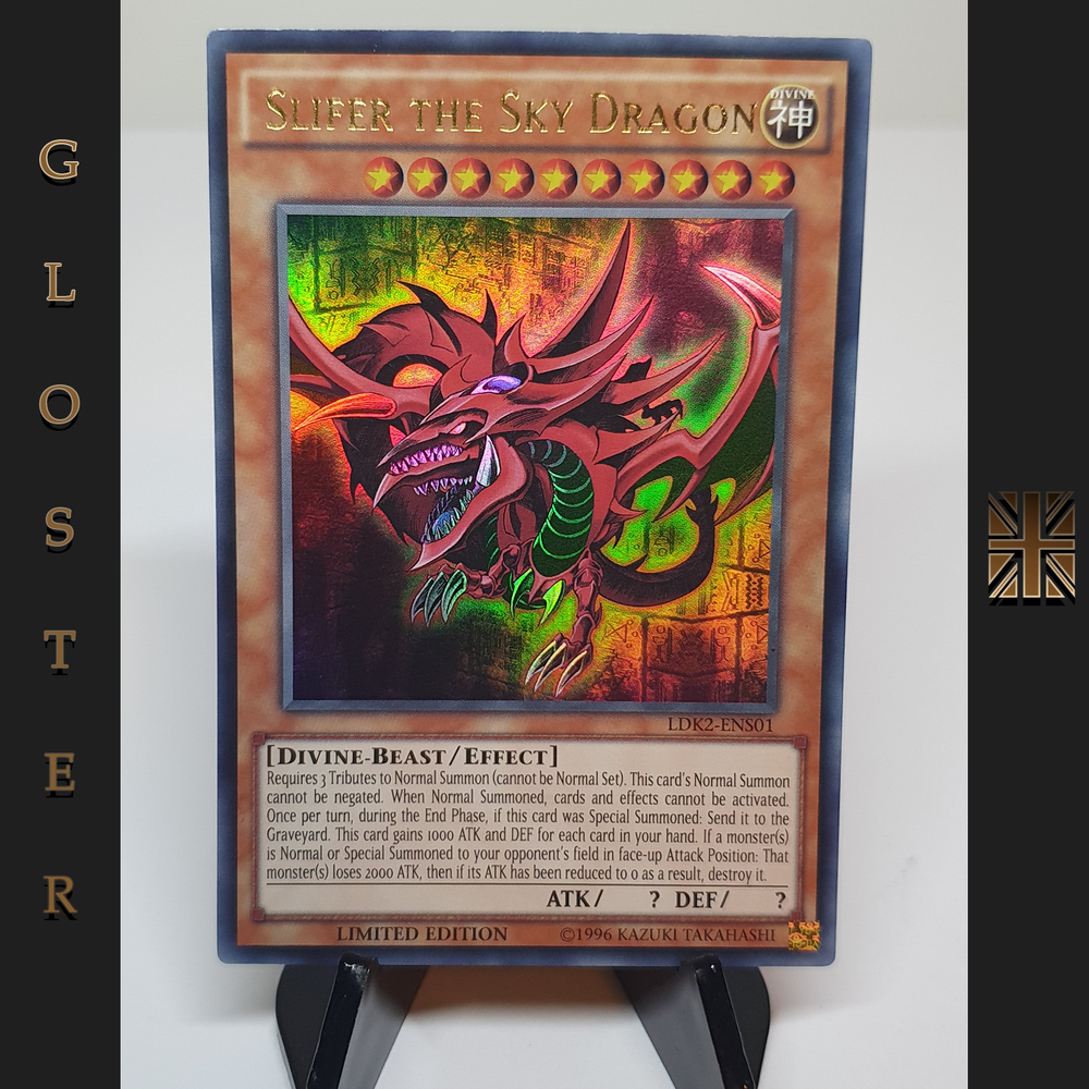 Yu-Gi-Oh Slifer The Sky Dragon - LDK2 ENS01 - NM - Lim - Ultra Rare. Three Near Mint examples of this card, sold seperately. Dispatched Royal Mail 1st class in a card backed envelope within a clear, quality, sleeve. Please read below for the definition of card conditions. M / Mint – The card is in perfect condition, only cards that would, in good confidence, could graded 9 or 10 by PSA will receive this grade. NM / Mint – The card is in excellent condition. Minor surface scratches or very slight edge or corner wear could be present. The card will be free of all creases, indents, serious scratches, scuffing and dirt / foreign blotches. These cards are typically only provided with two photos. LP / Light Play – The card displays signs of play. Edgewear, minor creasing and indents may be present in very limited numbers (all indents and creases will be photographed and included). Grime may be present on the card, but it will be free of any foreign marks. MP / Moderate Play – The card displays obvious signs of play. Multiple creases may be present (again, photographic evidence will be provided) moderate edgewear may be present. HP / Heavy Play – these cards are considered to be damaged outside the degradation of regular play. Multiple creases that can be severe as well as serious edgewear, serious indentations, scratching, water damage and foreign markings may be present.